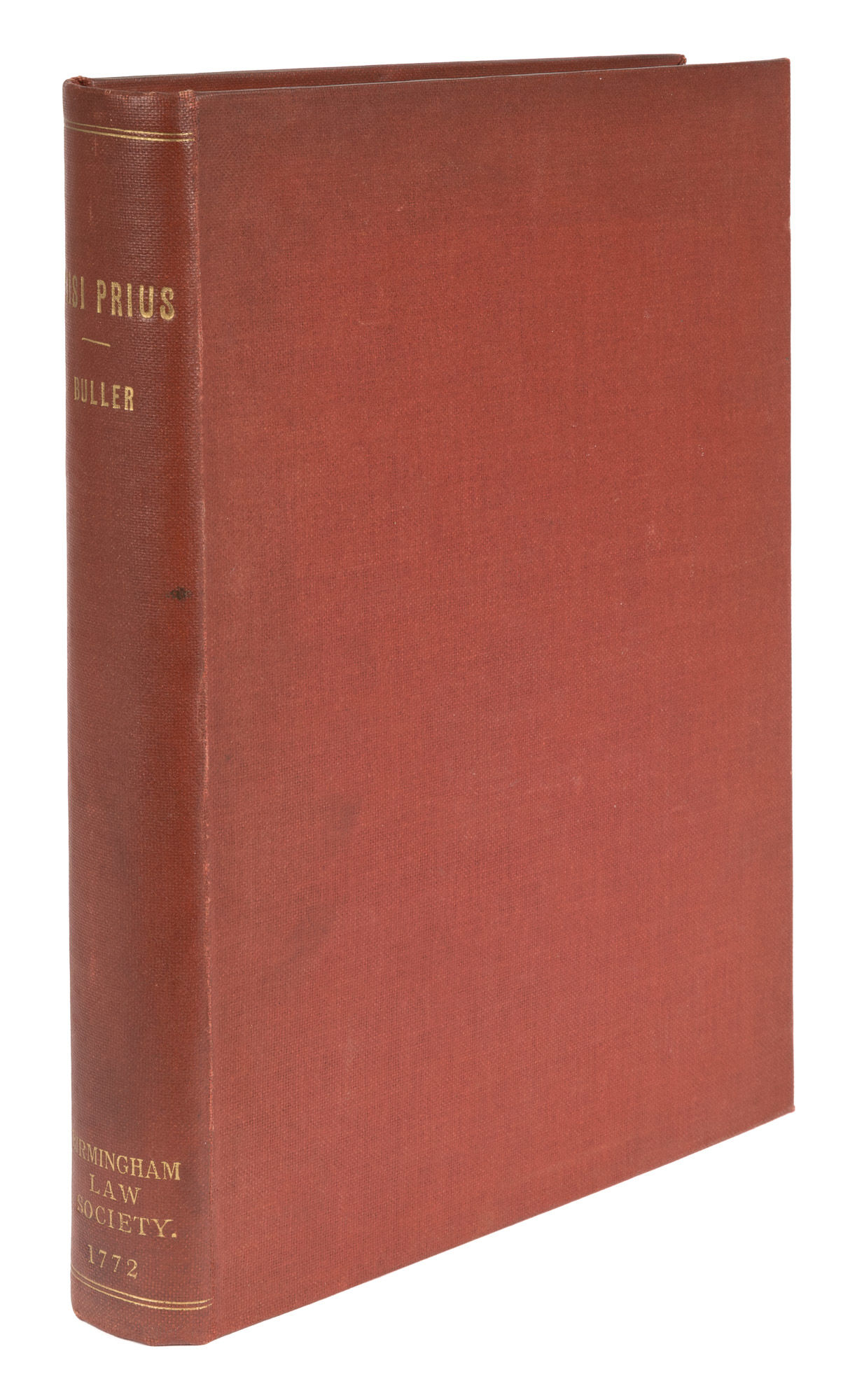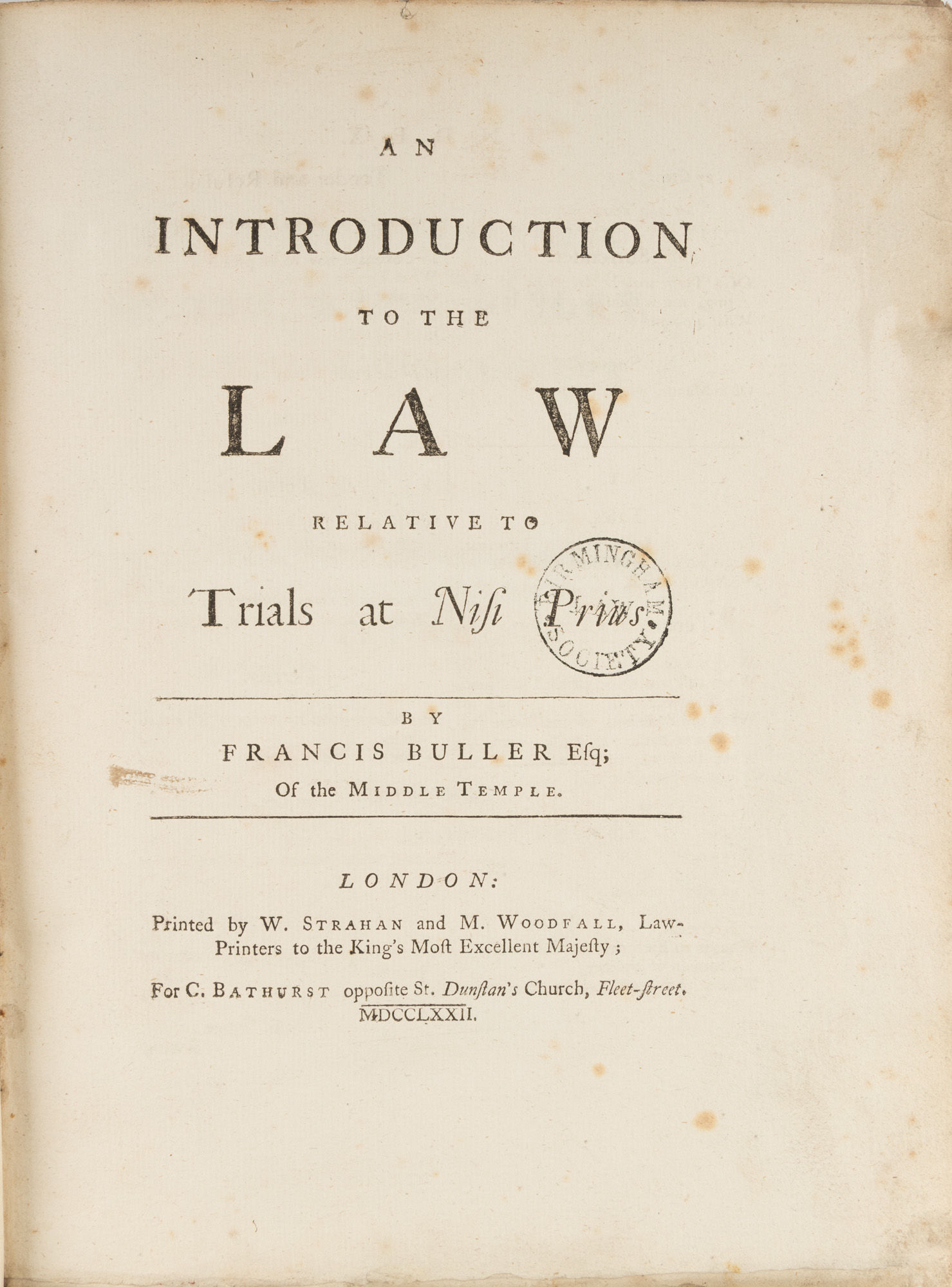 1772. Buller's Guide to the Circuits [C] [Buller, Sir Francis [1746-1800]. An Introduction to the Law Relative to Trials at Nisi Prius. London: Printed by W. Straham and M. Woodfall, 1772. vii, [1], 330, [42] pp. Quarto (10-1/2" x 9"). Later library cloth, gilt title, publication date, library name and fillets to spine, untrimmed edges, endpapers renewed. Light rubbing to extremities, front hinge starting, library bookplate and small shelf label to front pastedown. Moderate toning to interior, light foxing to a few leaves, small library stamps to title page and a few other leaves. $350. * Second edition. First published in 1767, Buller's treatise on trial practice in rural places is derived from a collection of trials by his uncle, Bathurst, who is sometimes listed as the author. The second edition is considerably enlarged with original material. A standard work for decades, it went though several reissues and seven editions, the last in 1817. Writing in the late 1840s, Marvin notes that it was "still useful because it contains some authorities not elsewhere to be met with.": Marvin, Legal Bibliography (1847) 158. English Short-Title Catalogue T101058.