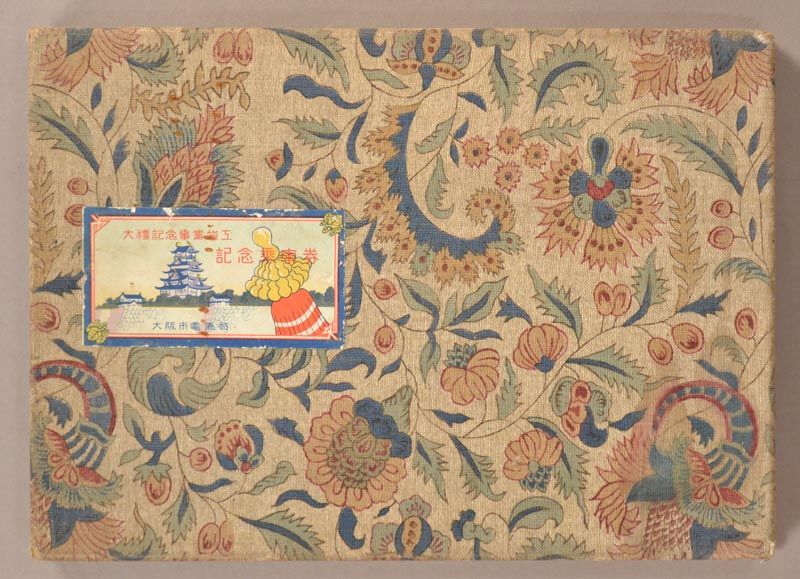 1915. [Matchbook Label Album] [Rinpyō 燐票]. Taisho, Showa era. 1915-early post-War. 18.2 x 25.5cm orihon folding album with floral fabric-covered boards and color printed label on front board. Cover label has a design of Osaka Castle with Japanese text (大禮記念事業) that is the name of an Osaka commemorative event that could b referring to the restoration of the main tower of Osaka castle that was c. 1931.