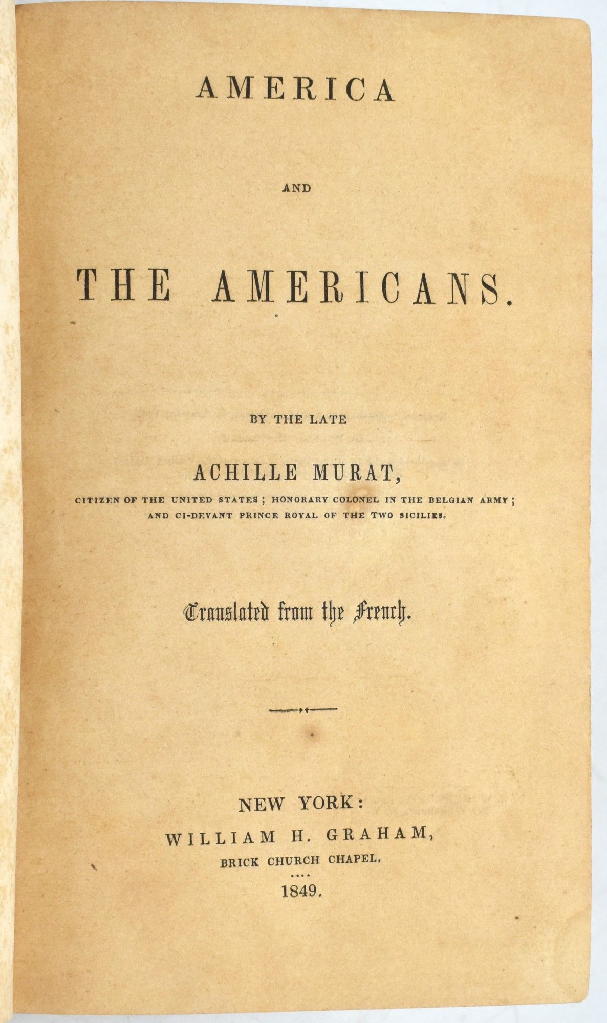 New York: William H. Graham, 1849. First American Edition. Hard Cover. Very Good binding. 8vo.; in the publisher's brown embossed cloth with titling in gilt to the spine; [2] preliminary leaves, vii, [9]-260 pages; with no ownership or other marks of any kind; the endpapers have been cleaned by a conservator.~~The First Edition in English of Achille Murat's interesting account of traveling in the Southern States during the first part of the 19th century. ~~"Although Murat considered himself an American, he was ... so recent an arrival in this country that his work should be be regarded as that of a traveler. As the title would indicate, it is a philosophical account of American institutions, including political parties, the frontier, slavery, Indians, religion, law and justice, the army and navy, finance, manners, fine arts and literature...No itinerary is mentioned, but it is evident that the author's experiences and contacts had been largely in the South."~~An excellent copy of this forthright account of American manners, politics and history. This First Edition uncommon in commerce. (Clark, Travels in the Old South, pages 66, 67). Very Good binding.