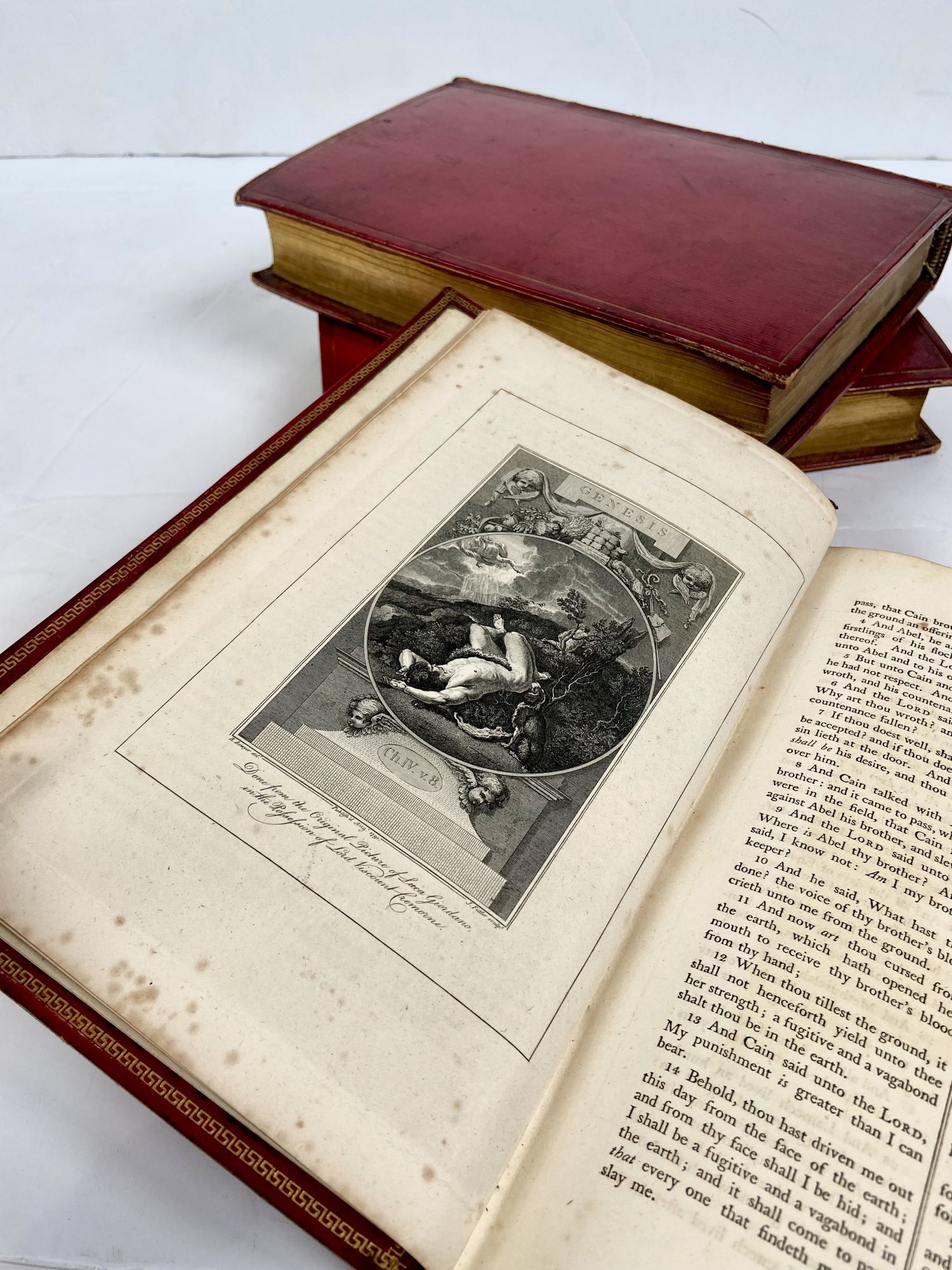 London: published by R. Bowyer, Historic Gallery, Pall Mall, & J. Fittler, No. 62, Upper Charlotte Street, 1795. Hardcover. Quartos, 3 volumes; VG; bound in contemporary full straight-grain red morocco, spines with gilt ruling and titling; gilt dentelles; all edges gilt; some mild rubbing and wear, primarily to hinges and spines; Henry Bowen's bookplate to front pastedowns;