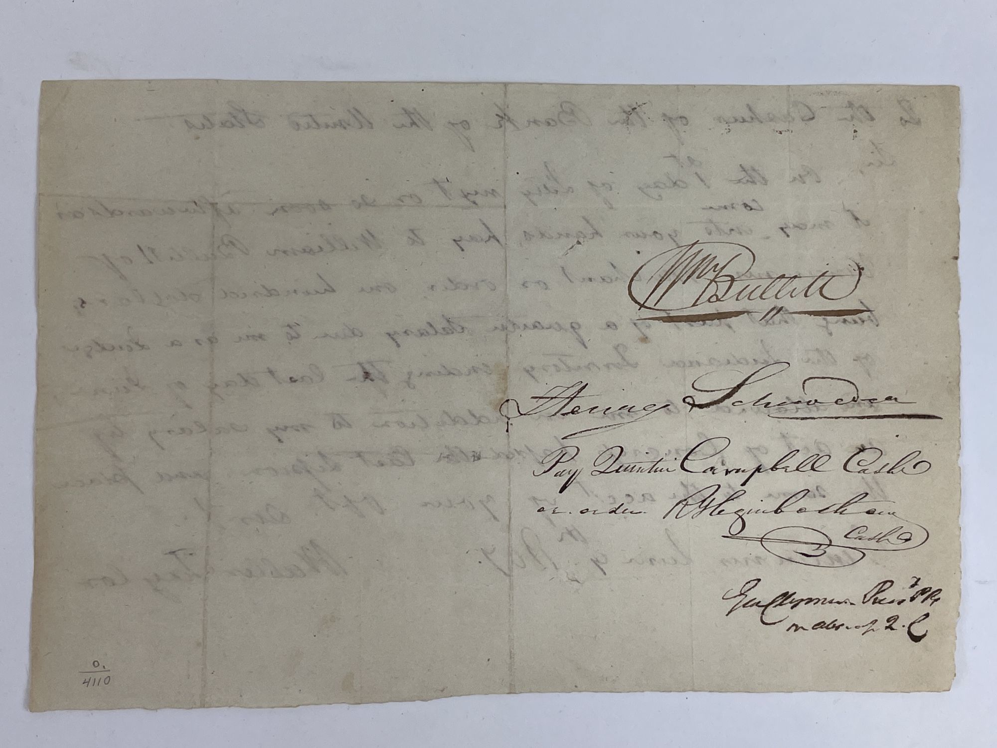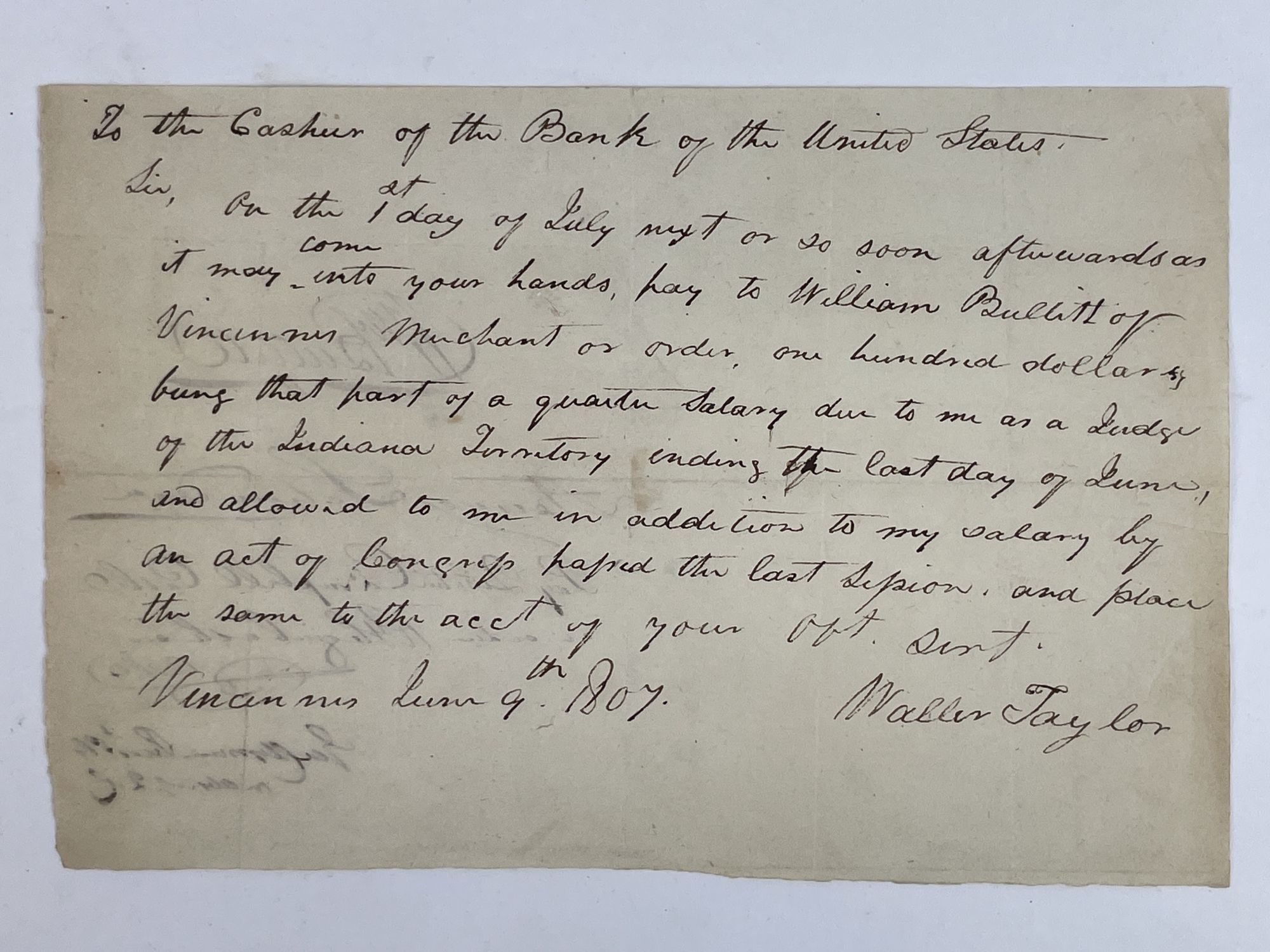 1807. Other. Autograph note signed by Waller Taylor and made out to the cashier of the Bank of the United States directing that his salary be paid directly to a merchant named William Bullitt. One page on one sheet of paper. Light wear to left and bottom edges and faint creasing from folding. The verso bears the endorsement of Bullitt and several others. Condition: Good Plus; Dimensions: 8" x 5.25". RW Consignment. Shelved in Oversized Ephemera. Signature Belonging To: Taylor, Waller