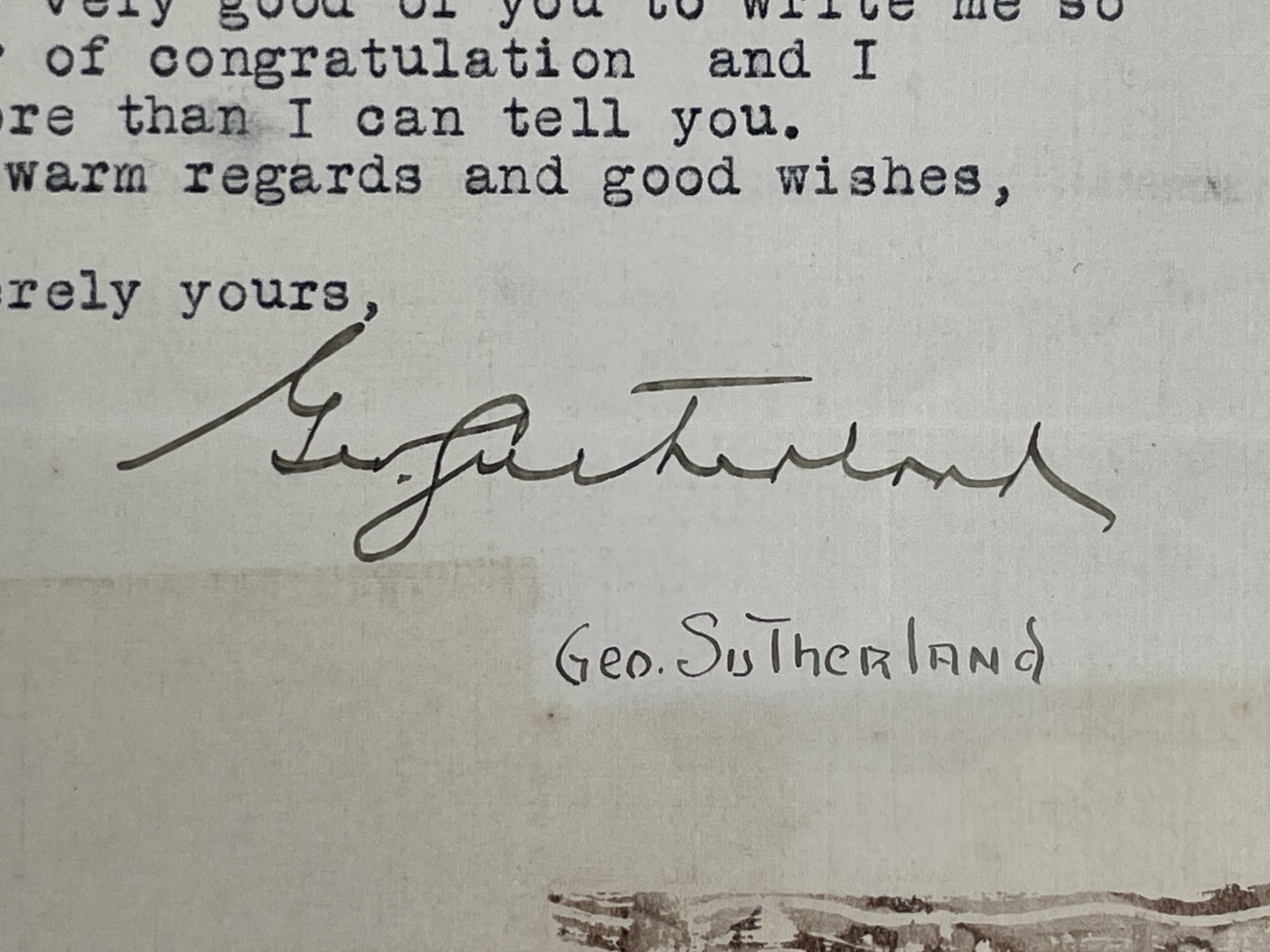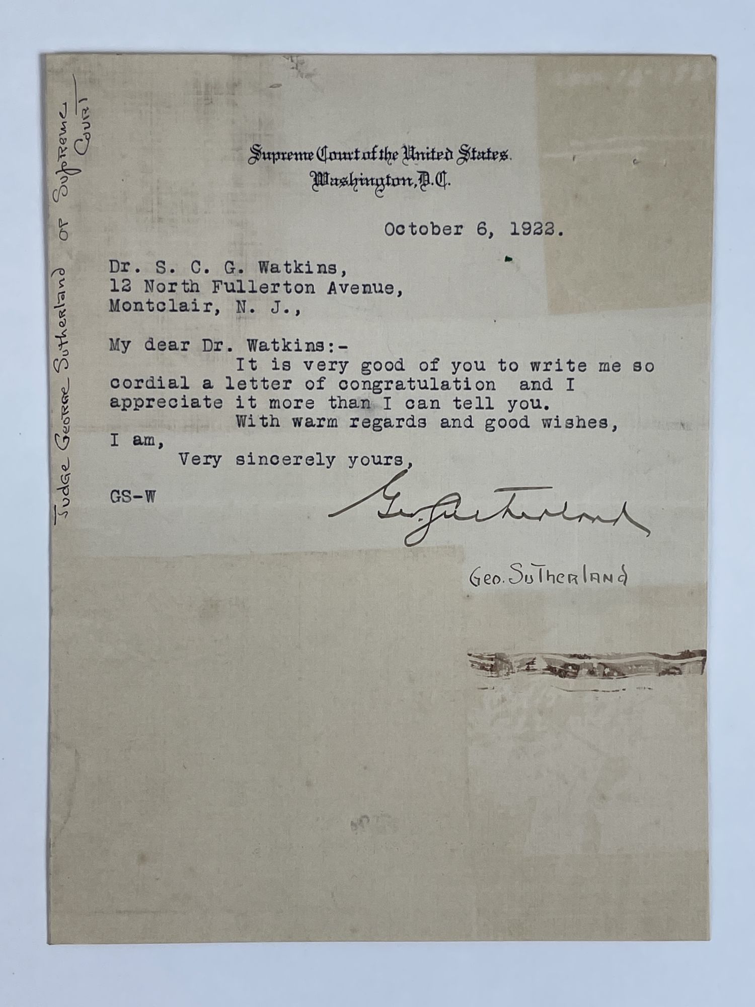 One page letter, typed, from Associate Supreme Court Justice George Sutherland. Eventually to be numbered among the infamous "Four Horsemen", Sutherland writes to thank Watkins for his words of congratulations following his recent confirmation and appointment to the Supreme Court (on October 2, 1922). On "Supreme Court of the United States" stationery, and signed in ink at the signature line: "Geo. Sutherland" 1353482. Special Collections.