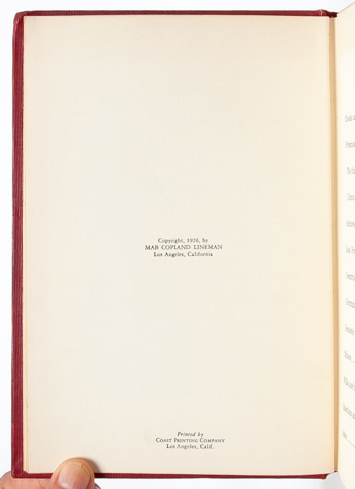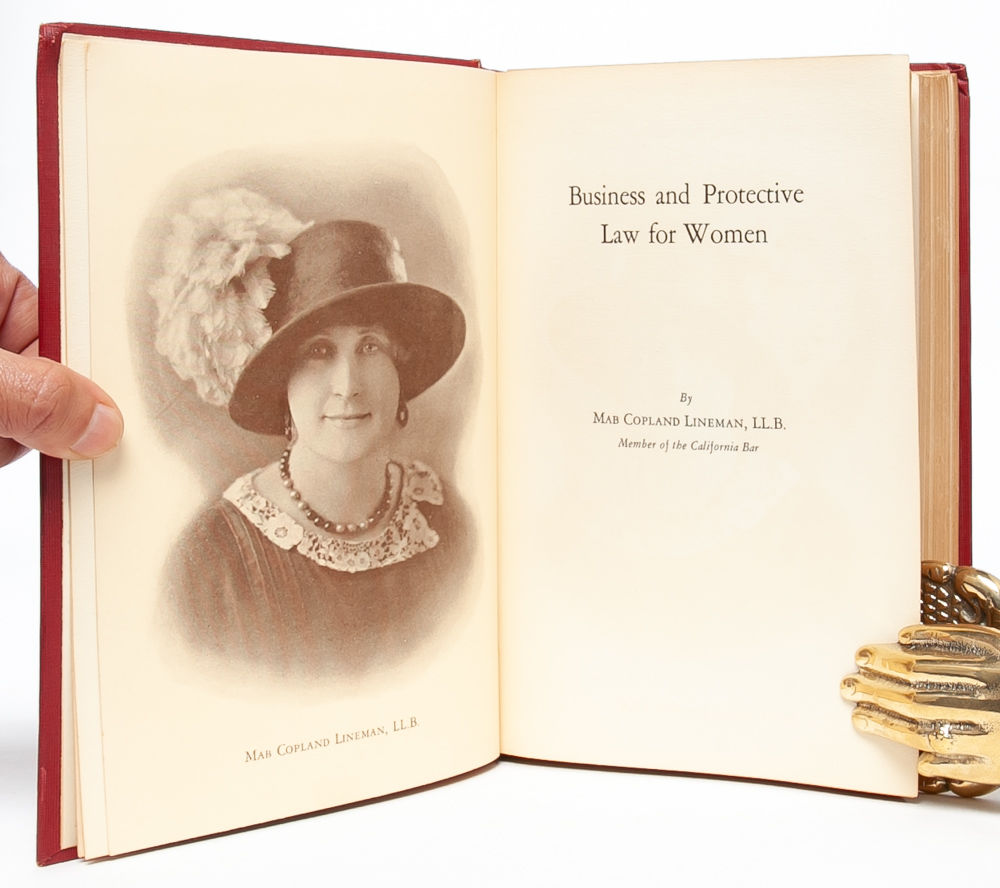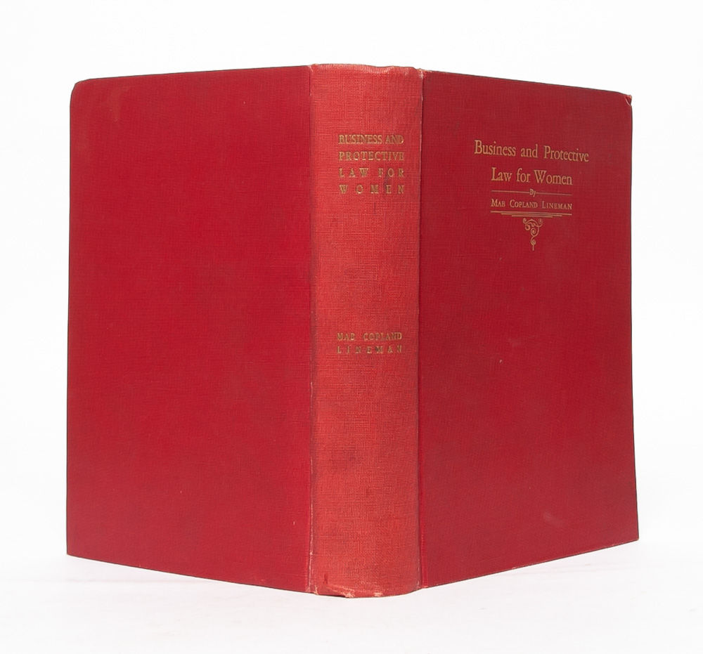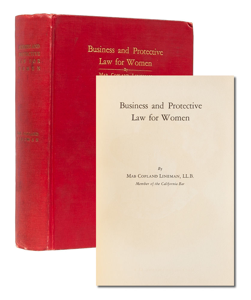 An attorney specializing in business and protective law, Mab Copland Lineman was committed to using her expertise to assist women in developing fiscal and employment security. Admitted to the Los Angeles Bar in 1917 -- two years before the 19th Amendment granted US women the right to vote -- she became a popular lecturer at the University of California and the first state chairman for the Business and Insurance California Federation of Women's Clubs. A news report from 1927 declares of one of her lectures, "It was a revelation that law, a subject supposed to be dry as dust, could be so enlivened and painted in such magic colors...But Mab Copland Lineman bears a charmed tongue...The value of the study of the law was explained as teaching not only the rights of others, but the gifts of analysis and expression. Mortgages and trust deeds were defined and explained as were separate and community property and the rights of husband and wife, as such, under California laws" (Santa Anita Register). Near the time of this book's publication, she was serving as the attorney for female teachers in Los Angeles as they worked toward securing wage increases, retirement accounts, and other benefits already secured by their male colleagues; and she was the president of the Women's Breakfast Club, which assisted in job training and provided childcare for working women. Business and Protective Law for Women was part of her effort to educate the women of California about their rights (and the limitations of their rights) in a political climate that had undergone much fluctuation. Though California women had gained the right to vote in state and local elections prior to the 19th Amendment, 1920 brought great changes to their property ownership, employment, and custody rights. Unable to consult a lawyer on all issues, women needed a reference guide that walked them through everything from writing and depositing checks, composing property purchase agreements, and inheriting from or composing wills. "This book is not designed or intended for use by lawyers," she writes in the preface, "nor is it intended to make lawyers of the women who read it." Rather, offputting and confusing terms have been simplified, familiar terminology has been deployed, and Lineman's aim was to aid California women in positioning themselves as well as possible in the modern world.