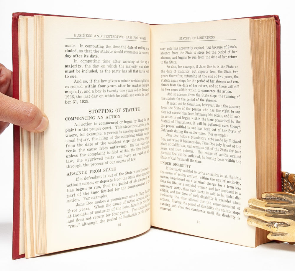 Los Angeles: Coast Printing Company, 1926. First edition. Near Fine. Second issue, with the Laws Becoming Effective July 29, 1927 tipped in behind the contents leaf. Original publisher's cloth binding with gilt to spine and front board. A touch of sunning to spine; front board slightly bowed. Contemporary ownership signature of Mabel Scudder to front endpaper else fresh and unmarked internally. A pleasing copy of this important post-suffrage reference book, written by a woman who lectured extensively at universities in Southern California and was invested in helping newly enfranchised women navigate the landscape of business and property ownership. Scarce in institutions and the trade, this is the only first edition copy on the market.