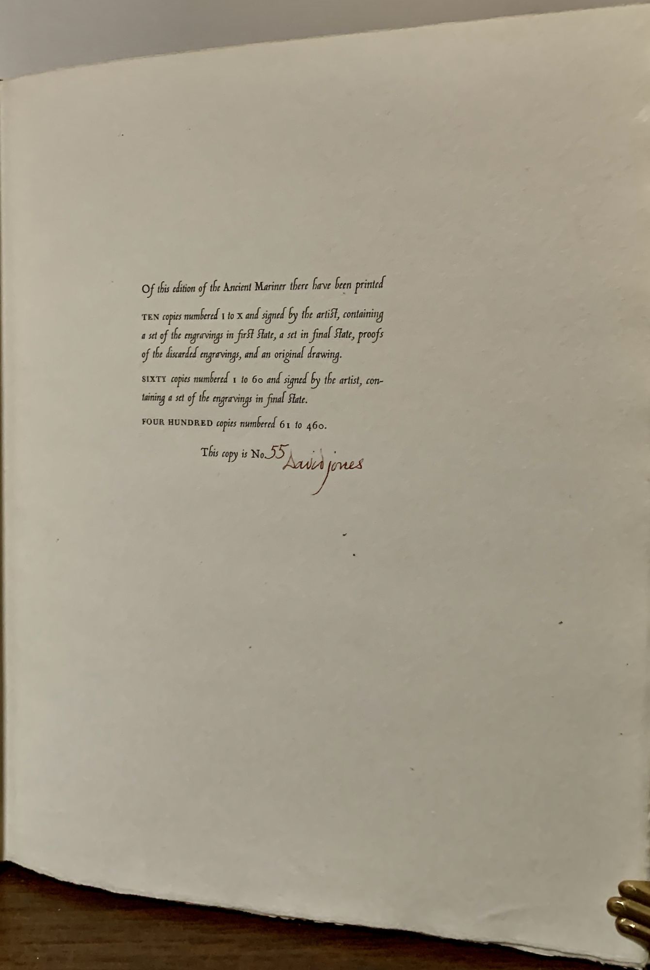 Bristol: Douglas Cleverdon, 1929. Hardcover. Orig. beige cloth backstrip lettered in gilt. Teg. Very good. Jones, David. 37 pages. Folio, 33 x 26 cm. One of sixty copies numbered copies with an additional suite of plates signed by Jones on the colophon. Total edition, copy 95 of 400. Jones, a friend and contemporary of Eric Gill converted to Roman Catholicism, the two spending three years (1924-1927) at Gill's home in southern Wales after both worked together at the Guild of St. Joseph and St. Dominic in Ditchling, Sussex. THE ARTIST AND THE BOOK 136. "Jones usually favored wood, rather than copper engravings......He also designed the device of the Golden Cockerel Press." Wide text margins, interior contents very fresh and clean, covers dusty.