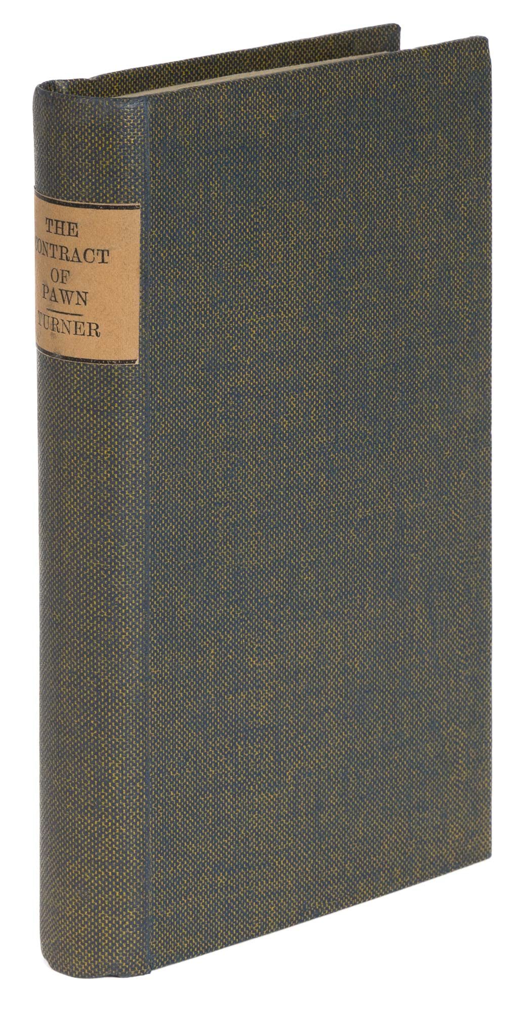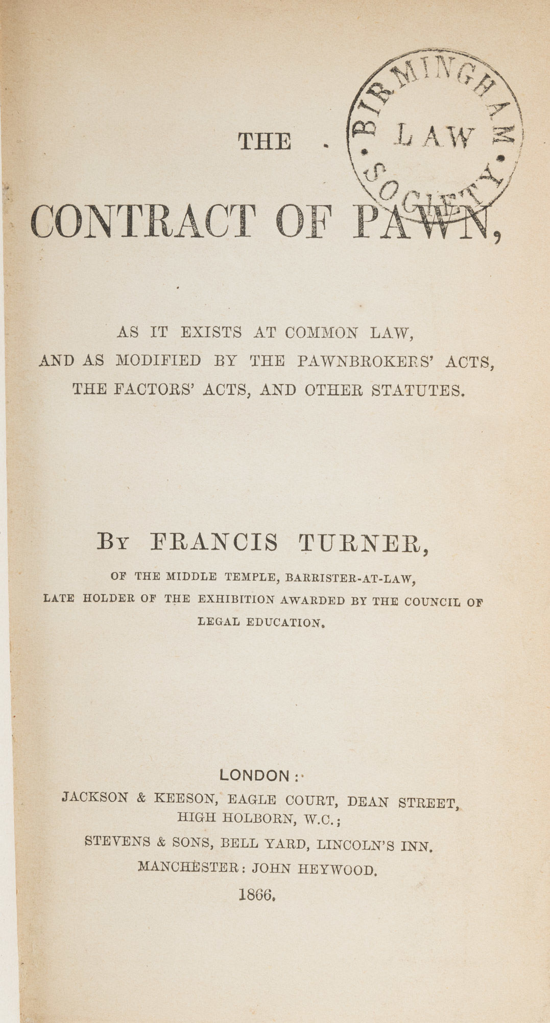 1866. London: Jackson & Keeson, 1866. London: Jackson & Keeson, 1866. Interesting Legal Study of Pawnbroking Turner, Francis [1829-1885]. The Contract of Pawn as it Exists at Common Law, And as Modified by the Pawnbrokers' Acts, The Factors' Acts, And Other Statutes. London: Jackson & Keeson, 1866. xvi, 352 pp. 12mo. (7" x 4"). Recent cloth, printed paper title label to spine, endpapers renewed. Moderate toning to interior, underlining to a few passages, library stamp to title page and a few other leaves. $500. * First edition. A historically grounded work by a Middle Templar, this treatise surveys its subject from Roman law to the work of such jurists as Sir William Jones and Justice Joseph Story. A second edition was issued in 1883. Both editions of this work are scarce. OCLC locates 4 copies of the first edition in North American law libraries (UC Berkeley, U.S. Supreme Court, University of Minnesota, University of Pennsylvania). Sweet & Maxwell, A Legal Bibliography of the British Commonwealth 2:362.