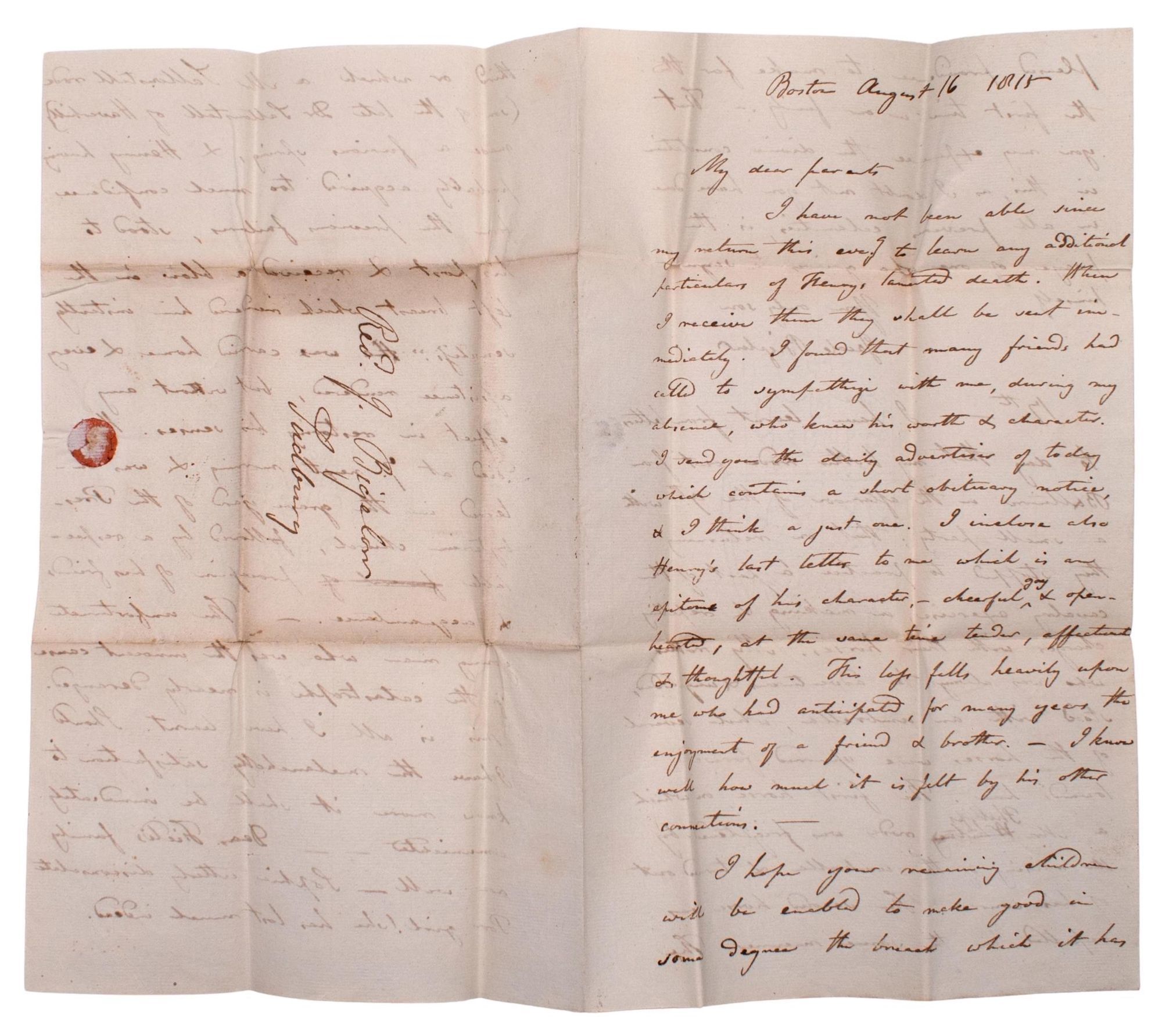 Boston, 1815. 3pp., with integral address leaf. 4to. Usual folds. 3pp., with integral address leaf. 4to. Bigelow (1787-1879), noted early American physician and botanist. After studying under Benjamin Smith Barton and practicing with James Jackson, Bigelow was appointed professor in materia medica and botany at Harvard. In 1817 he began to publish his monumental three-volume American Medical Botany, noted as the first American book with color printing.