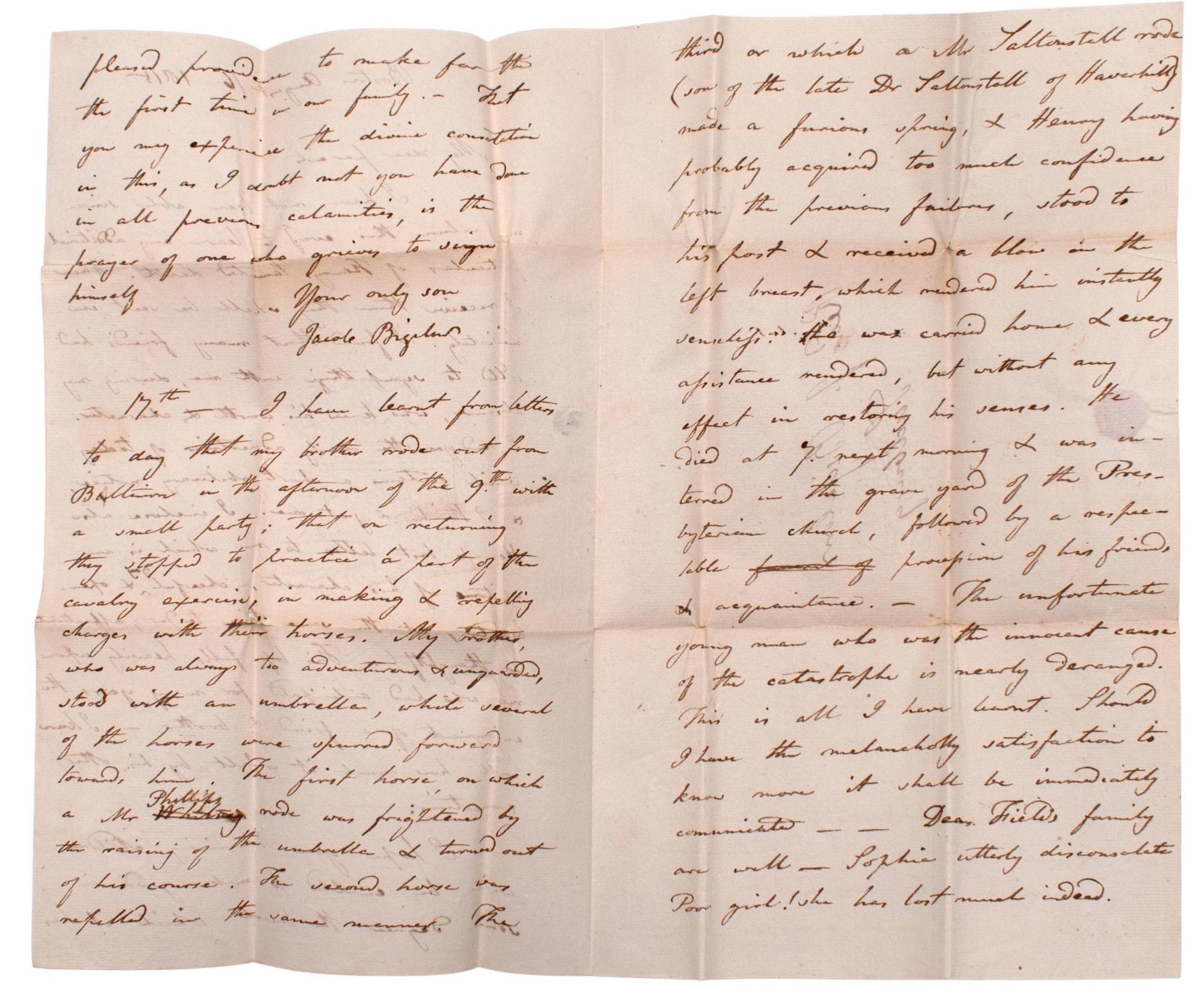 In a lengthy postscript in this letter to his parents in Sudbury he details the death of his brother Henry in a military training accident during a cavalry execise near Balitmore in which Henry was attempting to stop a charging horse with the opening of an umbrella, but was struck in the chest "which rendered him instantly senseless. He was carried home and every assistance rendered but without any effect in restoring his senses. He died at 7 next morning and was interred in the graveyard of the Presbyterian church..." In 1818 Bigelow would name his son Henry.