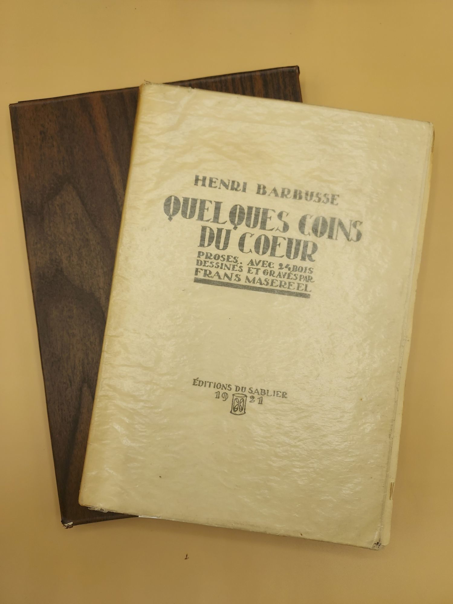 Geneva: Éditions du Sablier, 1921. Limited Edition. Paperback. Very good. 92pp. Octavo [23 cm] Printed wraps. With the publisher's glassine wrapper (title written in faint pen on spine of wrapper). In the slipcase decorated with paper imitating wood grain. Slipcase has just a tiny chip near the foot of the spine, and a previous owner has neatly mounted cutout letters spelling the names of both Barbusse and Masereel on the spine. The text is in French. Ritter C a) Nr. 19. Six cents exemplaires sur Hollande van Gelder a la cuve numérotés de 86 a 686. Number 285.