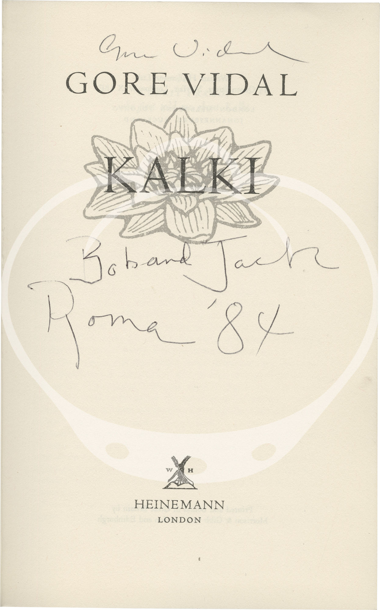London: William Heinemann, 1978. First UK Edition, preceded by the First American Edition published by Random House the same year. INSCRIBED by the author on the title page: "Gore Vidal / Bob and Jack / Roma '84."