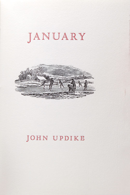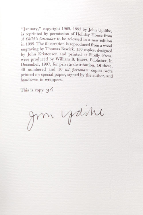 [Concord, New Hampshire]: (William B. Ewert, Publisher), 1997. First separate edition,#34 of a limited to 40 numbered copies (on special paper), signed by John Updike. 4 (French-folded) leaves, illustrated with a wood engraving by Thomas Bewick on title page. Publication is designed by John Kristensen, and printed at the Firefly Press. 12mo. Crimson paper wrappers, sewn. A fine copy. First separate edition,#34 of a limited to 40 numbered copies (on special paper), signed by John Updike. 4 (French-folded) leaves, illustrated with a wood engraving by Thomas Bewick on title page. Publication is designed by John Kristensen, and printed at the Firefly Press. 12mo.