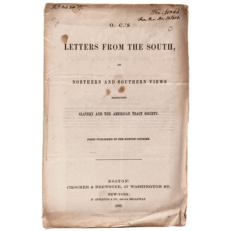 Boston: Crocker & Brewster, 47 Washington Street. New York: D. Appleton, 1857. First Published in the Boston Courier. 16pp. 8vo. Self wrappers, sewn. Signed on title-page "Rec'd Oct. 20 '57. Wm Jenks from Rev. Mr. Bliss.. First Published in the Boston Courier. 16pp. 8vo.