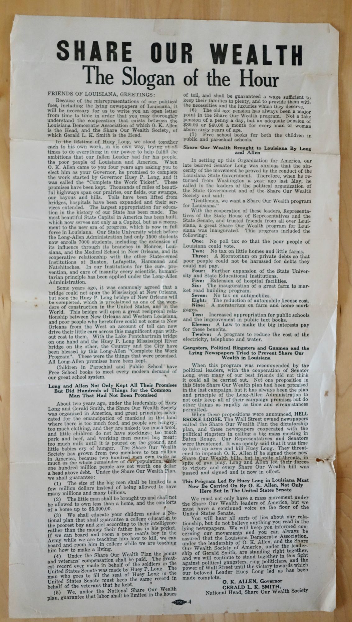 Baton Rouge: Typographical Union Label, 1936. First Edition. Broadside, 16 ¾ x 9 ¼ inches. Some wear, a few small holes at creases, slight foxing, very good minus overall. A broadside advertising the Share Our Wealth Program, which had been championed by the late Huey Long prior to his death in 1935, printed when the program was under the direction of Gerald L.K. Smith, who was widely considered a political demagogue and who ran the program into the ground following Long’s death. Long had made it his trademark piece of proposed legislation in his potential run for the presidency, proposing a progressive tax on wealthy Americans up to 100% of fortunes over 100 million dollars. Following his death, the program languished under the direction of Smith, who joined a third party coalition in support of William Lemke in 1936. Long’s program is often credited in helping push Roosevelt leftward, with some historians positing that some of the New Deal programs were created in response to the political threat of Long. We find one example of this broadside, at the E. Merton Coulter Collection at the University of Georgia.