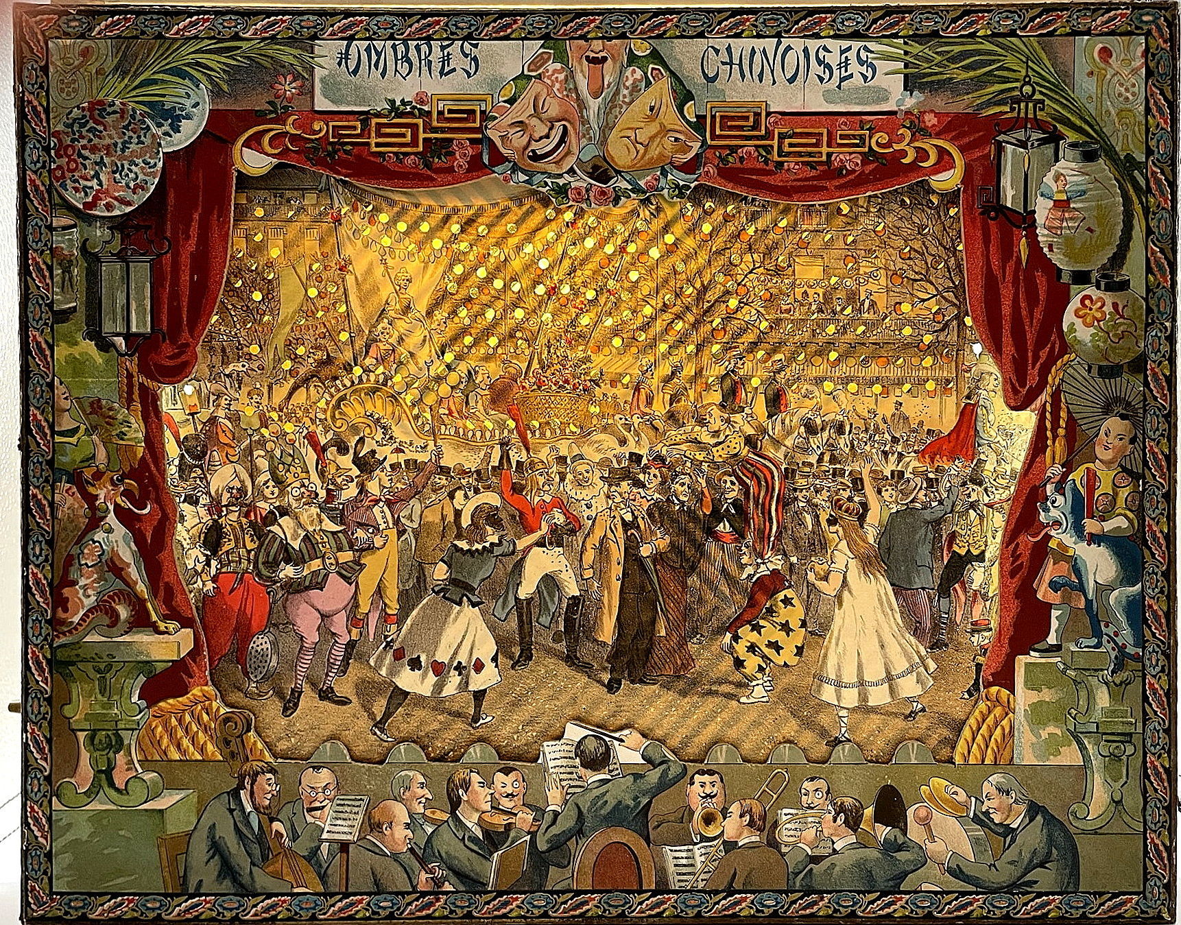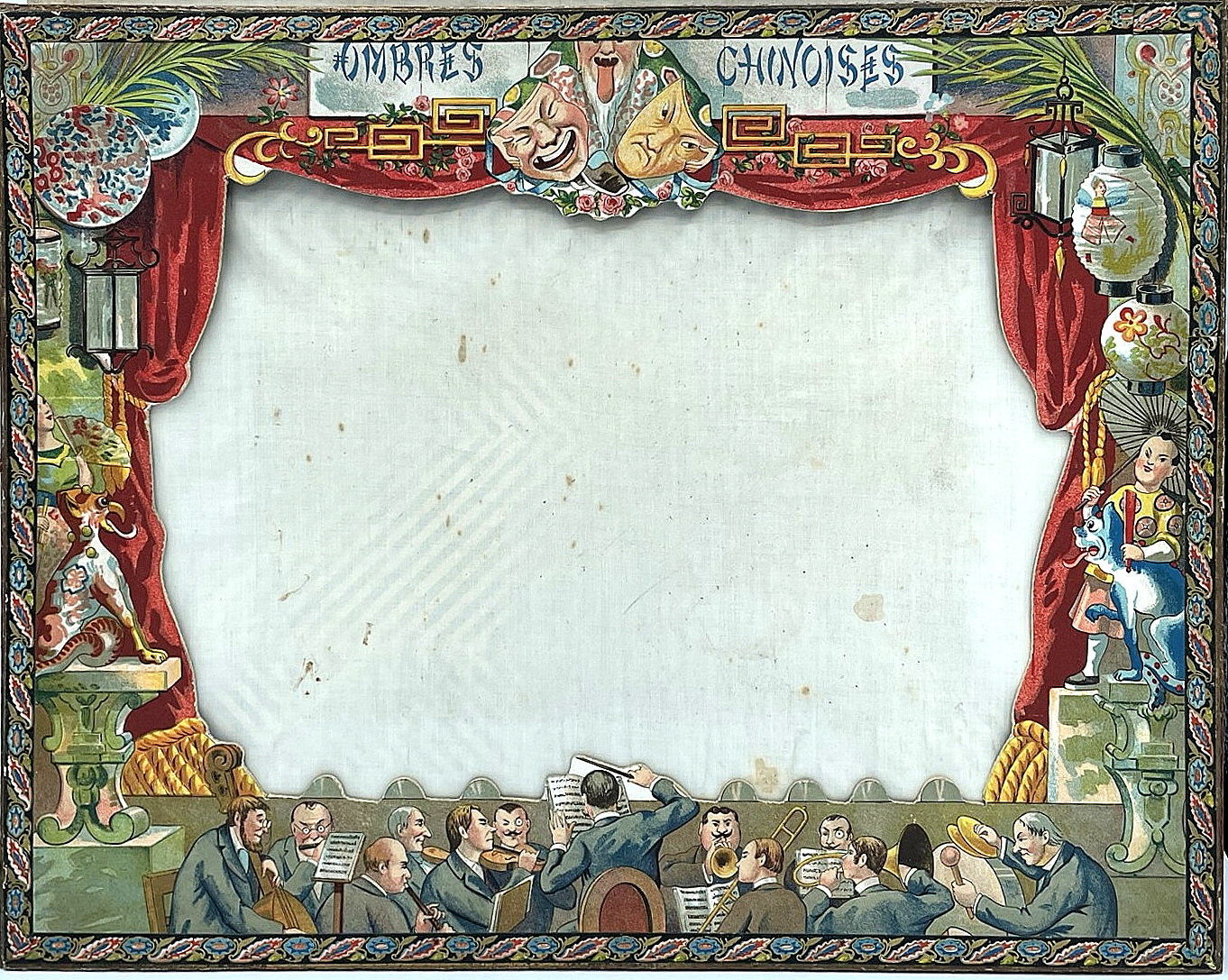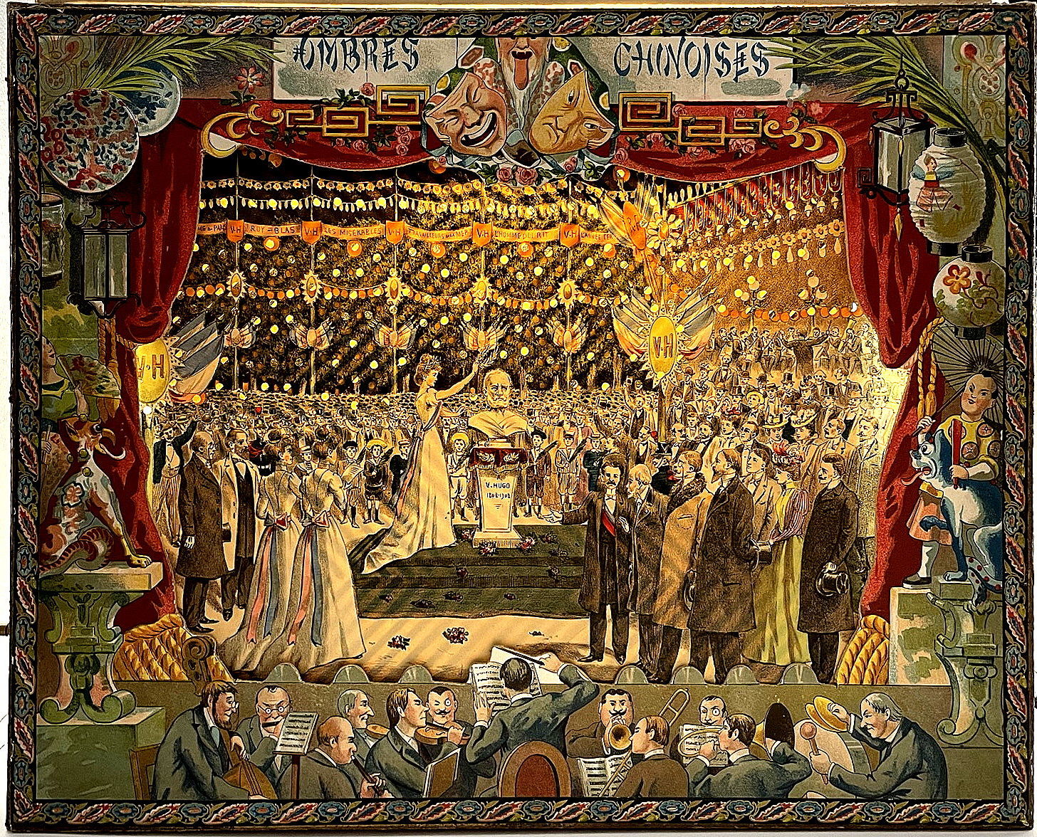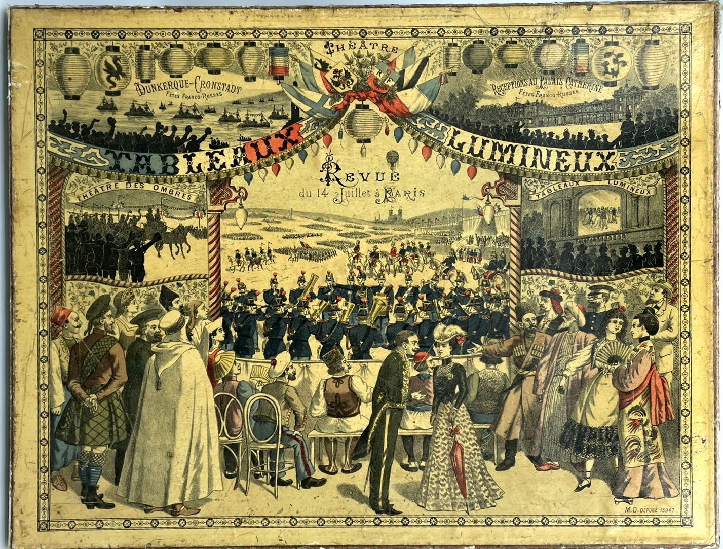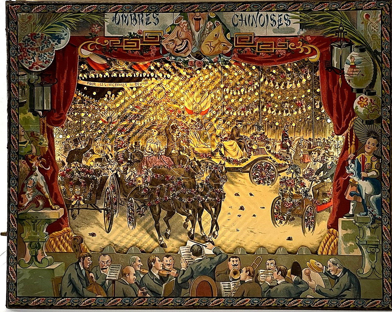 Paris: Mauclair Dacier, 1903. Very good to fine.. An ornate, and rather stunning, turn-of-the-century French shadow theater set, housed in a large chromolithographed box (15.5" by 19.75" by 3") depicting the Revue du 14 Juillet à Paris, as well as two smaller scenes of the 1893 Fêtes Franco-Russes. Underneath the lid, a printed label explains how to assemble the shadow theater, and lists the various punched paper scenes available in the various models. This model contains three punched paper scenes that, when illuminated from behind, mimick fireworks or starlight. They include: Fêtes du Centenaire de Victor Hugo; La Fête des Fleurs à Paris; and La Fête de la Mi-Carême à Paris. Also contained the stage box with with a fine and elaborate Ombres Chinoises proscenium with scrolls with colored paper (for a background); a 144 pp. booklet with scenes and characters; a large quantity of cut paper shadow figurines; the chromolithographed stage box is also for mounting shadow performances with the shadow figures. A marvelous object filled with joie de vivre.