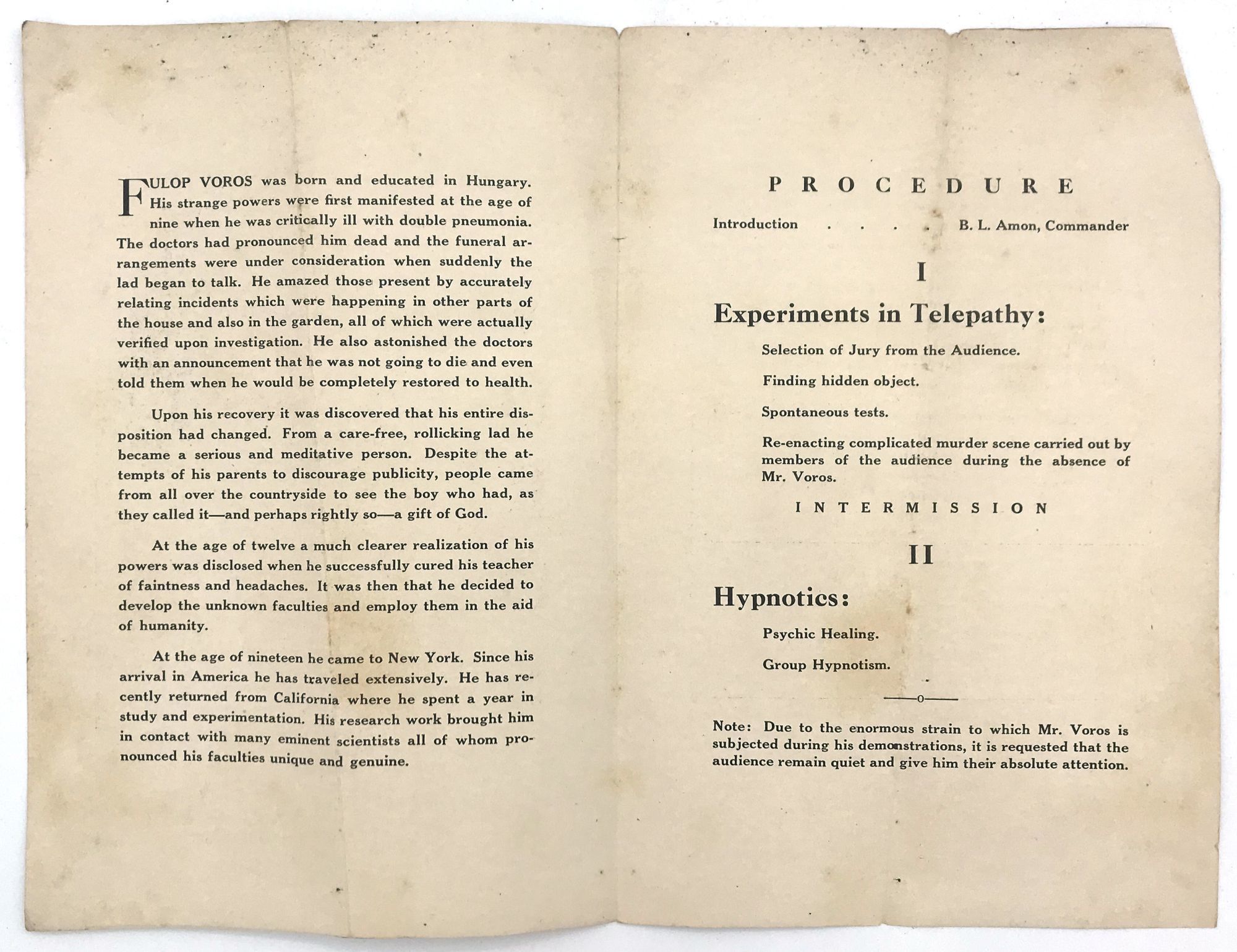 Bifolium (9" by 6"), with photographic reproduction of a charcoal drawing of Voros on cover, and advertisements on back. The strange talents of Fulop Voros are described in the program as first appearing during a childhood illness: "His strange powers were first manifested at the age of nine when he was critically ill with double pneumonia. The doctors had pronounced him dead and the funeral arrangements were under consideration when suddenly the lad began to talk. He amazed those present by accurately relating incidents which were happening in other parts of the house ... At the age of nineteen he came to New York ... His research work brought him in contact with many eminent scientists all of whom pronounced his faculties unique and genuine.