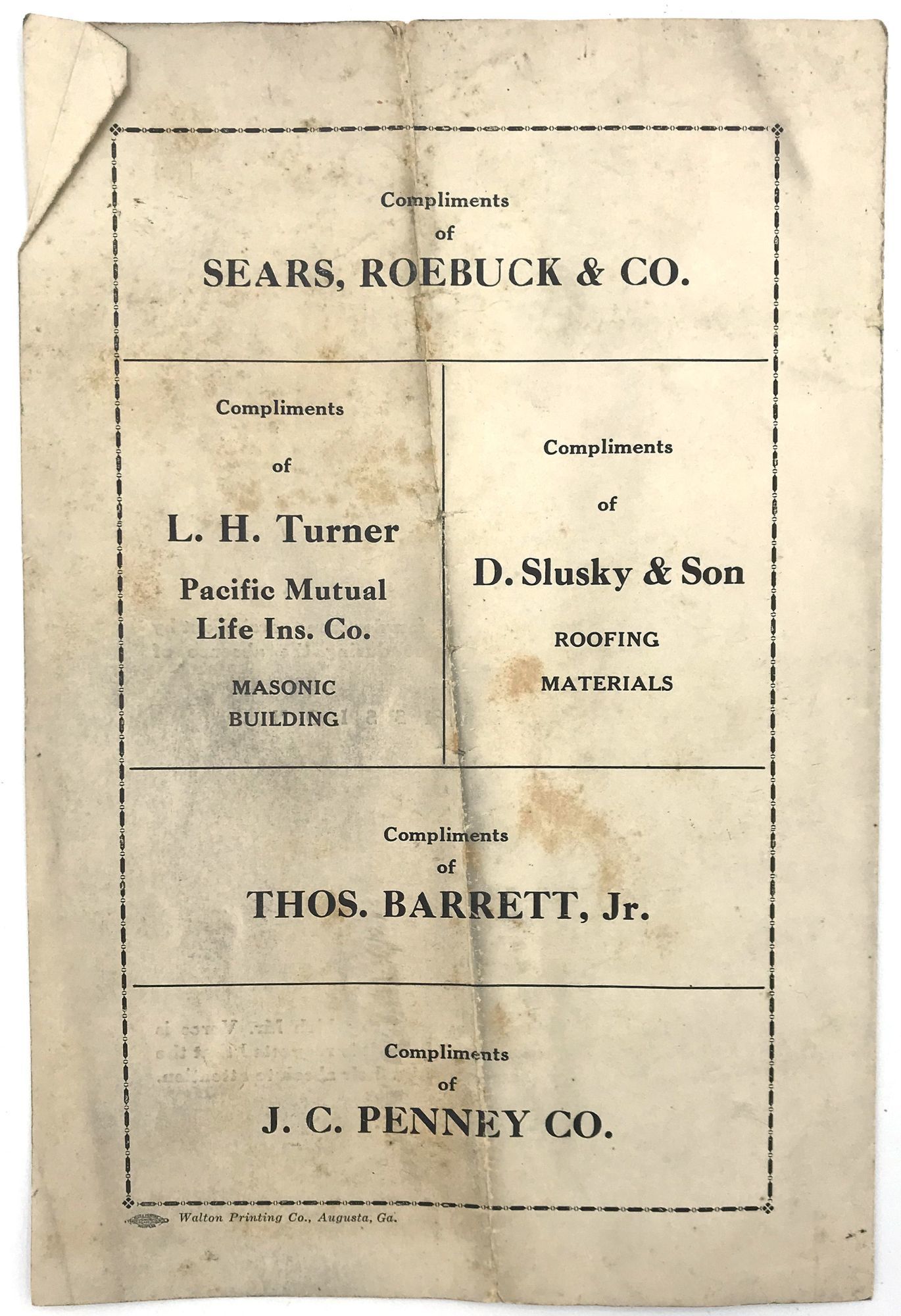 Augusta, Georgia: Scottish Rite Guard, 1933. Very good. Center crease, minor dust soiling.. Printed program advertising a 1933 performance given by Hungarian hypnotist Fulop Voros in Augusta, Georgia. The performance was divided into two parts: "Experiments in Telepathy", and "Hypnotics". The latter includes psychic healing and group hypnotism; the former consists of audience participation, "finding [a] hidden object", "spontaneous tests", and "Re-enacting [a] complicated murder scene carried out by members of the audience during the absence of Mr. Voros." A note to the audience is included at the end of the program: "Due to the enormous strain to which Mr. Voros is subjected during his demonstration, it is requested that the audience remain quiet and given him their absolute attention."