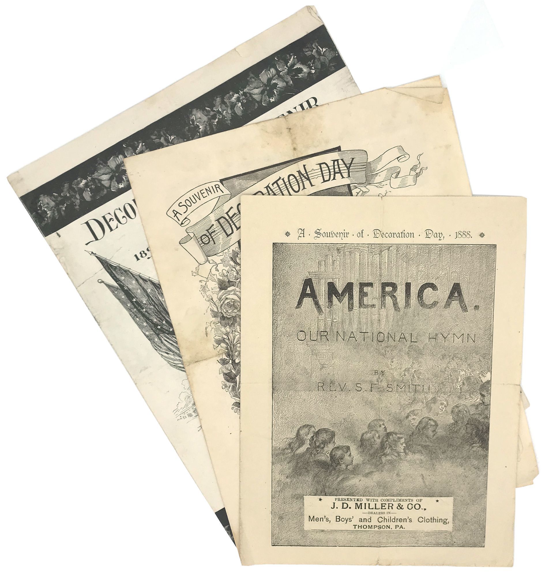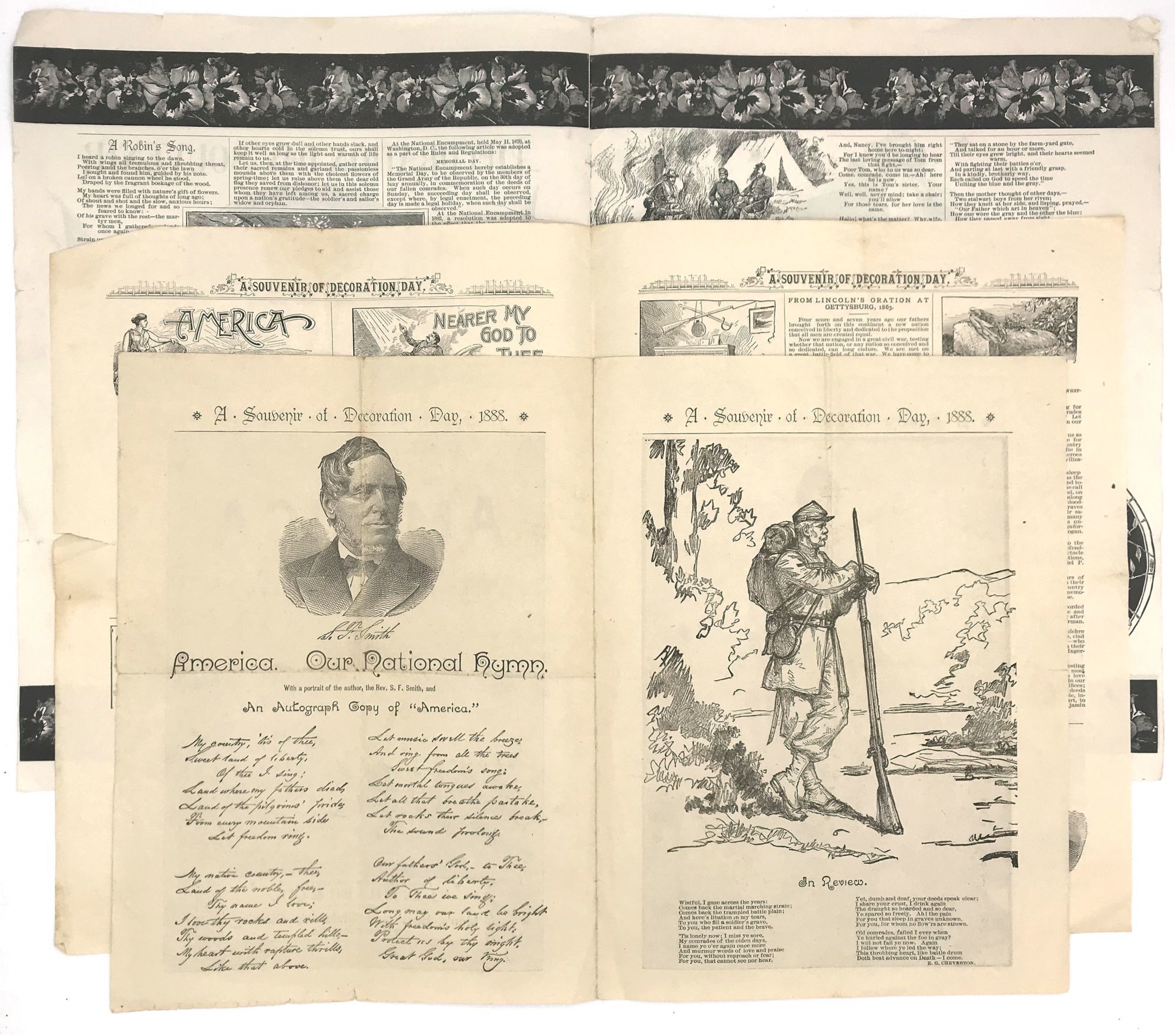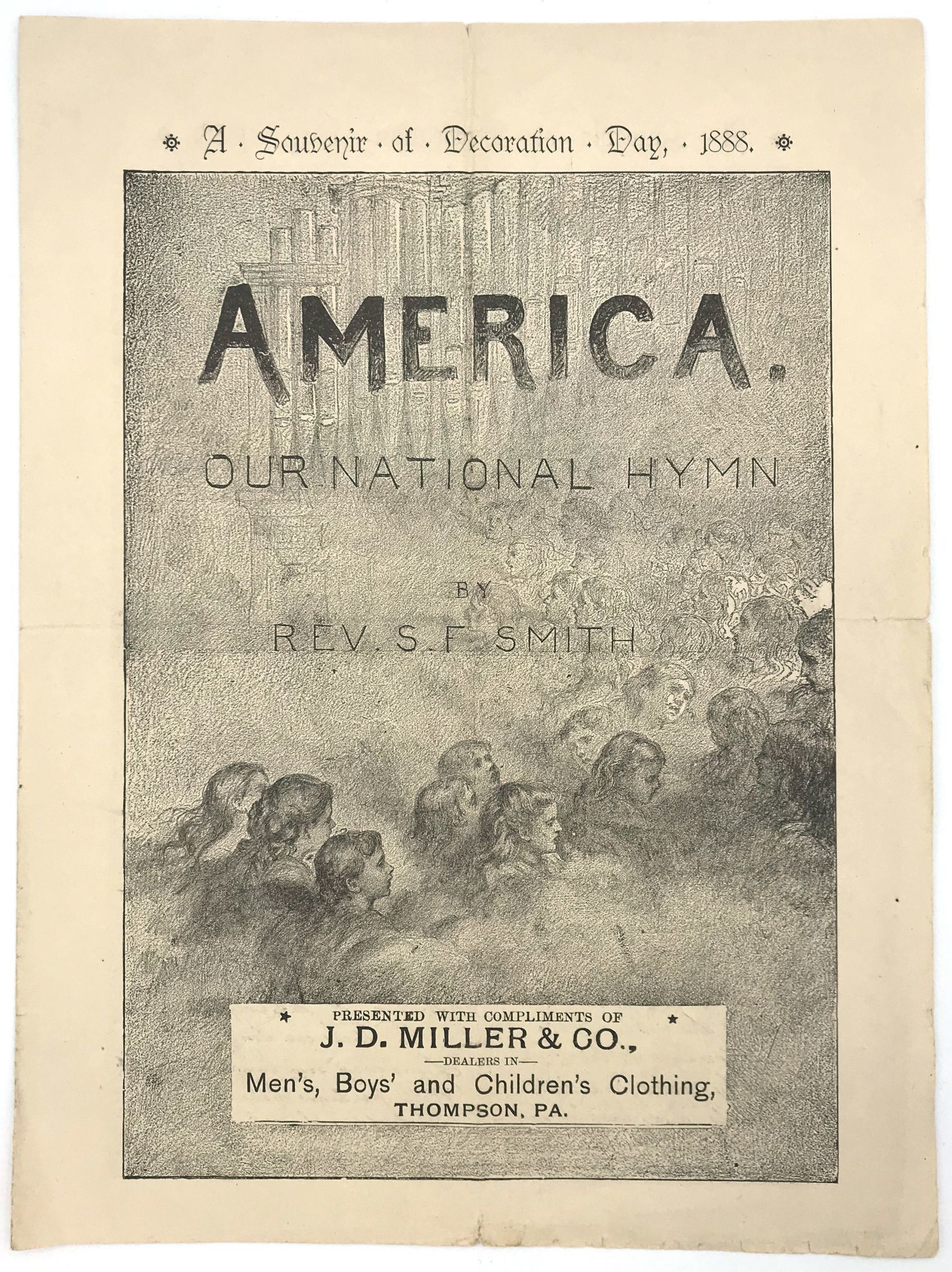 A Souvenir of Decoration Day, 1888. America. Our National Hymn by Rev. S.F. Smith. Presented with Compliments of J.D. Miller & Co., Men's, Boys' and Children's Clothing, Thompson, PA. Bifolium (11" by 8"), with illustrations. Includes a facsimile autograph copy of Smith's lyrics.
