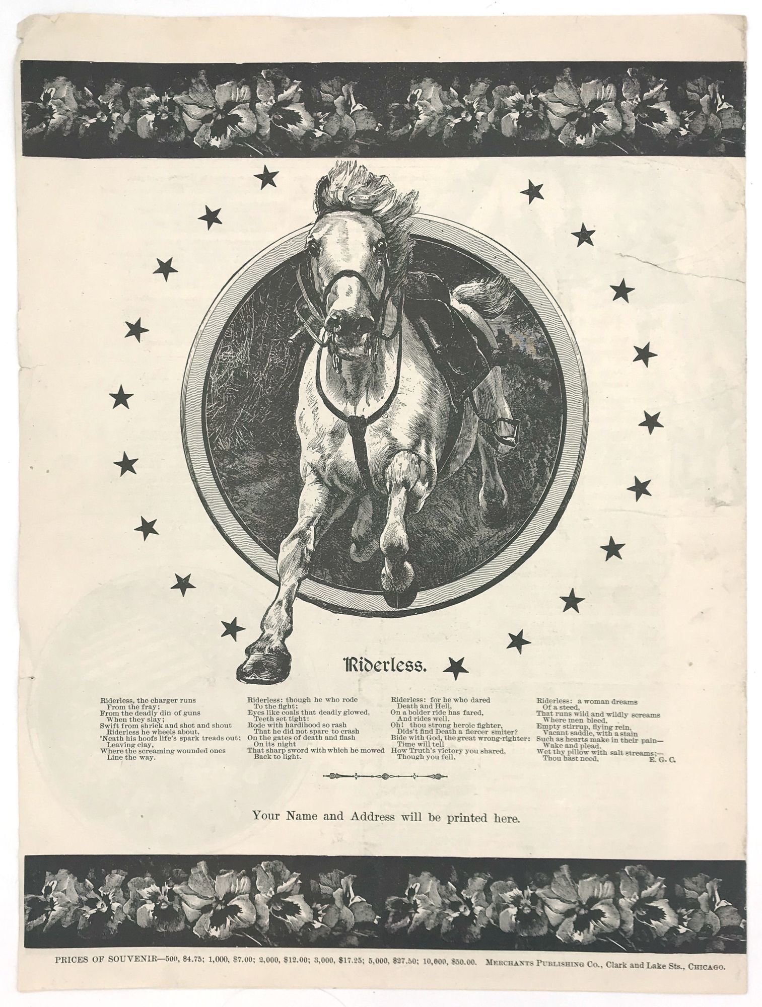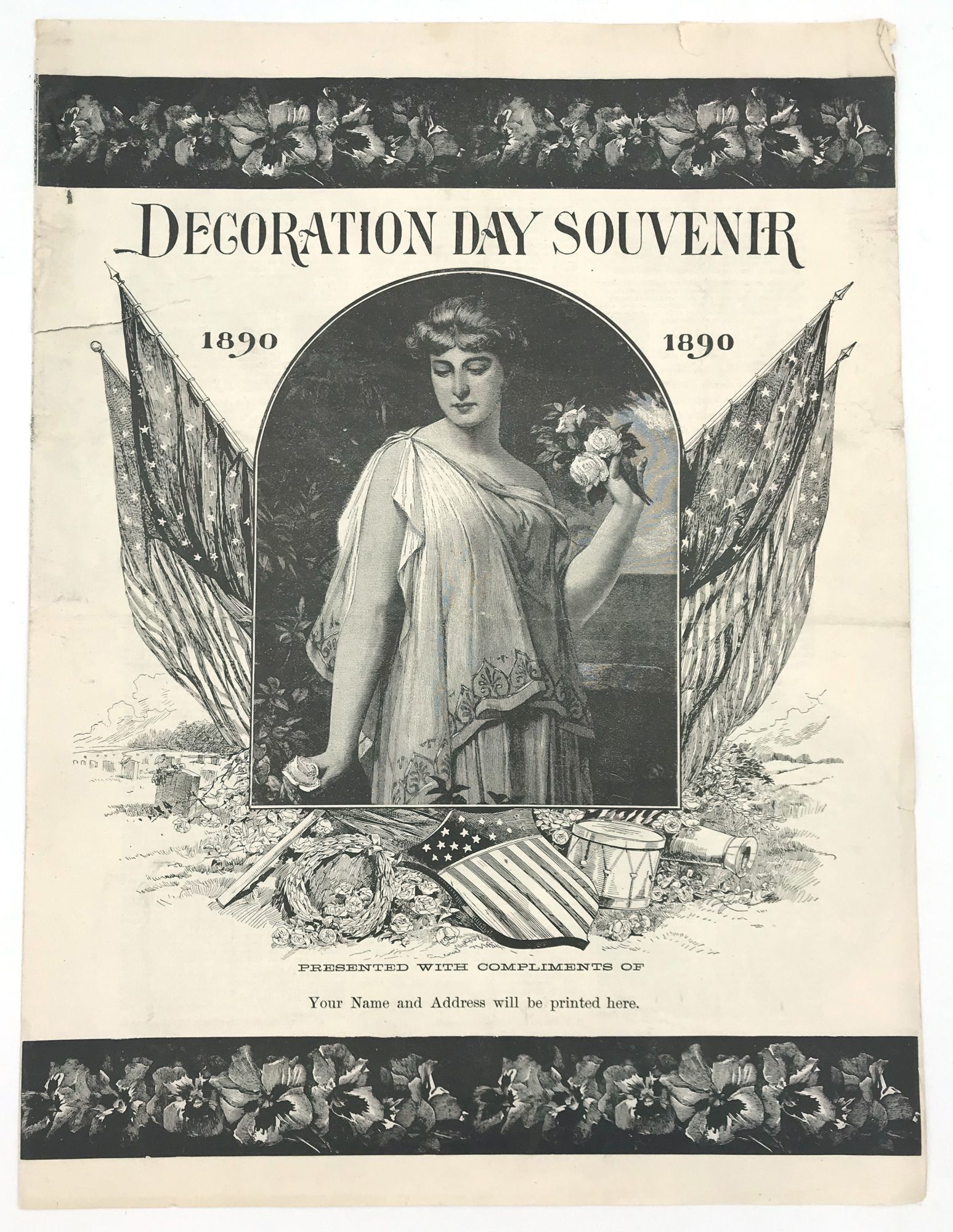 [Salesman dummy:]Decoration Day Souvenir. 1890. Presented with Compliments of Your Name and Address will be printed here. Chicago: Merchants Publishing Co., 1890. Bifolium (13" by 9.5"). Includes verse and illustrations.