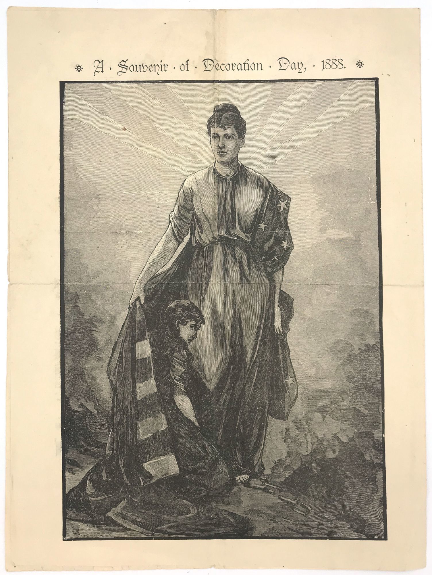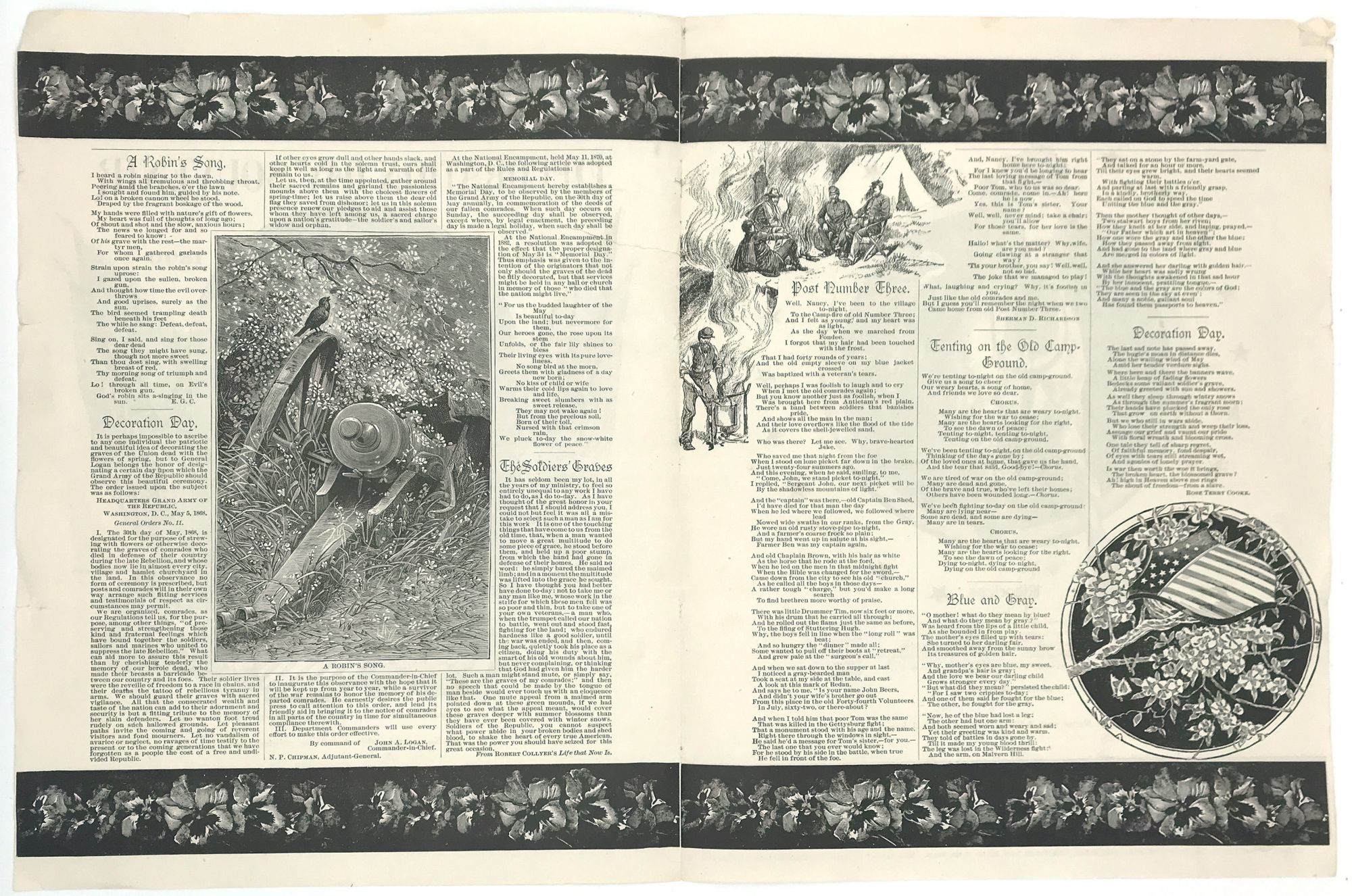 Chicago, Illinois: Merchants Publishing Co, 1890. Fine. Some light toning, two or three short tears not affecting text or image.. A grouping of three (3) Decoration Day Souvenirs ranging in date from 1888 to 1890. Two of the souvenirs are "Presented with compliments of" local businesses in Thompson, PA, and Nashua, NH; the final example is a salesman dummy with "Your Name and Address will be printed here" in the same space. Such Decoration Day Souvenirs were popular printed material that often included patriotic lyrics, stories, and illustrations.