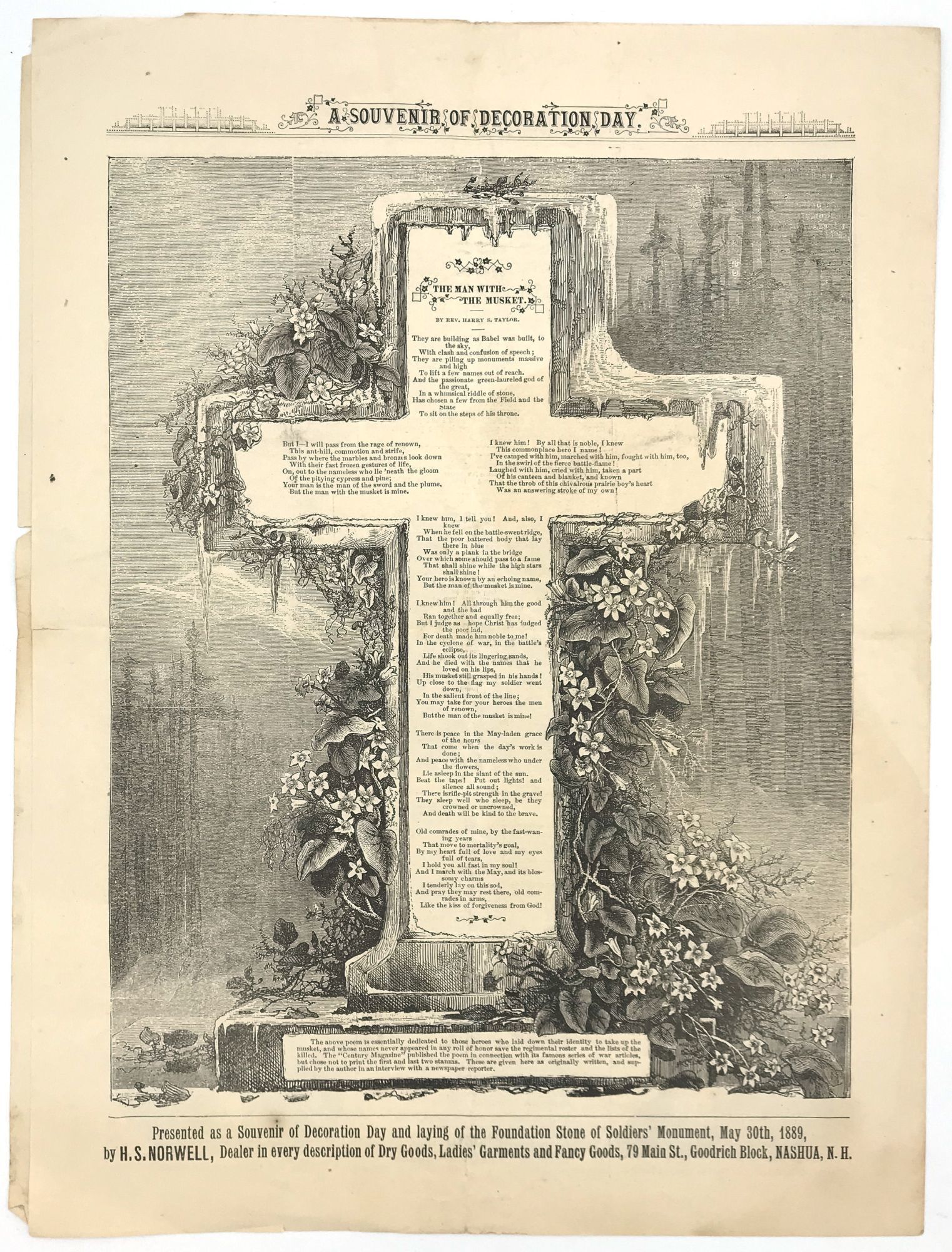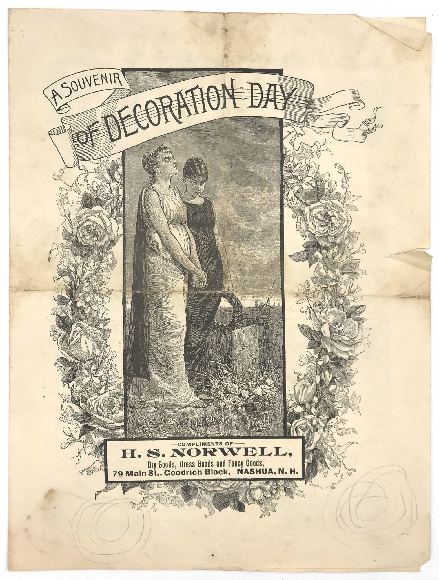 A Souvenir of Decoration Day [1889]. Compliments of H.S. Horwell, Dry Goods, Dress Goods and Fancy Goods ... Nashua, N.H. Bifolium (12" by 8.75") with illustrations. Includes patriotic lyrics and poems, a transcription of the Gettysburg Address, and portraits of Francis Scott Key and Rev. S. F. Smith.