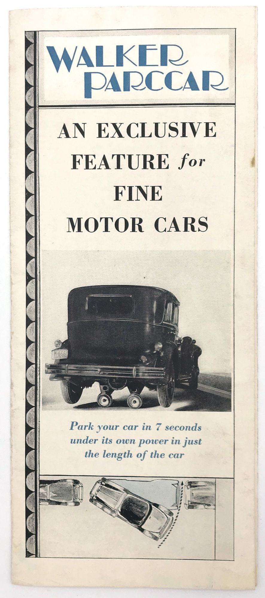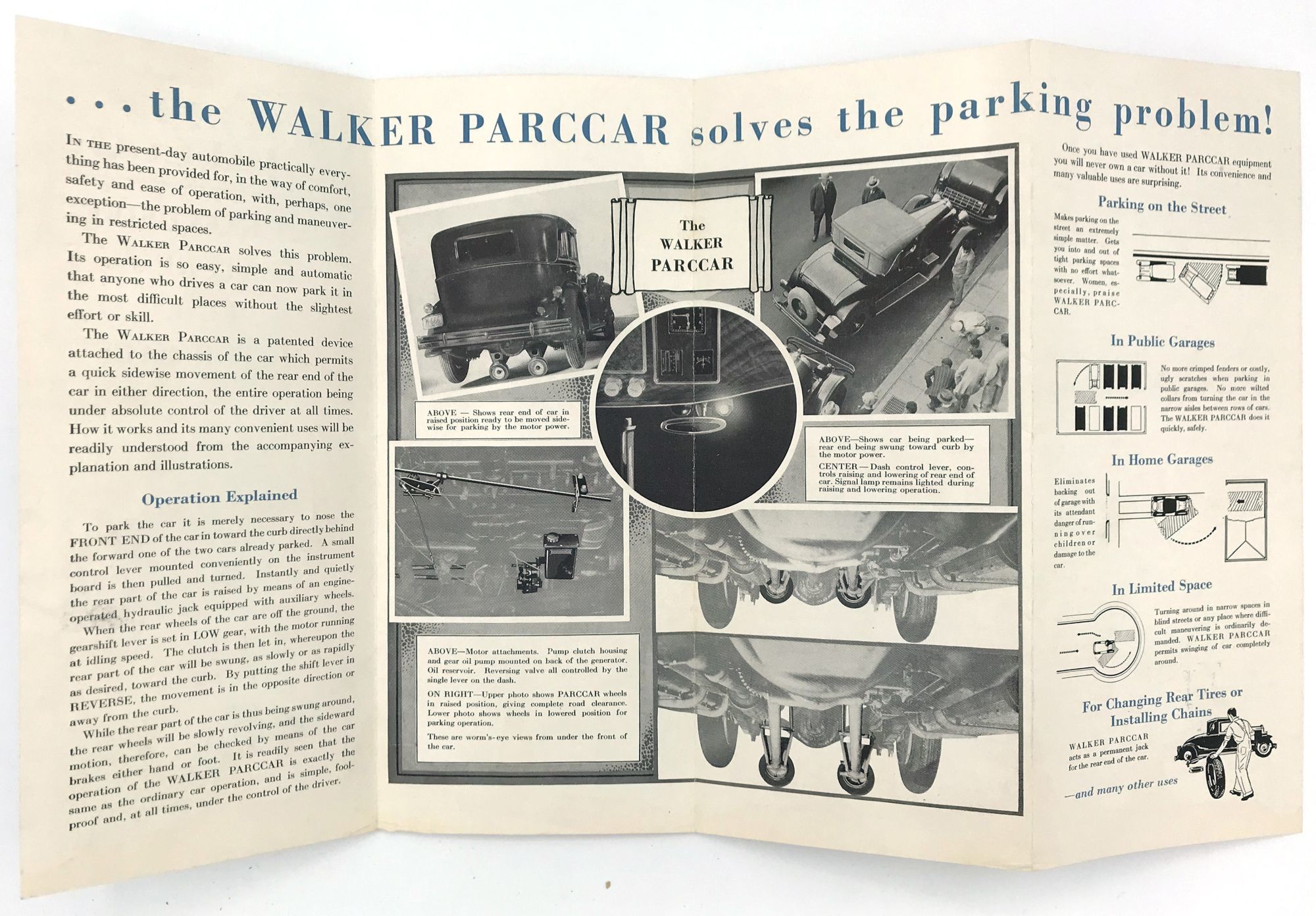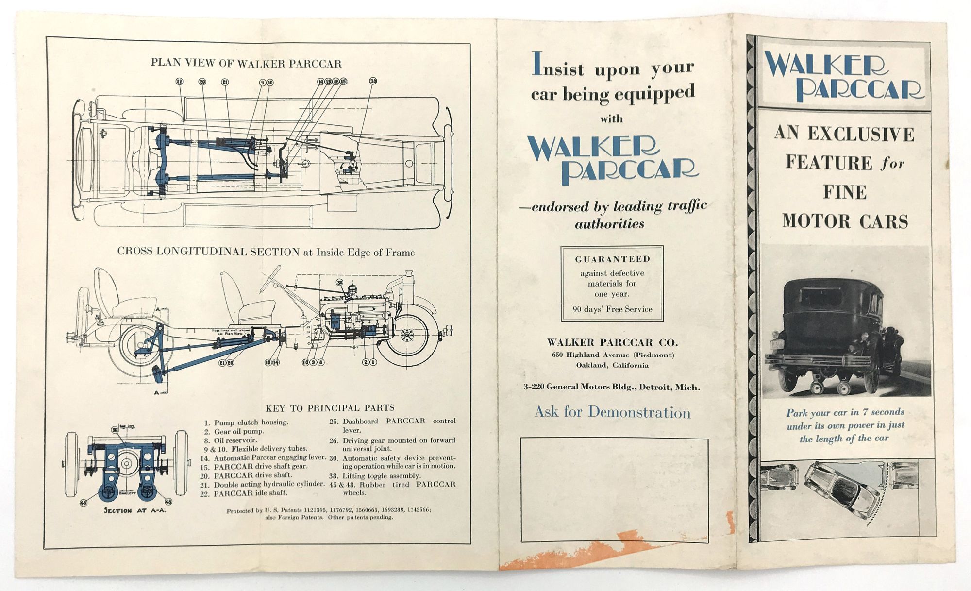 Oakland, California: Walker Parccar Co, 1930. Very good to fine; stain to verso.. Illustrated advertising pamphlet for the Walker Parccar Parking System, a clever mechanism that, when attached to the undercarriage of a vehicle, allows the driver to swing it into even the tightest of parking spaces. Includes photos of the product in use, as well as diagrams and an explanation of how the product works. Measures by 9" by 3.75" folded, 9" by 14.75" unfolded.