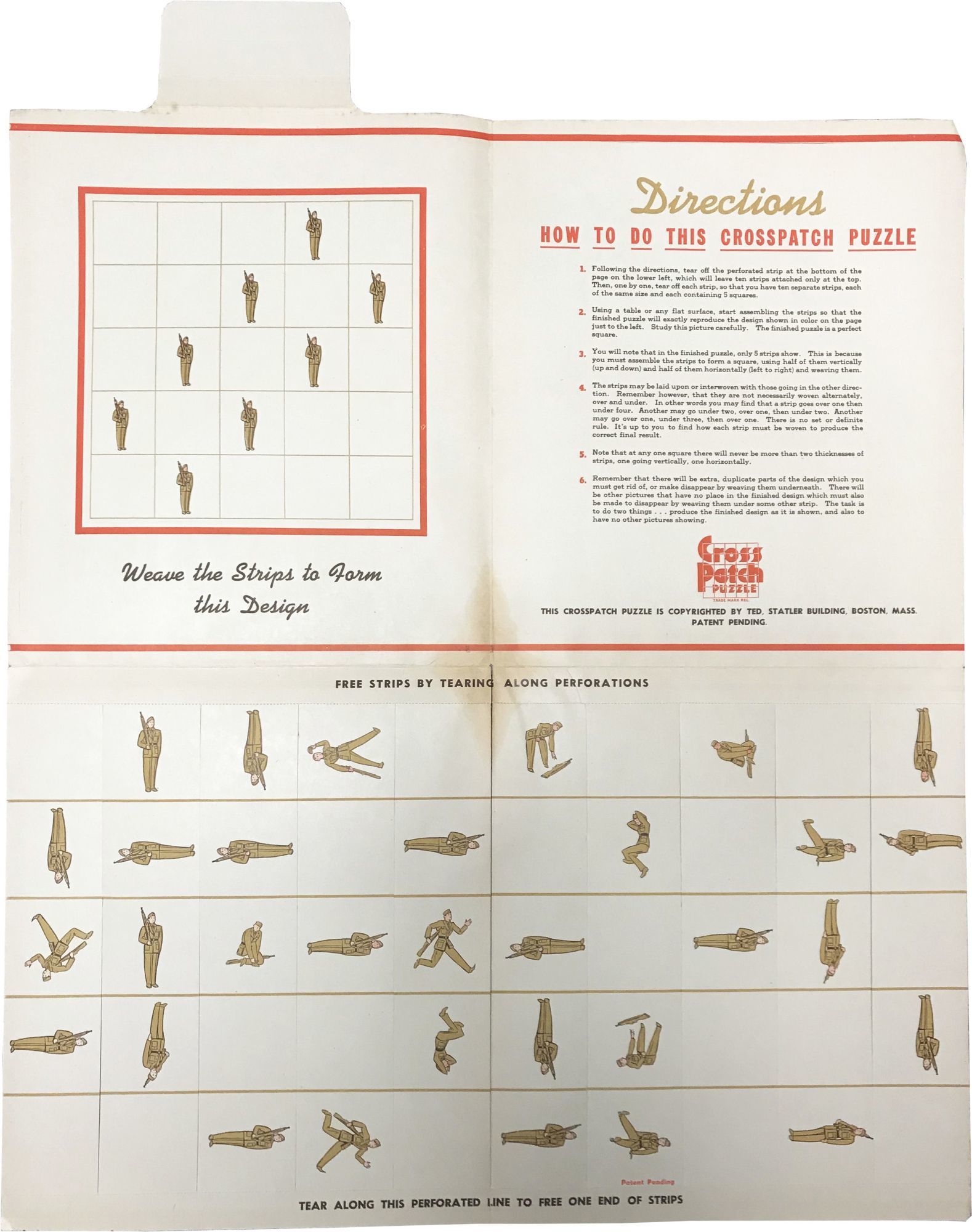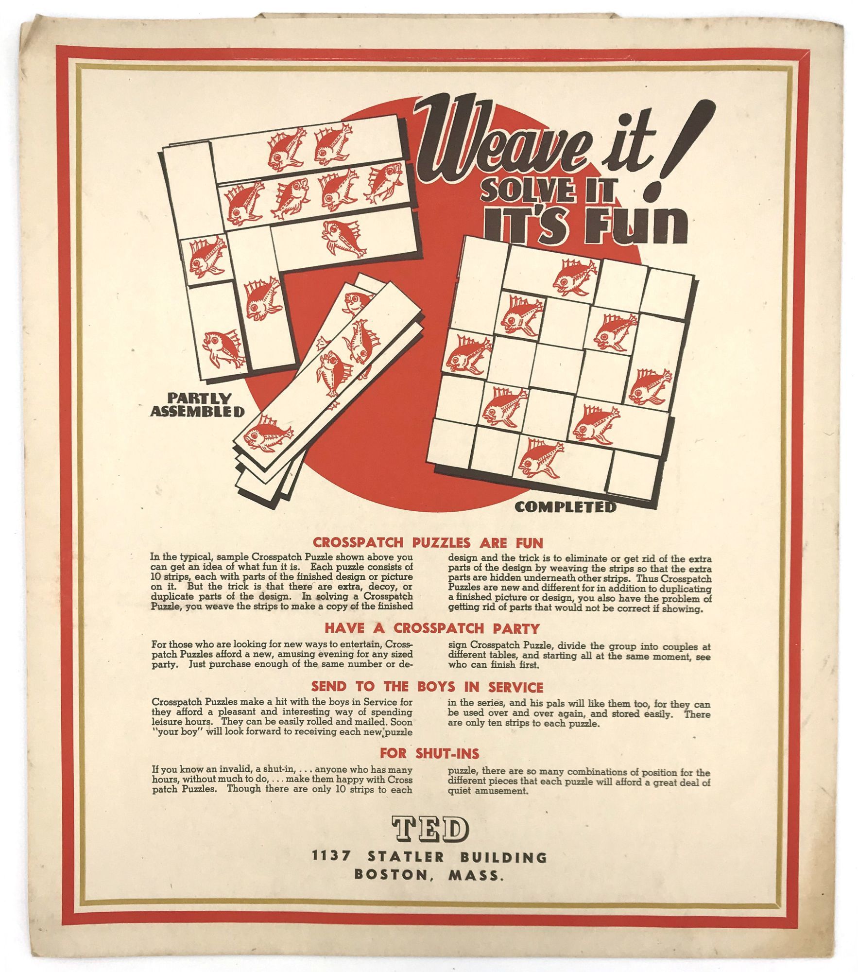Boston, Massachusetts: Ted, 1940. Fine. Some toning, one water stain to center of sheet.. A fine, uncut example of Crosspatch Puzzle No. 8, "Can you line up the Rookies?", illustrated with images of rookies in the military. The goal of the puzzle is to weave the ten illustrated strips together in such a way as to reveal a pattern with some images while also hiding the extra/decoy images. The verso describes such "Crosspatch Puzzles" as fun additions for parties or gifts for "shut-ins" or invalids. It also advertises Crosspatch Puzzles as the perfect gift for servicemen overseas: "[It will] make a hit with the boys in Service ... They can be easily rolled and mailed. Soon 'your boy' will look forward to receiving each new puzzle in the series, and his pals will like them too, for they can be used over and over again, and stored easily." Large illustrated sheet (13" by 11.25" folded, 26" by 22.5" unfolded) printed in red, mustard, and brown.