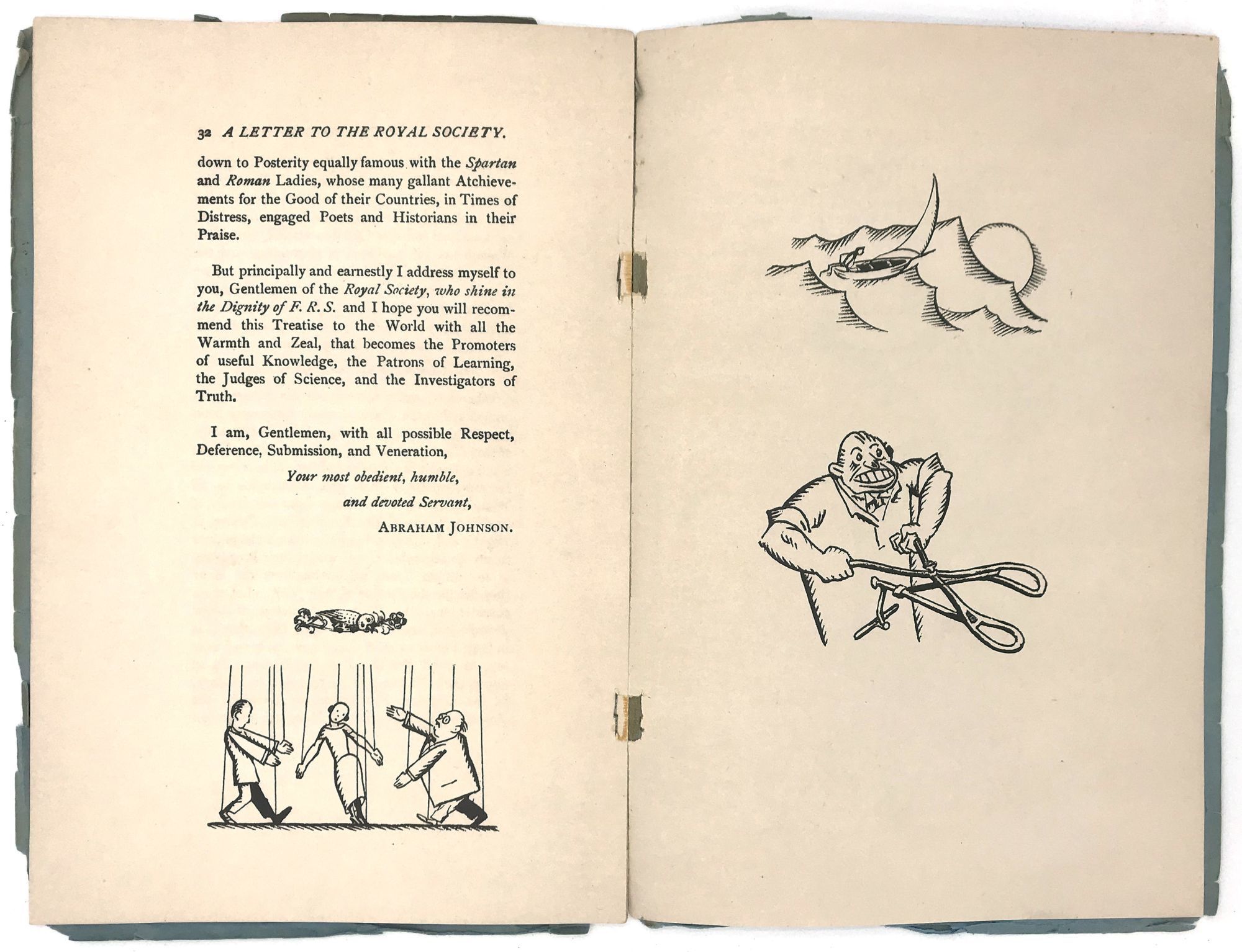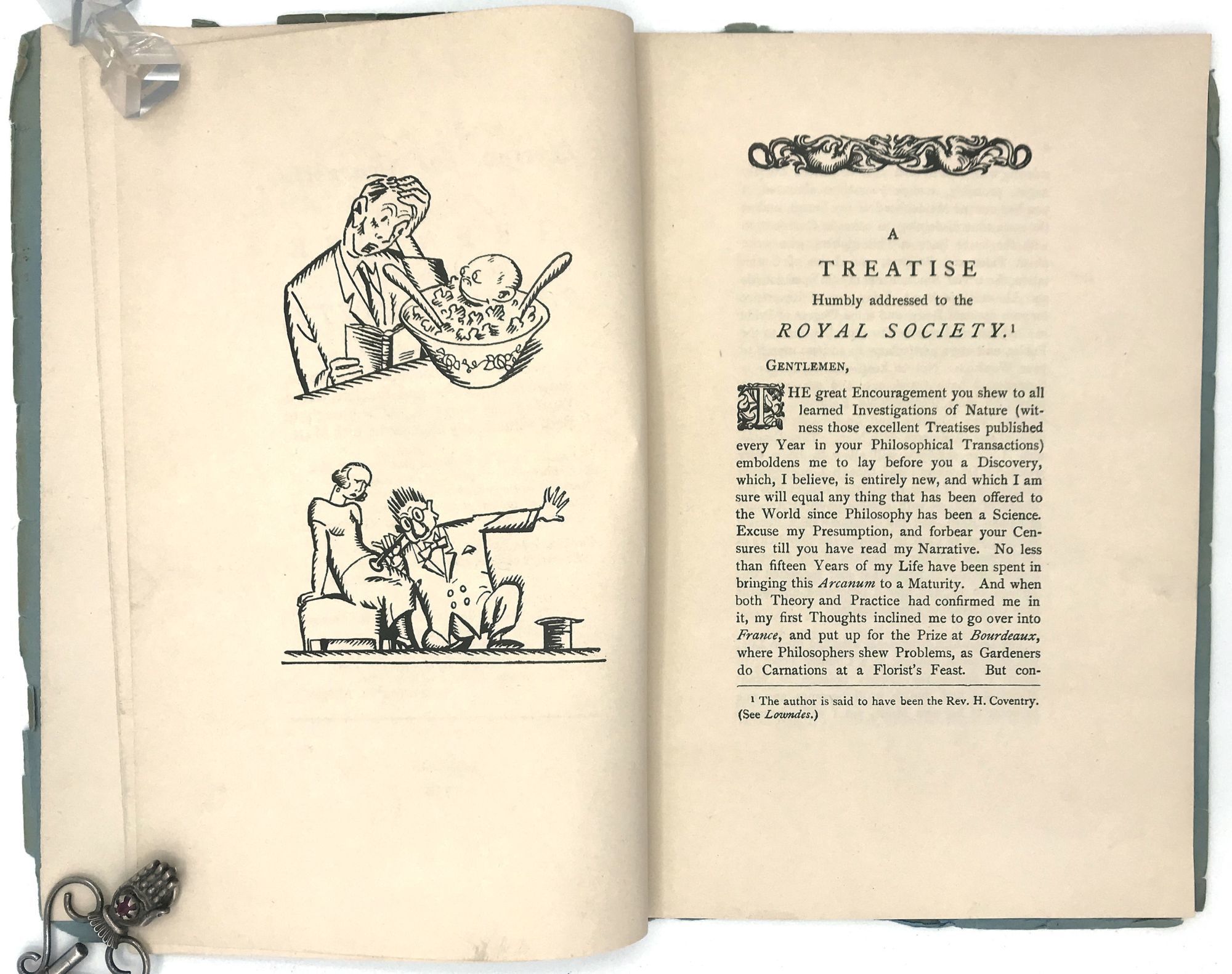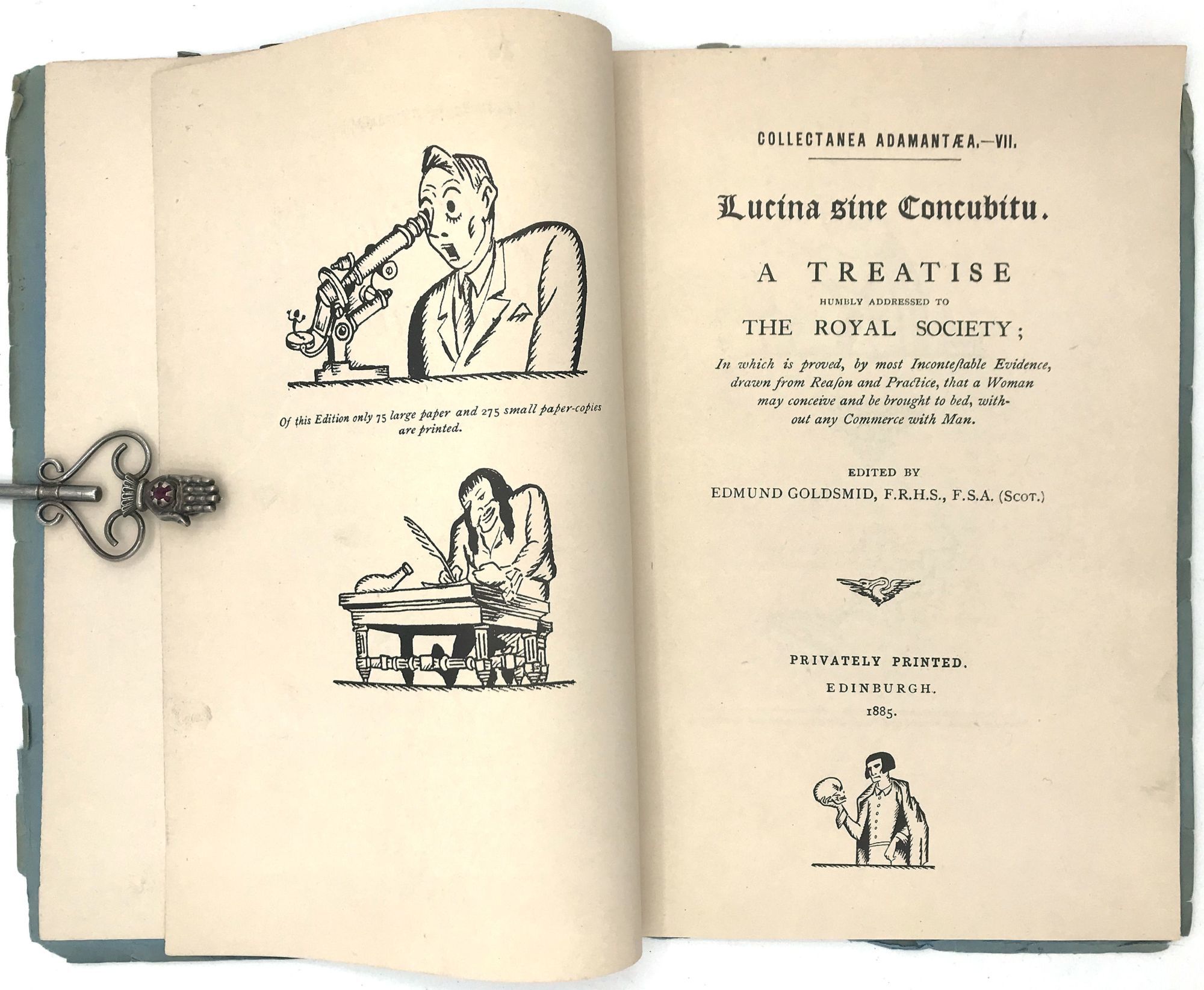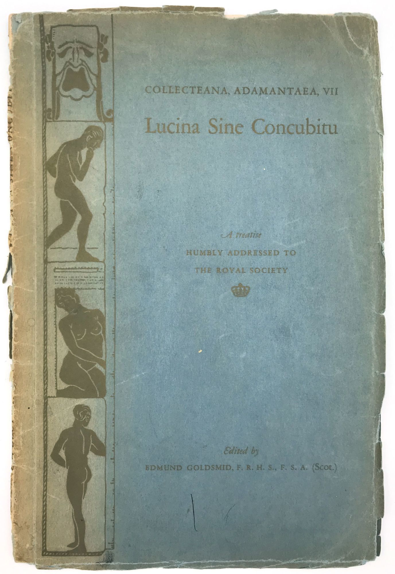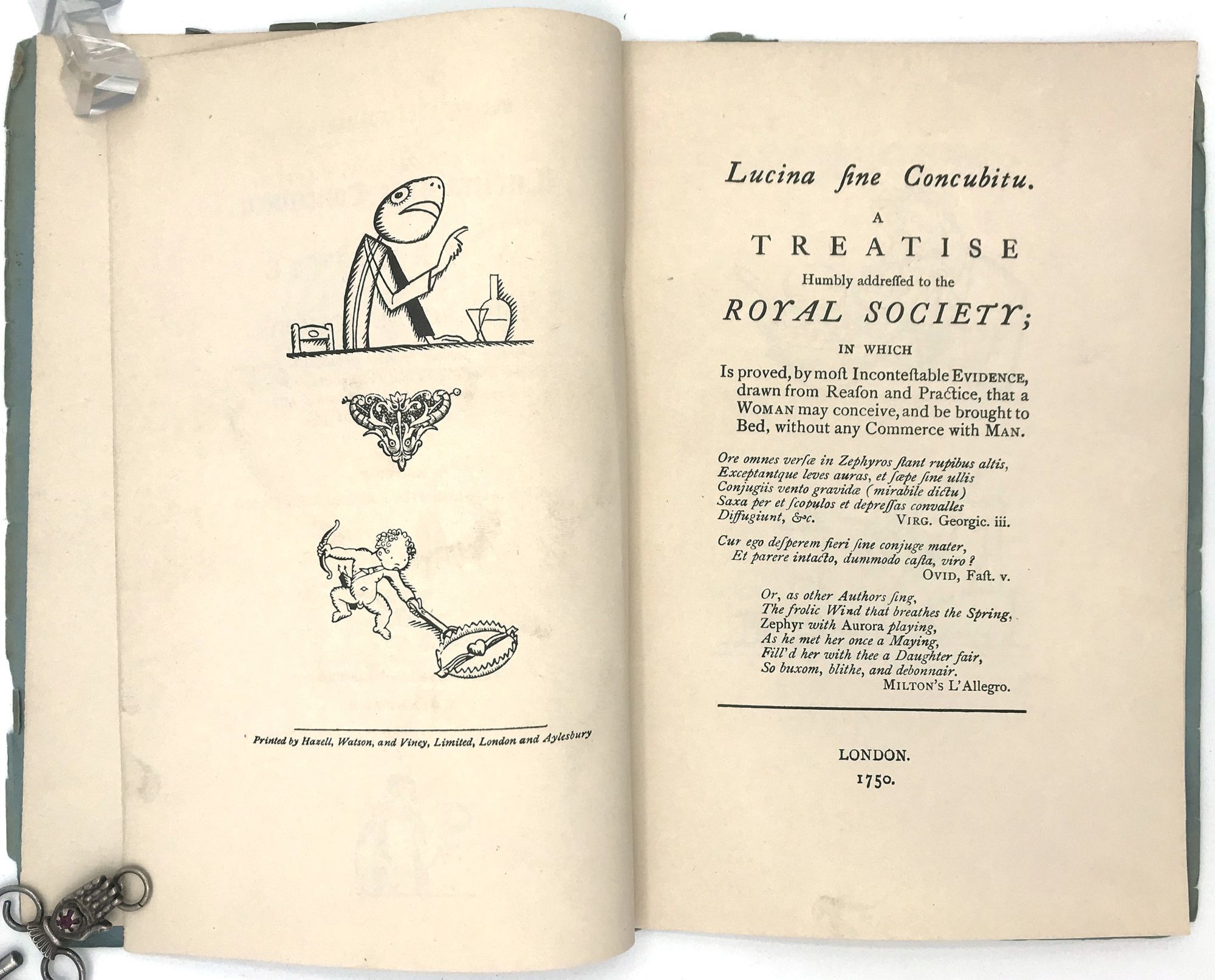 1930. Very good to fine; minor wear to extremities.. A quirky illustrated facsimile of an eighteenth-century treatise written as a hoax. The disgruntled author had been rejected by the Royal Society for membership in 1750, and his response was to publish proof "that a Woman may conceive, and be brought to Bed, without any Commerce with a Man". A facsimile of the 1750 edition was published in 1885 (edited by Edmund Goldsmid), and this edition is a facsimile of THAT edition, with added in-text illustrations. Only some of the illustrations pertain to the subject matter (there is a cartoonish gynecologist which vaguely relates to the topic, but there is also a stick figure on a sail boat that appears to be random?), but all exude a playfulness and derision that echoes text's origin as a hoax/satire.