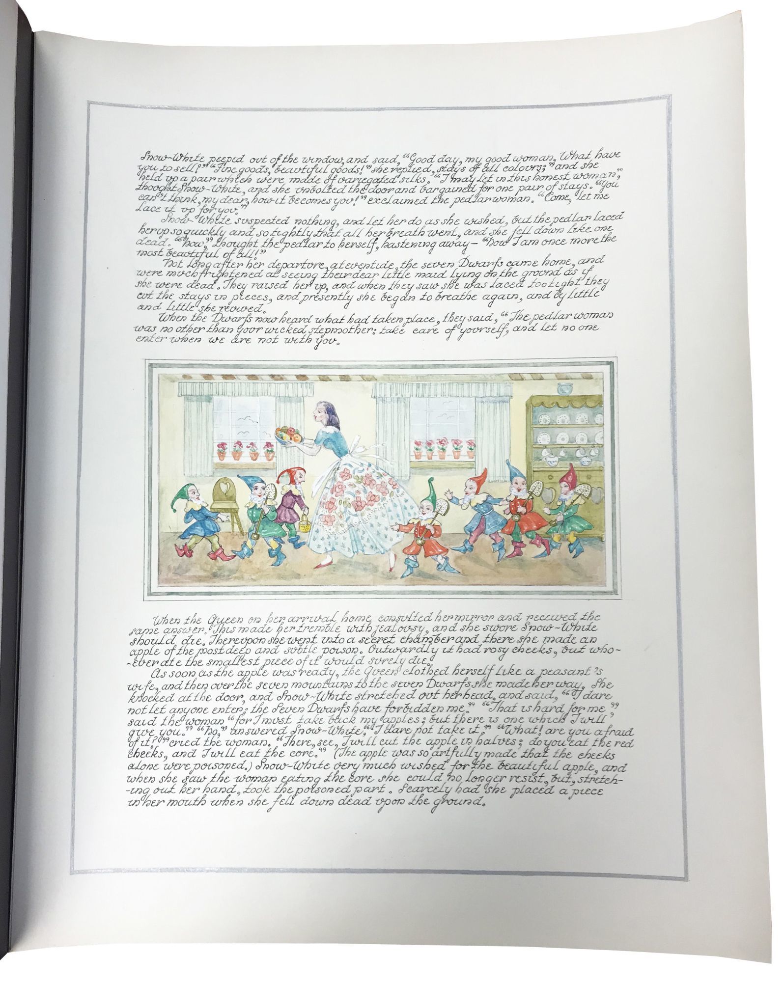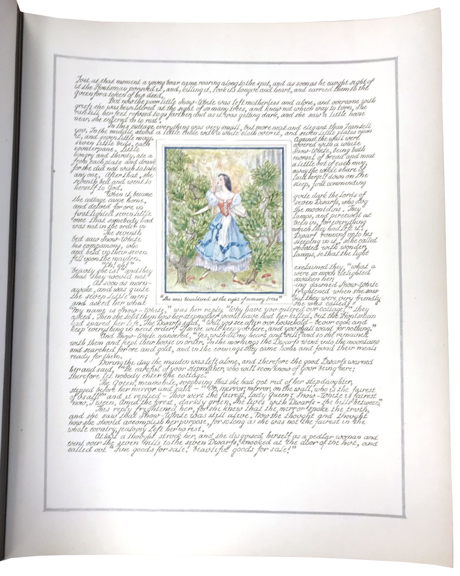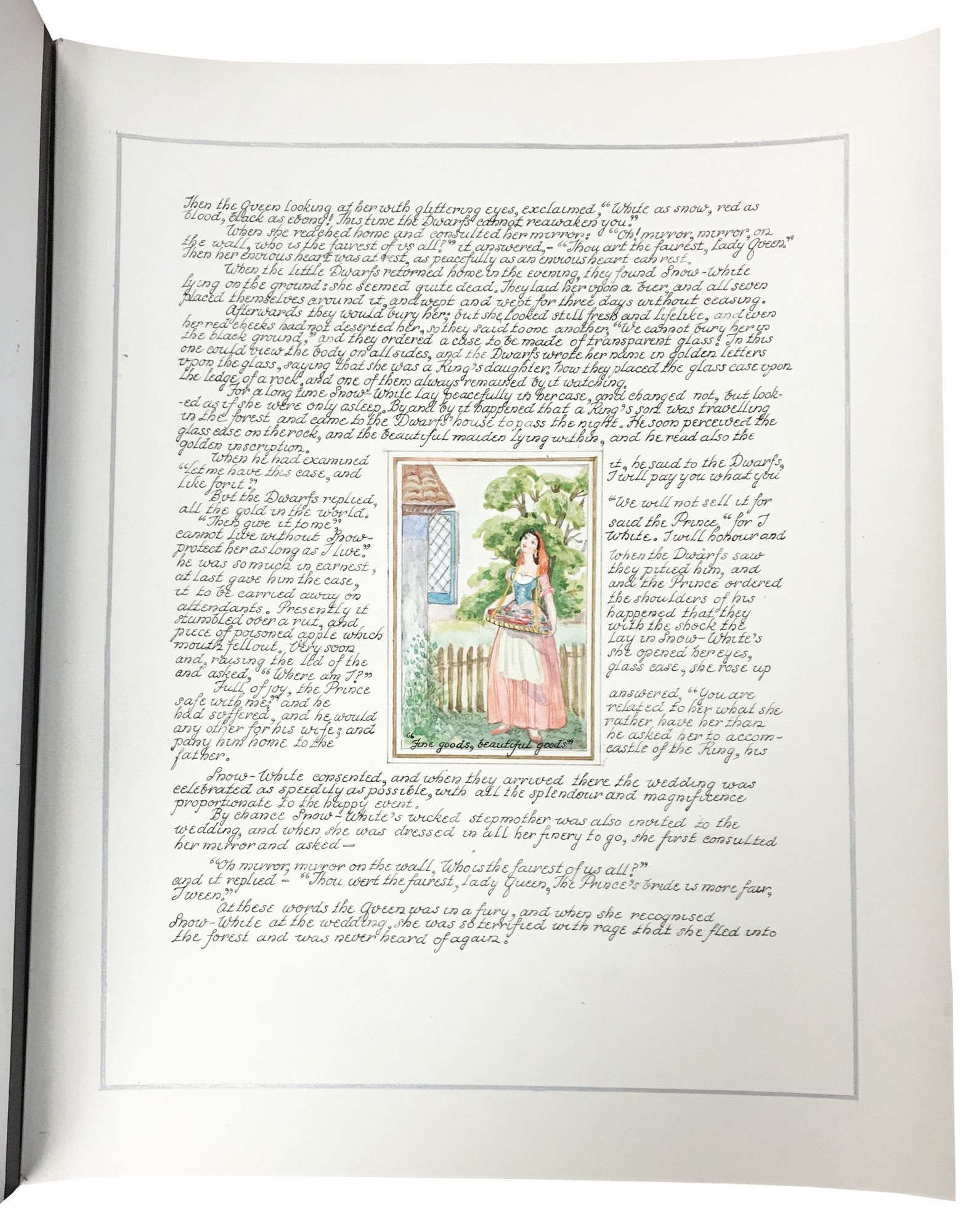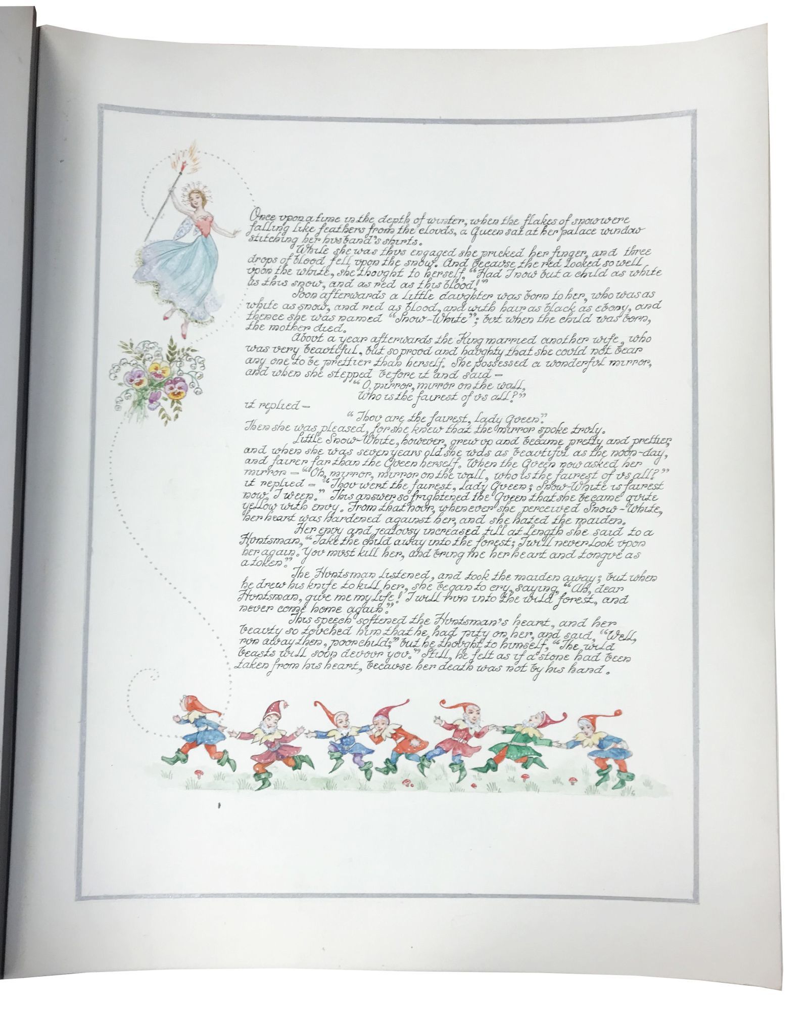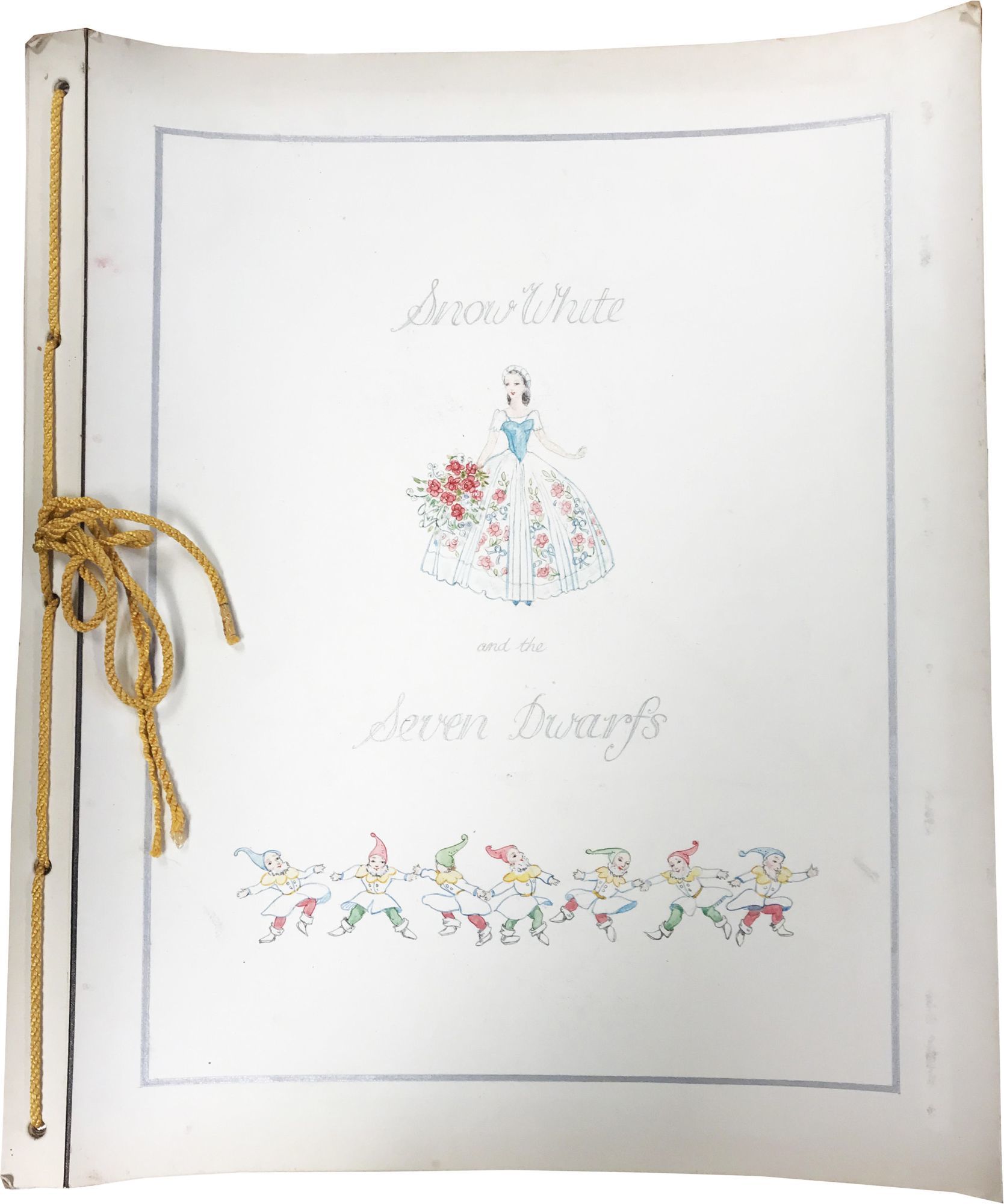 United States, 1940. Fine. Leaves somewhat bowed, some light foxing on last leaf verso.. A rather remarkable manuscript children's book rendering of the story of Snow White, with stunning original watercolor artwork. Watercolors of Snow White and/or the Dwarfs adorn each page. The manuscript is comprised of five thick leaves of large card, perhaps manufactured for albums, secured in the left-hand margin by a thick gold cord. The story itself is transcribed in a precise, careful hand, with the original pencil ruling just barely visible. Appears to be completely unpublished, and unknown. Measures approx. 18" by 15.25"; versos blank.