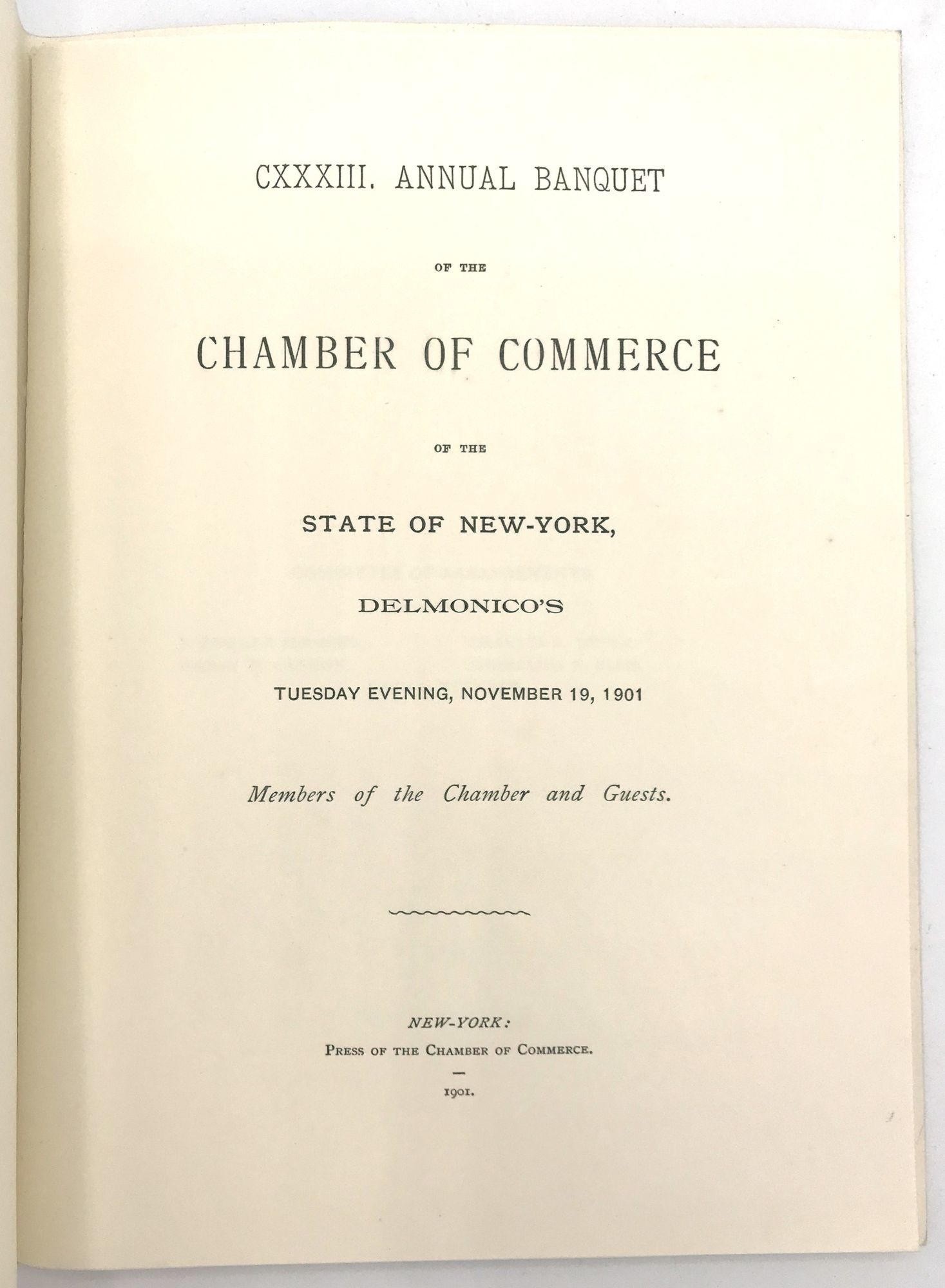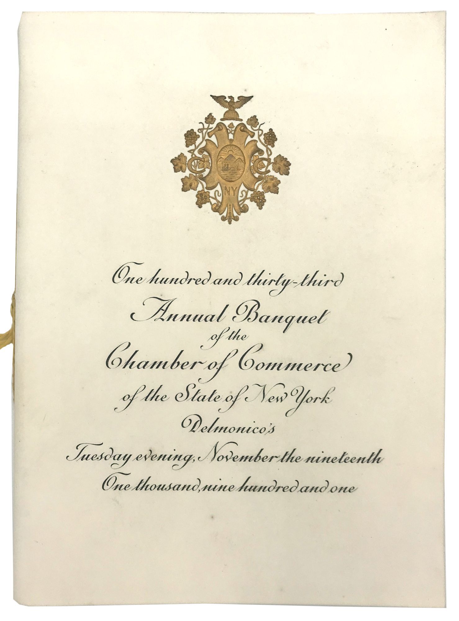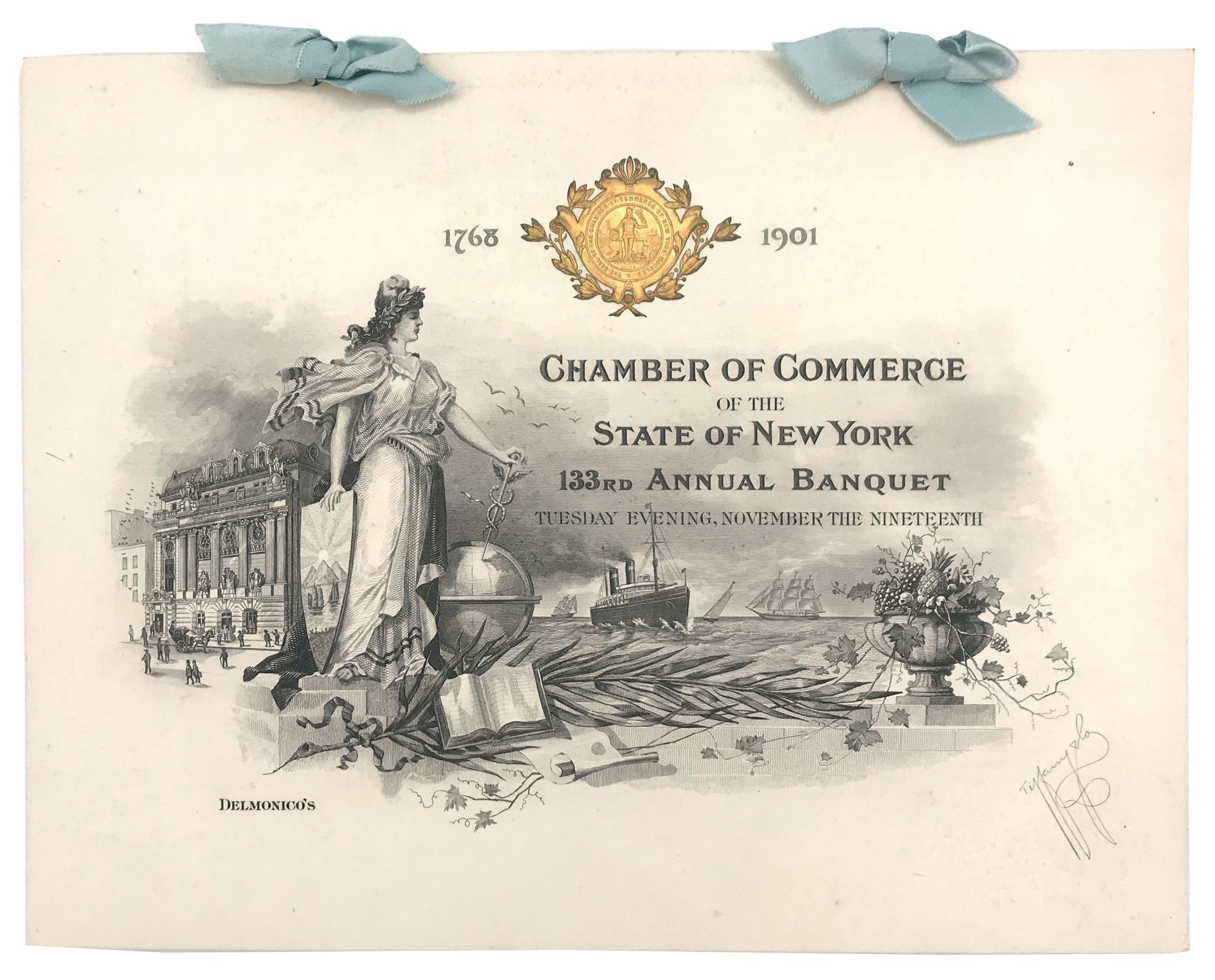 New York, New York: Tiffany & Co, 1901. Fine to very fine; some light wear to box's internal ribbons.. Commemorative menu (7.25" by 9.5") and seating plan booklet (8" by 5.75") for the Chamber of Commerce of the State of New York's 133rd Annual Banquet, held at Delmonico's in 1901. Both are housed in the original Tiffany box (9.75" by 7.75" by 0.5"), and have been embossed with the Chamber's seal. A title-page with stunning steel engraving depicting an allegory including Lady Liberty the Chamber building, a globe, the ocean, etc. It has been secured with blue ribbon to the menu. The seating plan booklet is comprised of 18 pp. of guest names and 13 pp. of seating diagrams; it is secured with a gold cotton cord.