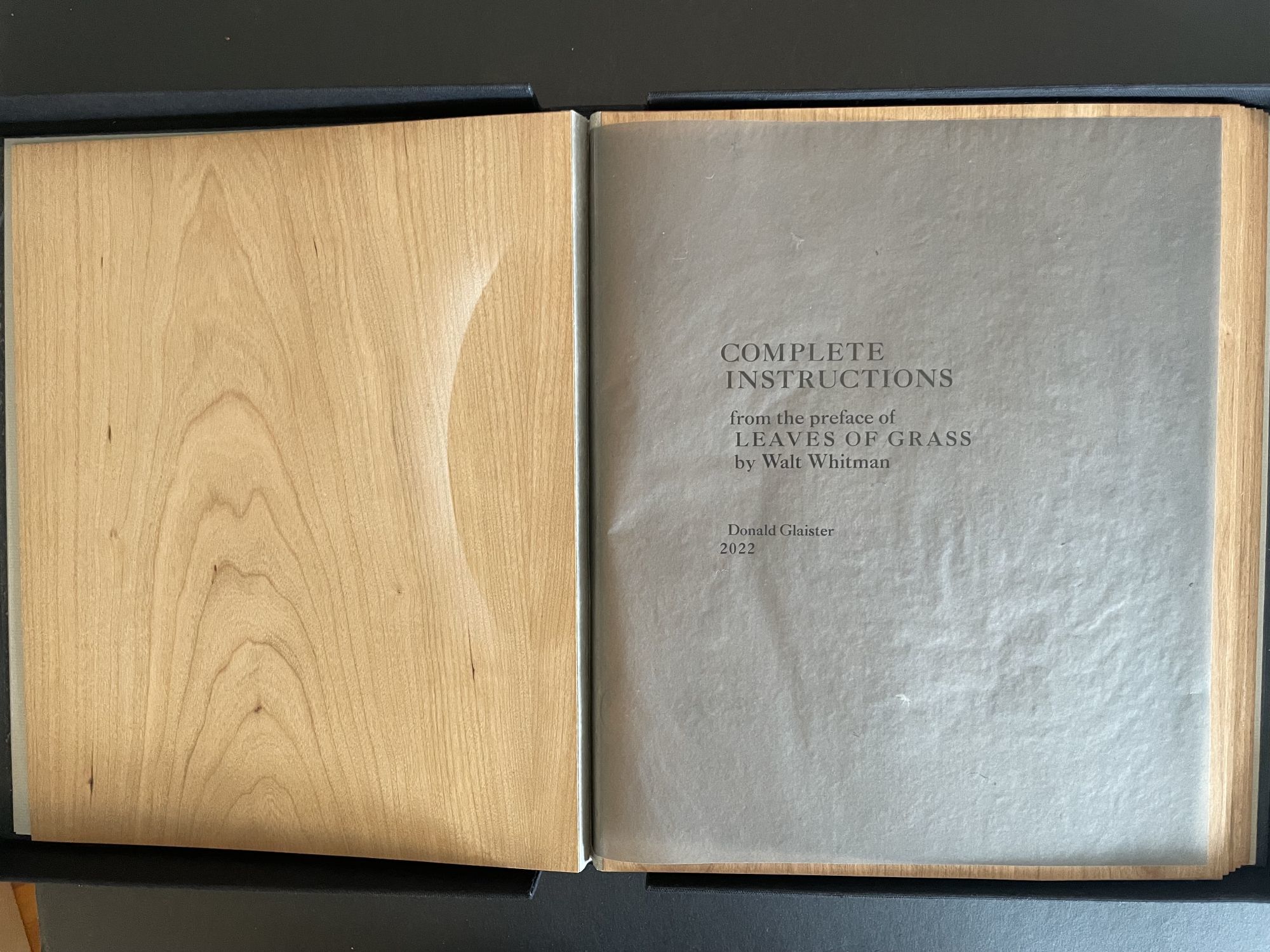 Tucson, AZ: Foolsgold Studio, 2022. Limited Edition. Hardcover. Fine. Limited Edition. Hardcover. "The text is taken directly from the Preface, intact without breaks or rearrangement. Complete Instructions is conceived, edited and produced as a response to social and political American life in the early 21st century, with guidance by Walt Whitman from the middle of the 19th century. The visual concepts, materials and techniques developed and employed in the edition are primarily of our time, while acknowledging the time, vision, genius and humanity of Whitman. Each page of text is followed by a page spread which visually relates to that text, then the next page of text, visual page spread and so on. Complete Instructions is designed and produced by Donald Glaister. Letterpress printing was done by Jessica Spring at Springtide Press, the abaca paper was made by Tom Balbo at the Morgan Conservatory. Suzanne Moore gave invaluable consultation and guidance and Camille Botelho offered her skilled hands and eyes." [artist statement]. Tight, bright, and unmarred. Black leather binding with onlays, cherry veneer wooden pages, collages of paper, metals, Mylar, and acrylic paint. Small fo. np. Edition of 15 variants, 1 deluxe artist's proof variant, 1 prototype, and 1 variant saved for fine binding, this being number 4.