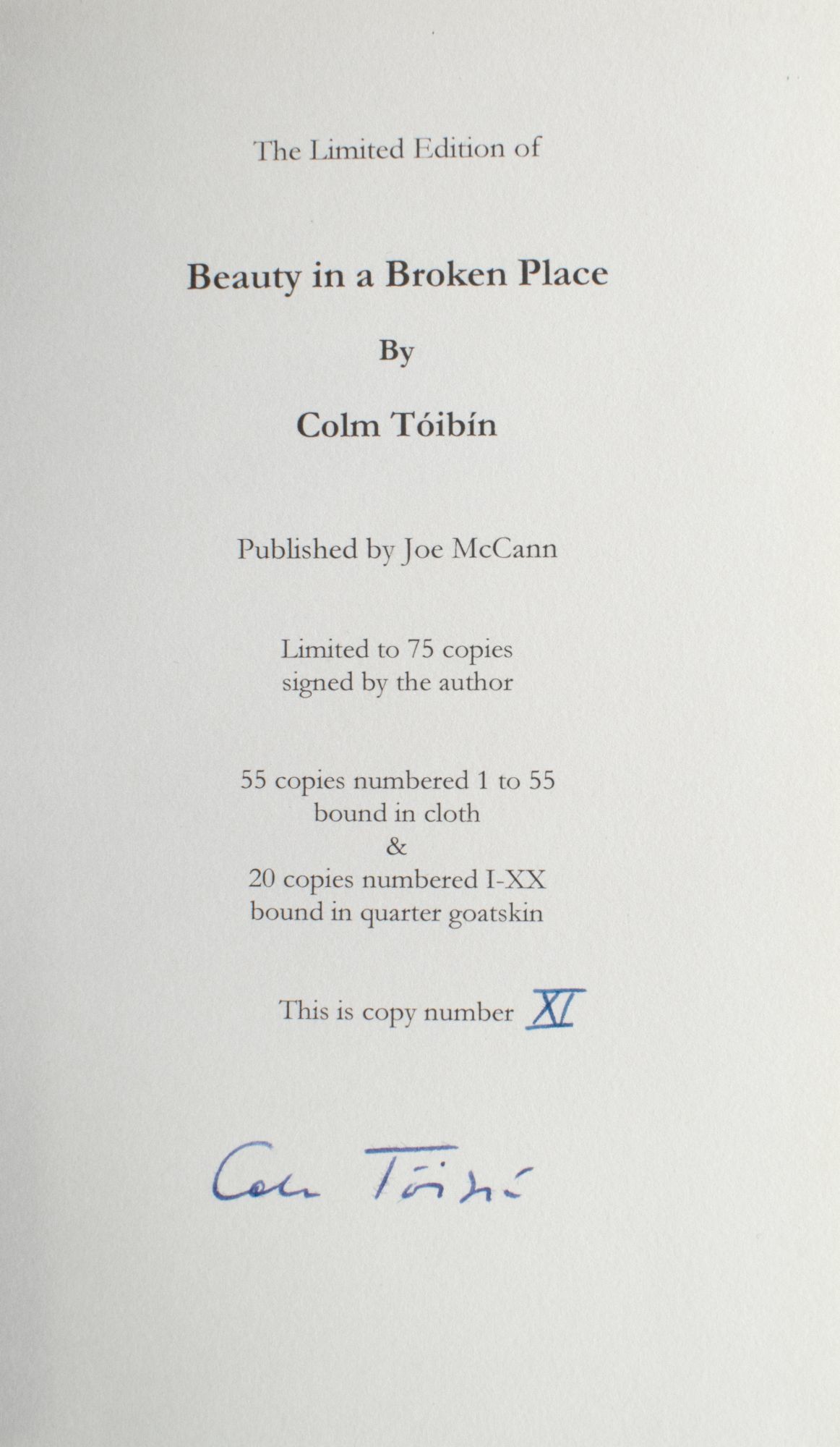Dublin: The Lilliput Press, 2004. First edition, deluxe signed issue, no. XI of 20 copies, from an edition of 75 signed copies (55 in cloth), published by Joe McCann, simultaneous with the trade issue from the Lilliput Press. [ii], vii, 77 pp. 1 vols. 8vo. Quarter goatskin and black cloth. A fine copy, issued without dust jacket. First edition, deluxe signed issue, no. XI of 20 copies, from an edition of 75 signed copies (55 in cloth), published by Joe McCann, simultaneous with the trade issue from the Lilliput Press. [ii], vii, 77 pp. 1 vols. 8vo. A play by Colm Toibin, whose first book, Walking Along the Border, was published by Macdonald in 1987. His novel of Irish immigrant life, Brooklyn (2009), was filmed in 2015.