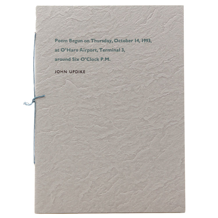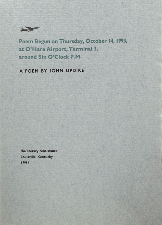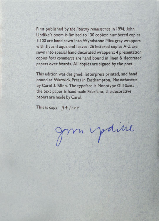 Louisville, Kentucky: the literary renaissance, 1994. First edition, pamphlet issue [also issued in broadside format]; pamphlet issue [containing a printed dedication by John Updike], limited to 100 numbered copies, signed by John Updike [also issued as a broadside, without a printed dedication]. 10pp. Designed, printed, and hand bound by Carol J. Blinn. 12mo. Printed gray wrappers. A fine copy. First edition, pamphlet issue [also issued in broadside format]; pamphlet issue [containing a printed dedication by John Updike], limited to 100 numbered copies, signed by John Updike [also issued as a broadside, without a printed dedication]. 10pp. Designed, printed, and hand bound by Carol J. Blinn. 12mo. Nicely printed at The Warwick Press.