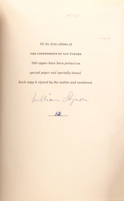 New York: Random House, 1967. First edition, signed issue, limited to 500 numbered copies, printed on special paper and specially bound, signed by William Styron. 428, [2]pp. Spine lightly faded (as usual, as red cloth is prone to fading), else a fine copy in publisher's slipcase box. Box has started to split at bottom edge, with wear at two corners, else very good. First edition, signed issue, limited to 500 numbered copies, printed on special paper and specially bound, signed by William Styron. 428, [2]pp. Winner of the Pulitzer Prize for Fiction.
