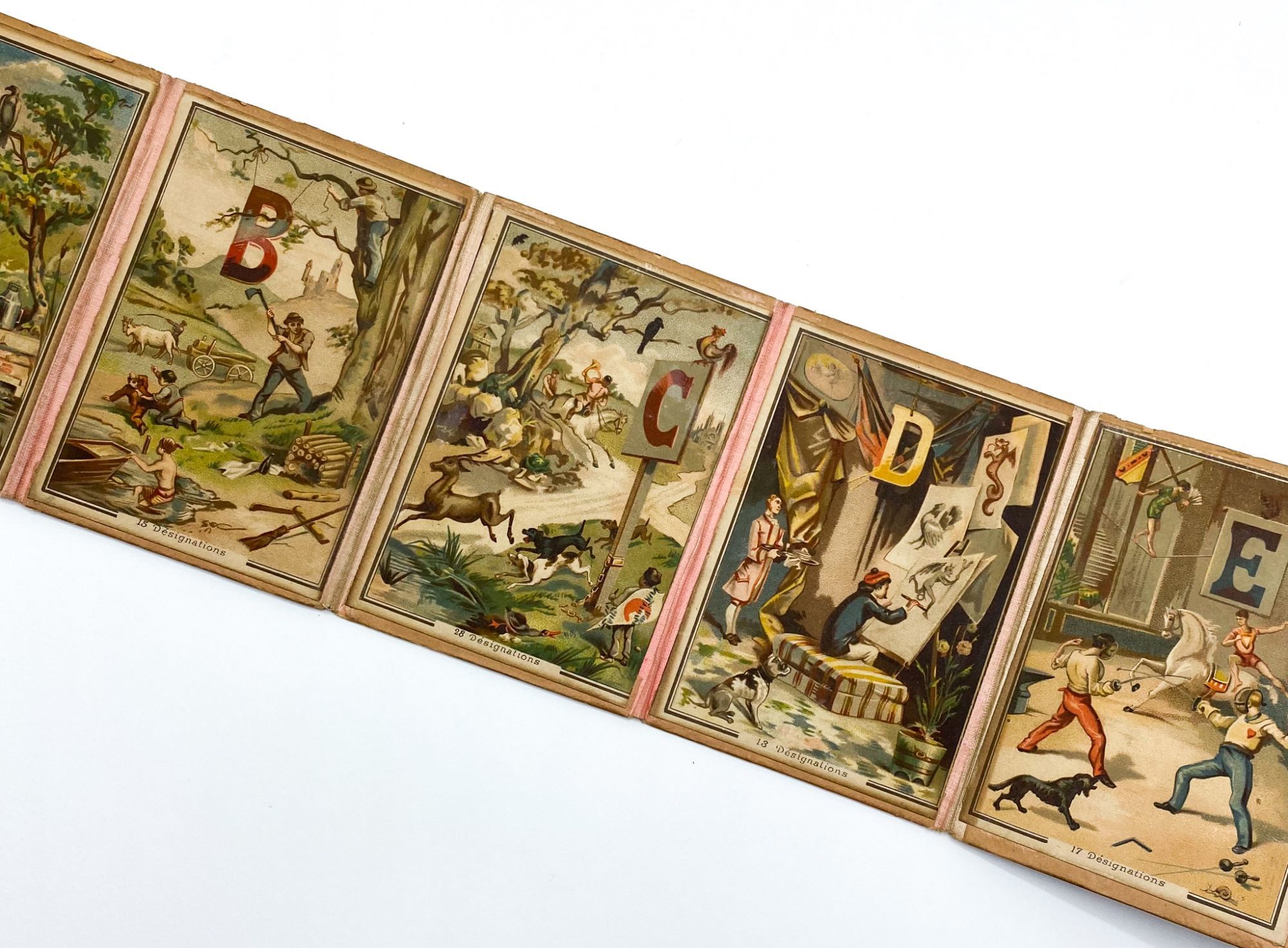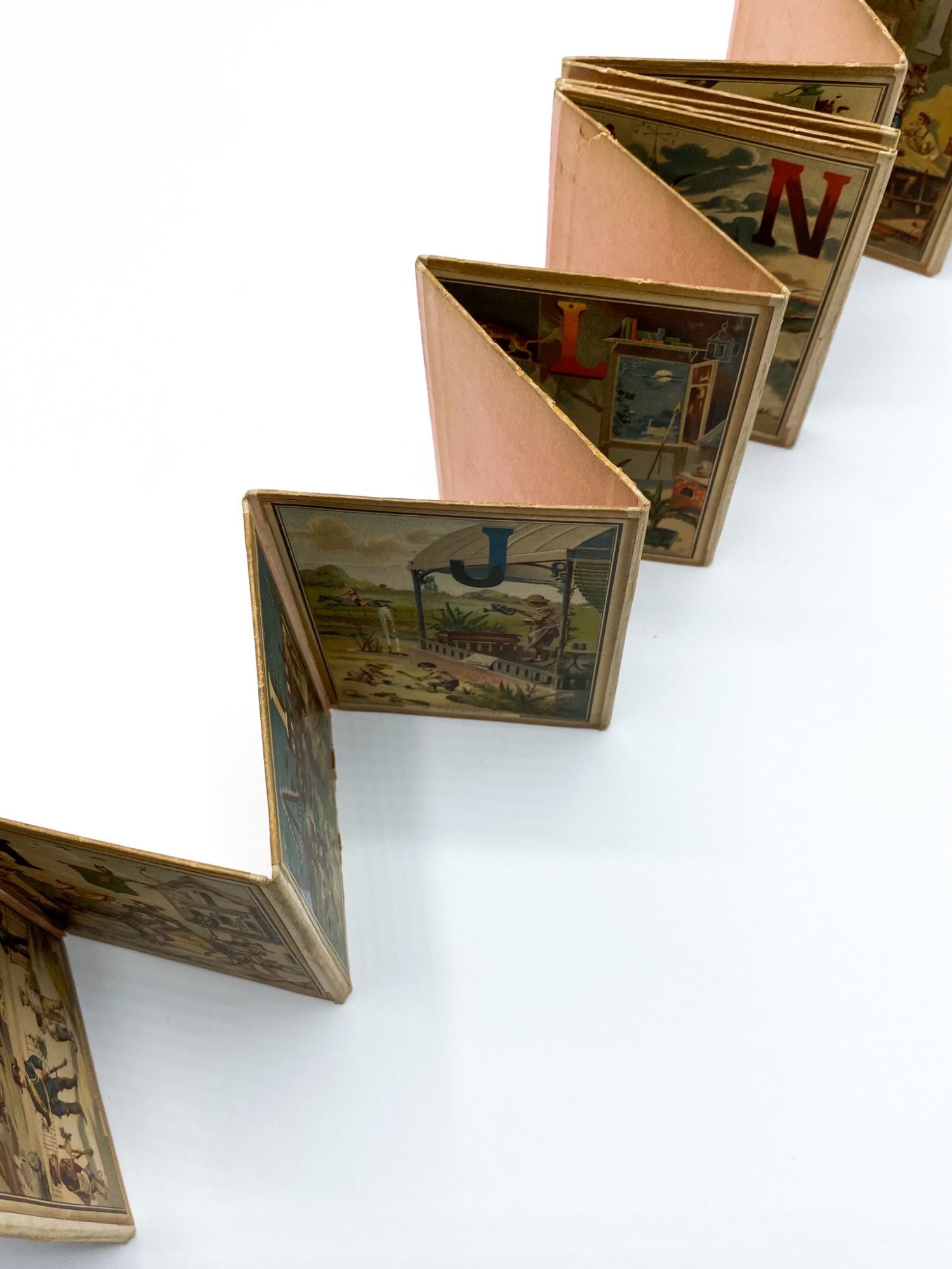 This is a scarce example of this clever learning tool. We find no holdings of this specific panorama on OCLC or in the Cotsen Library. 4.75'' x 79.75'' (unfolded); 4.75'' x 3.25'' (folded). Contemporary stiff paper boards with tipped-on chromolithographs, connected by pink cloth concertina-style. [24] color panels, printed one side only (no W or Z, as issued). Some toning to front and rear boards, some edgewear; occasional careful glue infills. 1" closed tear to M, S with the beginning of a crack. Colors vibrant.