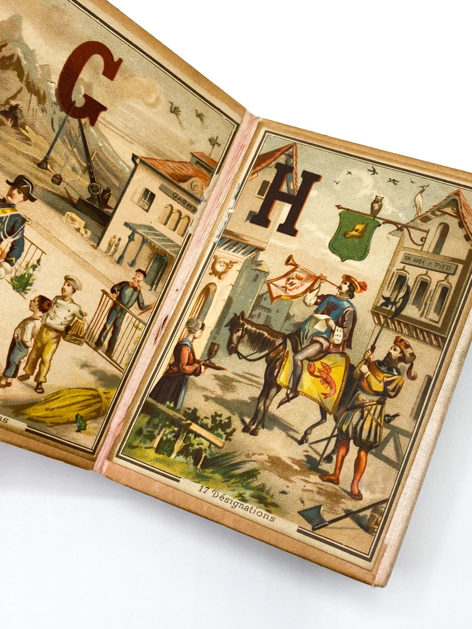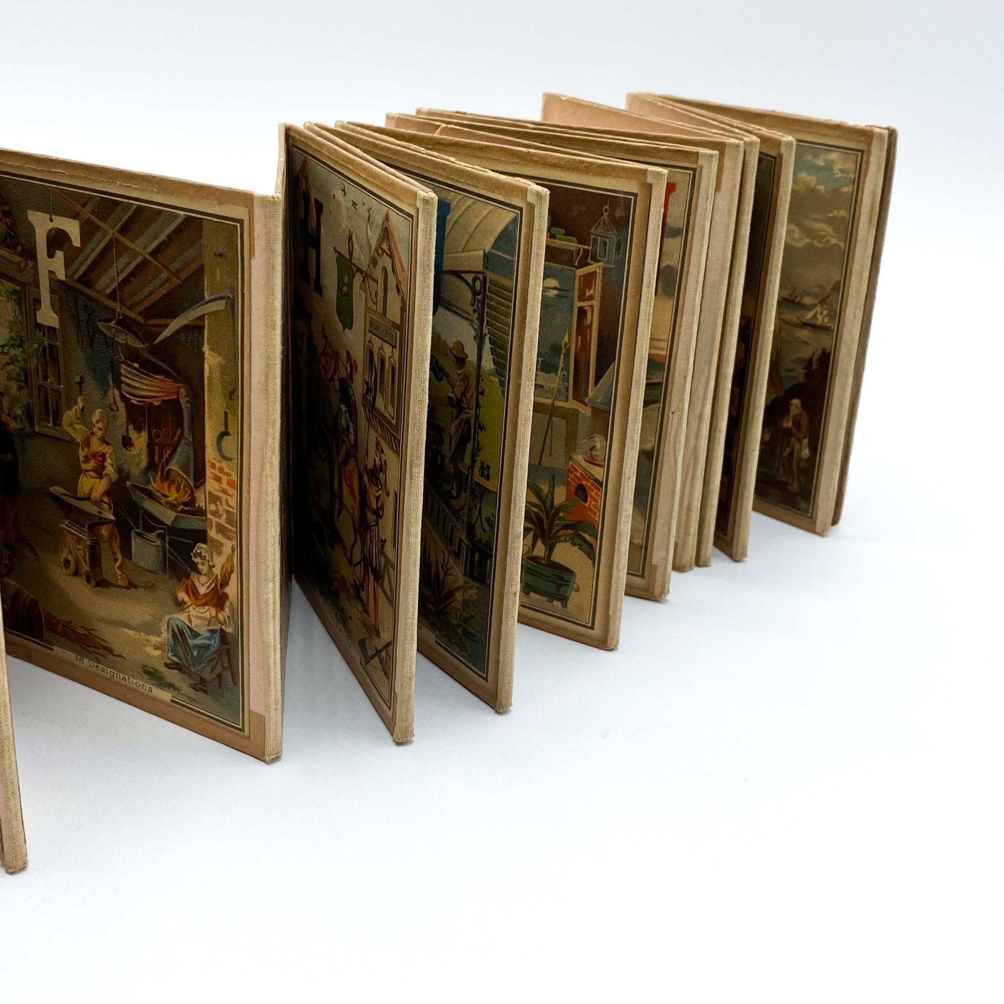 [France]: n.p., 1870. Very good.. First edition of this delightful and detailed French panorama alphabet — each panel is its own game, with a number of hidden objects beginning with the featured letter. Since the days of the hornbook, publishers have striven to make learning the alphabet entertaining for children. With the advent of cheaper color printing, publishers had more tools at their disposal than ever before. This vibrant alphabet panorama is an eye-catching example of the beautiful effect that can be achieved with this technological improvement. But this alphabet offers another level of engagement: the book's designers built an I SPY-like game into every letter panel, hiding a number of objects beginning with that letter for children readers to find. They (understandably) struggled with the letter X, which has only three objects, but had a grand old time with P, which has a whopping 38 objects.