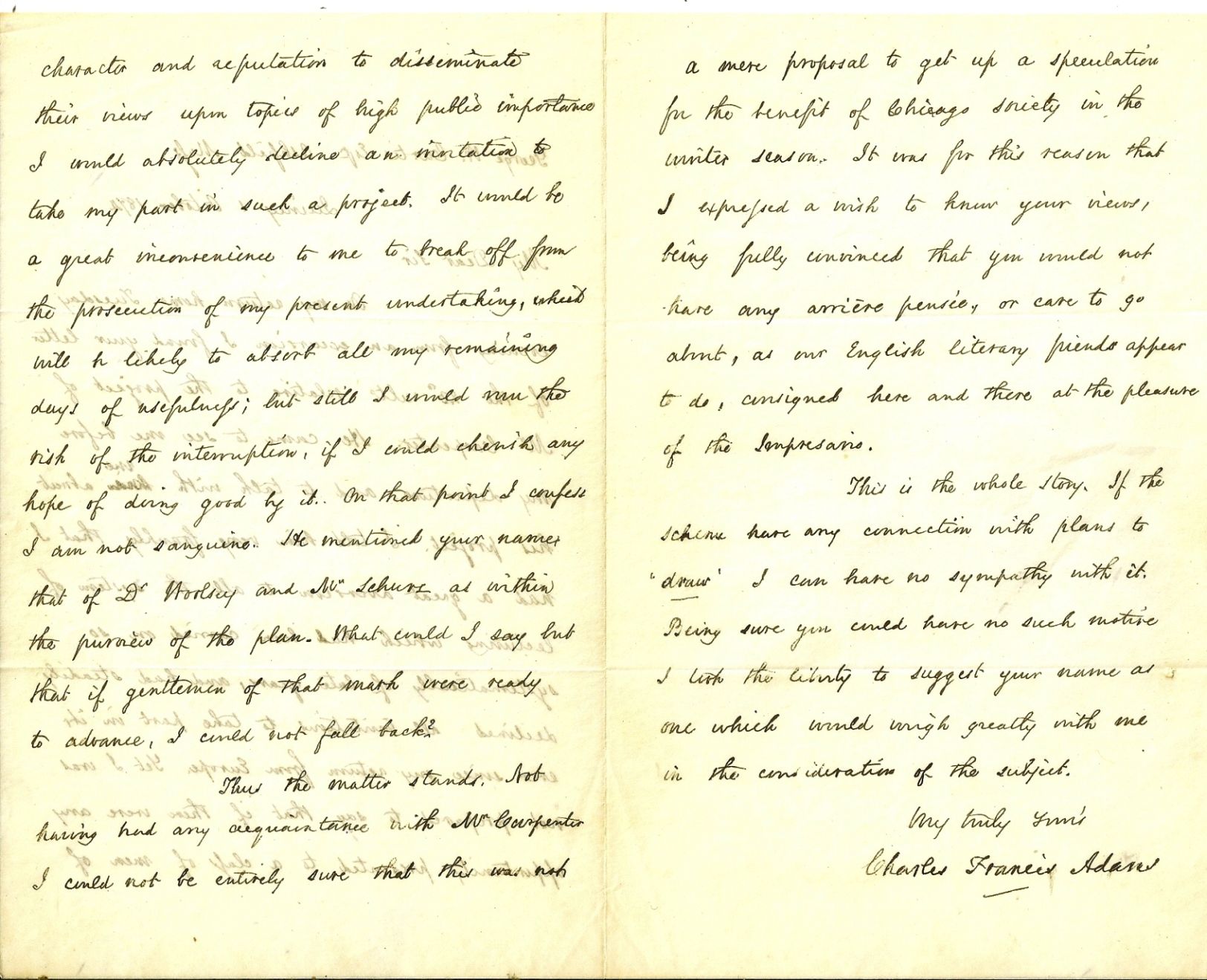 Quincy [MA], 1 October 1874. Letter. Near Fine. Three-page letter on both sides of a 10" x 8" sheet to author and editor George W. Curtis responding about a series of lectures being organized by a man named Carpenter. Adams says he has an aversion "to all the system of lecturing which had been carried on so systematically of later years.... It would be a great inconvenience to me to break off from the prosecution of my present undertaking, which will be likely to absorb all my remaining days of usefulness.... He mentioned your name, that of Dr. Woolsey and Mr. Schurz as within the perview of the plan. What could I say but that if gentlemen of that mark were ready to advance, I could not fall back?" Curtis, editor of HARPER'S WEEKLY during the Civil War years and one of the most influential American journalists of any day, also was known for his speeches, one of which was a tribute to Charles Sumner. Curtis also had the honor of helping Thoreau build his cabin on Walden Pond. Fine letter from one important American figure to another.