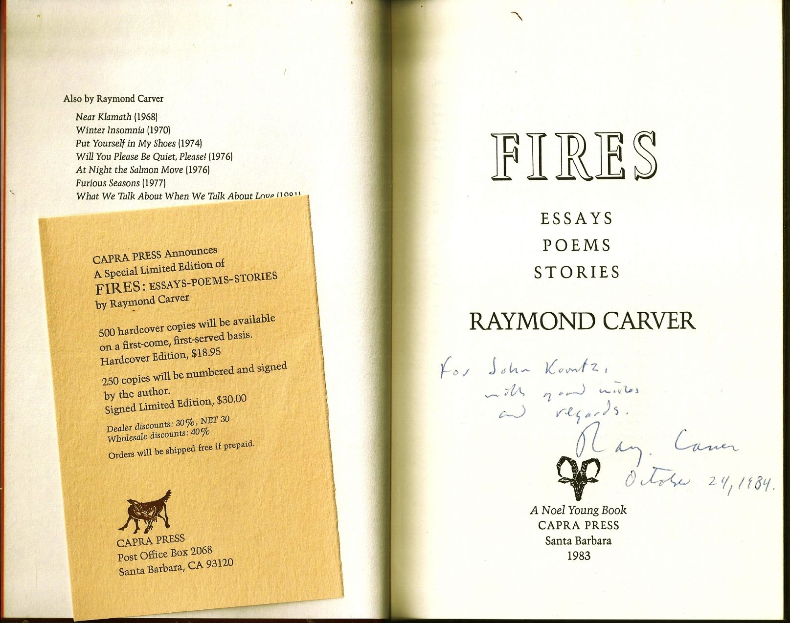 Santa Barbara: Capra Press, 1983. First Edition. Hardcover. Fine in original glassine. Copy #179 of 250 numbered copies in red boards SIGNED by Carver of this superb collection containing the title essay as well as his essay "On Writing," along with 50 poems and 7 stories, including "So Much Water So Close to Home," which figured prominently in Robert Altman's film SHORT CUTS. In addition this copy is INSCRIBED and SIGNED by the author on the title page: "For John Koontz/with good wishes/and regards/Ray Carver/October 24, 1984." Koontz was a co-publisher with Bert Babcock of small press publications by modern authors including Carver's MY FATHER'S LIFE. He also wrote a review of REMEMBERING RAY (1993) that was published in WESTERN AMERICAN LITERATURE, Vol. 29, No. 2 (Summer 1994), page 179. An uncommon book to find inscribed.
