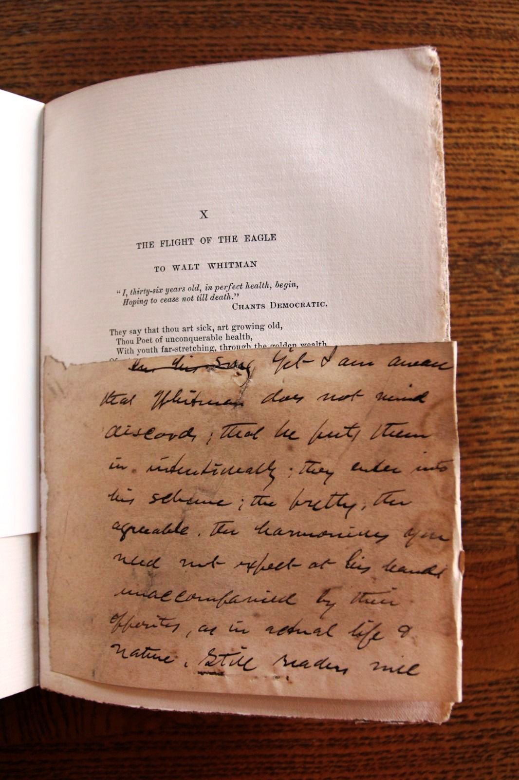 Boston: Houghton, Mifflin and Company, 1895 - 1913. First Edition. Hardcover. Two of the volumes have dampstaining, especially heavy to Vol. XVII, but the manuscript material is largely unaffected. Rubbing and sunning to the volumes. Manuscript material Very Good or better; the volumes Good to Very Good. Green cloth decorated and lettered in gilt. Several odd volumes from the Riverside Edition of THE WRITINGS OF JOHN BURROUGHS, limited to 1000 copies. Each volume has tipped or laid in MANUSCRIPT Material or Letters. Volume I contains a TYPED LETTER SIGNED by the publisher to Charles N. Elliot dated 1896 describing the publication of the set. This volume is SIGNED by Elliot on the title page. Volume III has tipped in a brief handwritten MANUSCRIPT ink segment by Burroughs of about 50 words that begins "Yet I am aware that Whitman does not mind discord...." It is tipped in at the beginning of his chapter on Whitman titled "The Flight of the Eagle." Laid in loosely in Volume VII is a handwritten MANUSCRIPT ink page on the voice of the critic. Tipped in to Volume XV is a 1912 TYPED LETTER SIGNED by Burroughs to Elliot thanking him for his birthday wishes that found him "in good health and enjoying life as much as ever," and also thanking him for photographs of Maurice Bucke who became one of Whitman's most devoted friends and supporters in the poet's later years. Volume XVII has a 3-1/2 page AUTOGRAPH MANUSCRIPT SIGNED in pencil by Burroughs tipped in where the text occurs in the essay "The Hit-And-Miss Method of Nature" in the book THE SUMMIT OF THE YEARS. In addition to the material by Burroughs, Elliot has made several small bibliographical notes in the volumes. Three additional volumes from this set are included making a total of 8 volumes.