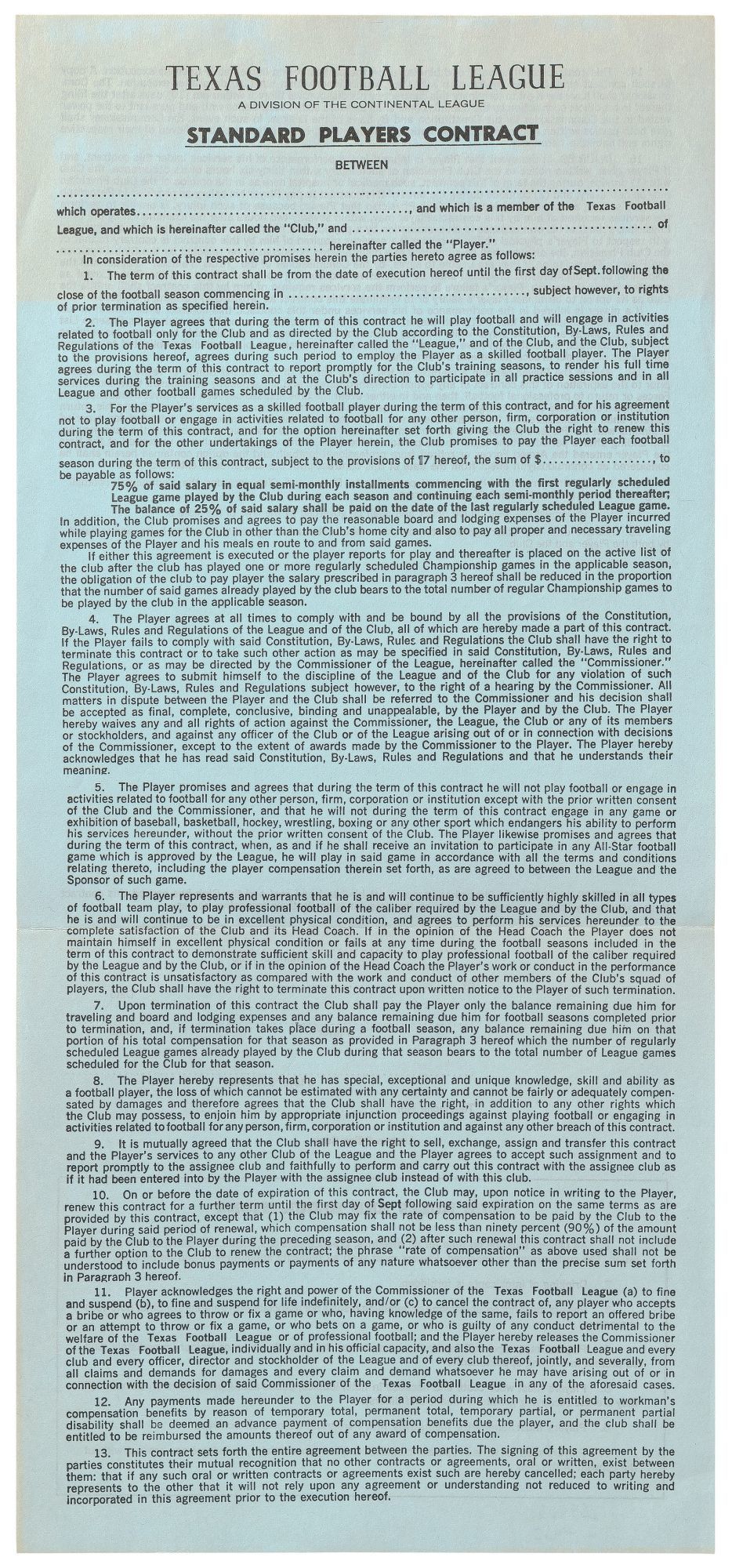[no place]: Texas Football League, 1969.  Unbound. Fine.  Unused contract. Measuring approximately 8¼" x 18". Old horizontal fold, likely as issued, and a bit of very faint toning along the top else fine. The Texas Football League, which initially comprised six franchises from Texas and Oklahoma, was announced in May 1966. The TFL expanded to two four-team divisions in 1967. In January, 1969 it was announced that the Continental Football League was adding the entirety of the eight-team TFL to its league as a separate entity, composed of the East and West Texas Divisions, which also included the Mexico Golden Aztecs of Monterrey, Mexico (to date, only team from Mexico to play in a professional American football league). The league began losing teams in late 1969 and the Continental Football League was effectively ended in July 1970. The 19-point contract, unused and with no financial information printed, also features a 7-point "Club Rules and Regulations" mandating, among other things, no alcohol, no entering gambling houses or associating with "gamblers or other notorious characters," and the wearing of coats and neckties in hotel lobbies, while eating in public, and on all trains "(if they are not occupying private pullmans and diners)."