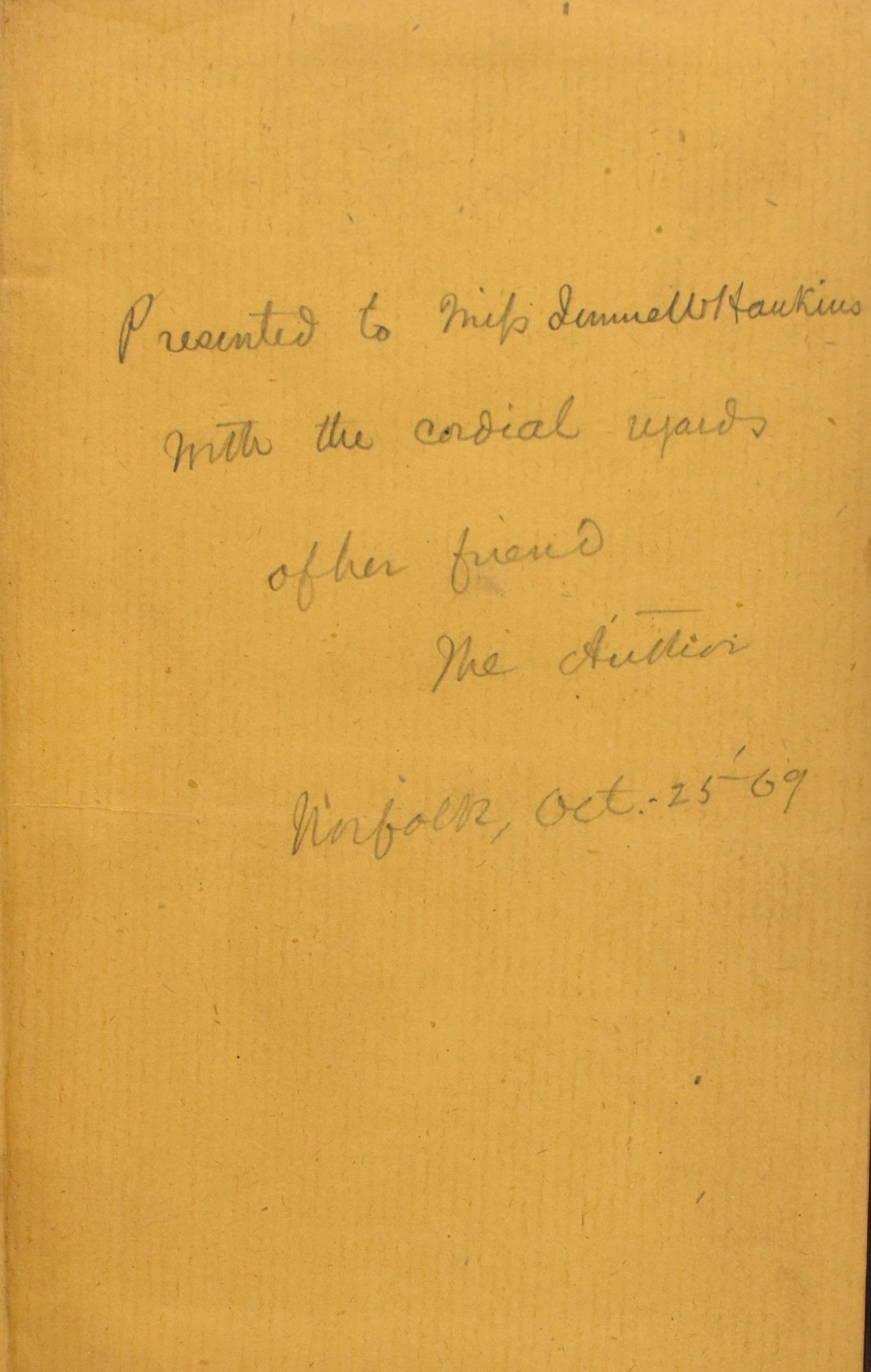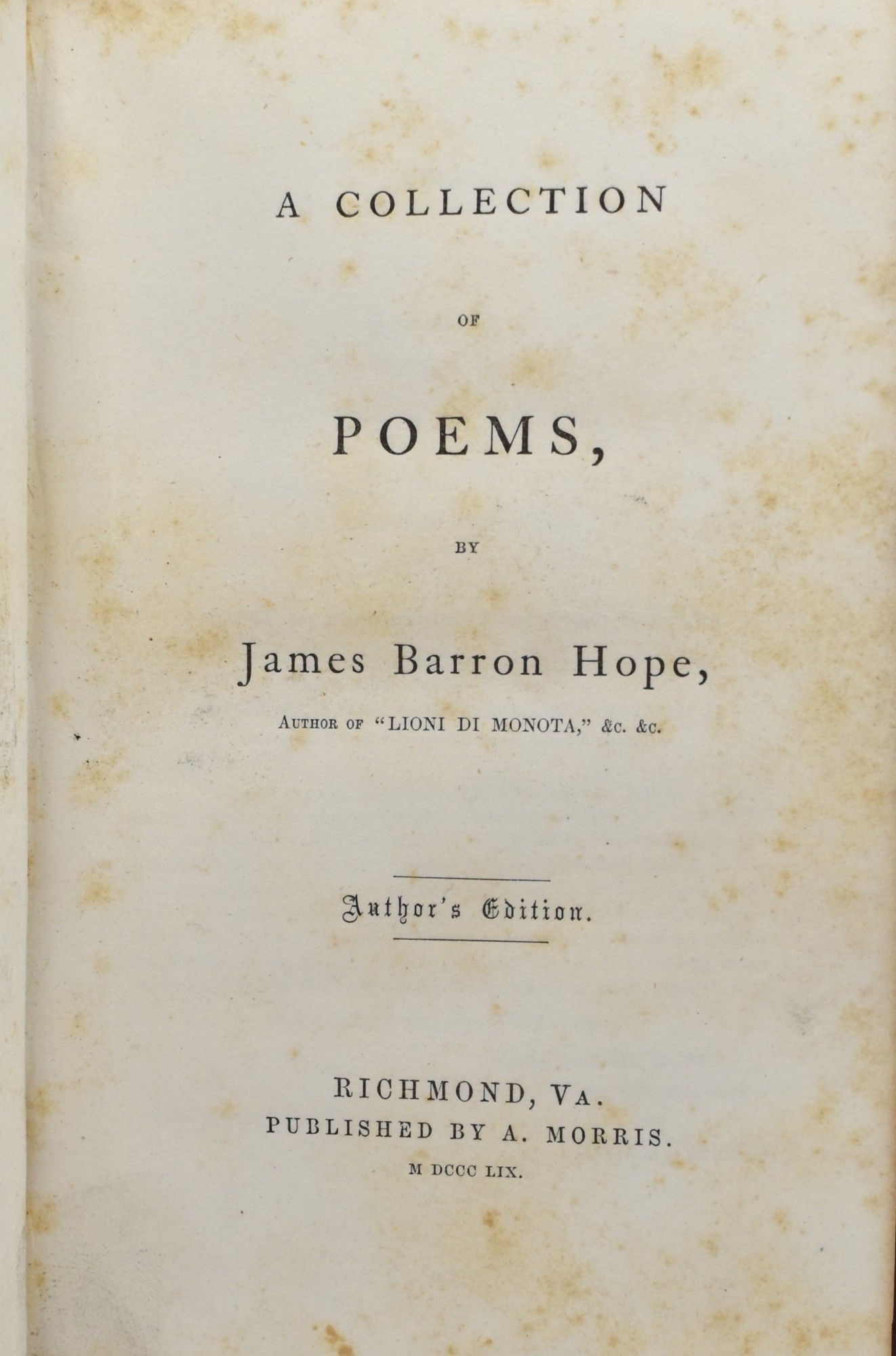 Richmond, Va: A. Morris, 1859. Author's Edition. Hard Cover. Very Good binding. 12mo.; in the publisher's brown embossed cloth; [i-viii], ix, [x], xi-xii, [2], [15], 16-139, [140] [4] pages; with a pencilled inscription by the author: "Presented to Miss Jennie W. Hawkins | with the cordial regards | of her friend | the Author | Norfolk, Oct. 25, ‘69".~~Poetry by the journalist, poet, and veteran of the Civil War, James Barron Hope. The poet enjoyed high popularity during his lifetime, even becoming the Poet Laureate of Virginia, though his fame has not lasted to the modern day. This being his poetic addresses given before various celebrations, and other miscellaneous poems; "Poem recited at the base of Crawford's Equestrian Statue of Washington, on the Capital Square, in Richmond"; "Poem recited on the Two Hundred and Fiftieth Anniversary of the English Settlement at Jamestown"; "Poem pronounced before the Phi Beta Kappa Society and Graduating Classes of William and Mary College,...1858". (Cullen S. Pitt "James Barron Hope: Virginia's Poet-Laureate" https://scholarship.richmond.edu/cgi/viewcontent.cgi?article=2272&context=masters-theses). Very Good binding.