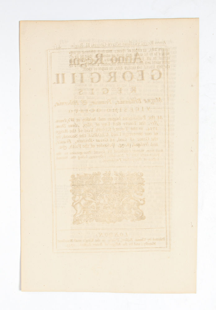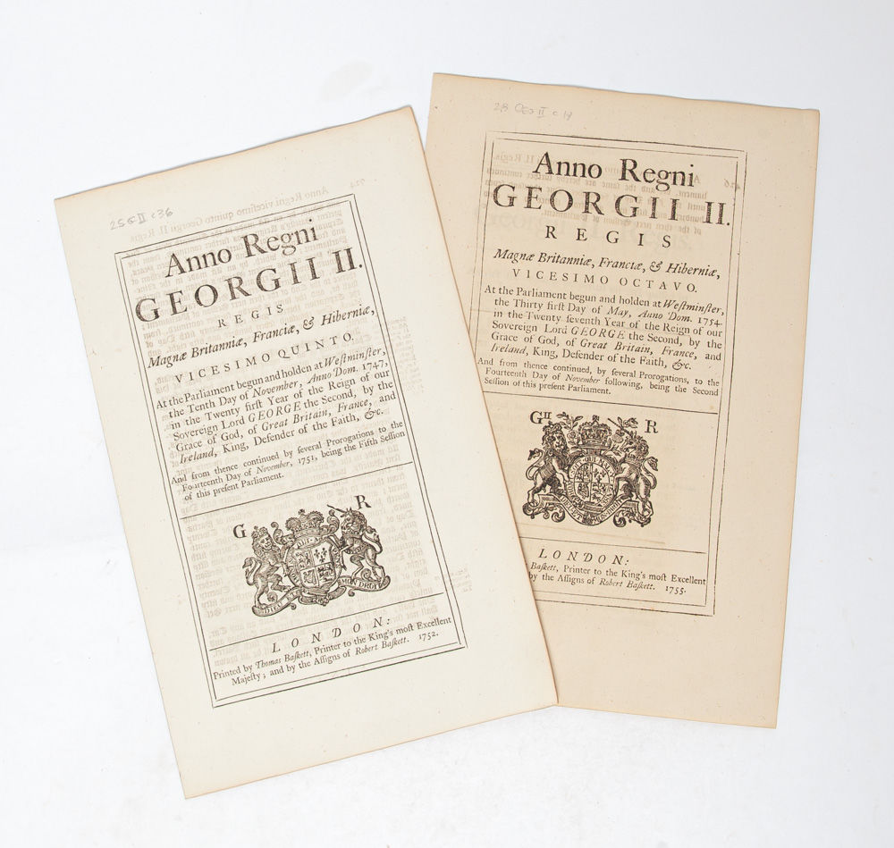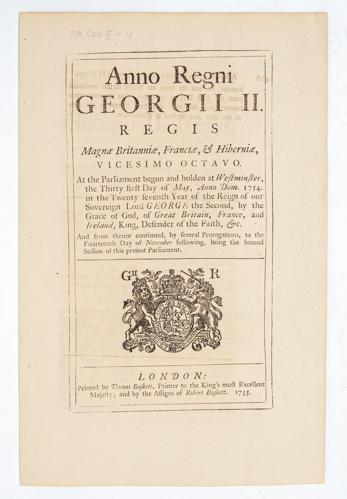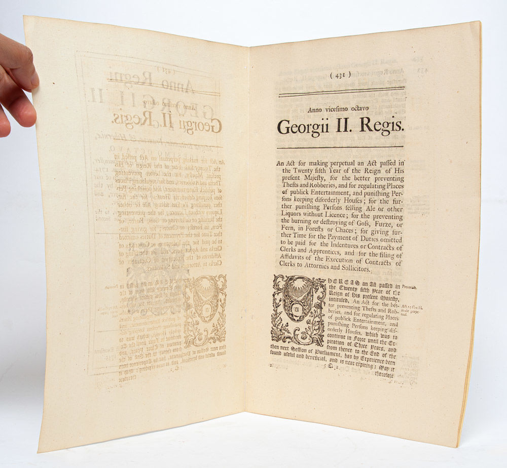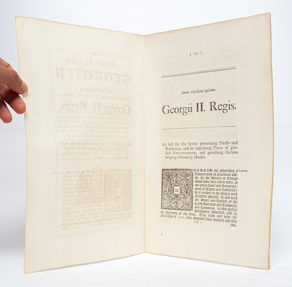 [Together with] An Act for Making Perpetual An Act...for the Better Preventing of Thefts and Robberies... London: Thomas Baskett and the Assigns of Robert Baskett, 1755. First edition. 28 George II, Chapter 19. Measuring 300 x 195mm and collating complete: [2], 431-435, [1, blank]. A Fine copy without toning or wear, of a scarce Act making the 1752 "Disorderly Houses Act" perpetual. ESTC reports only 3 institutionally preserved copies (of these, 1 in North America); and this is the only copy on the market.