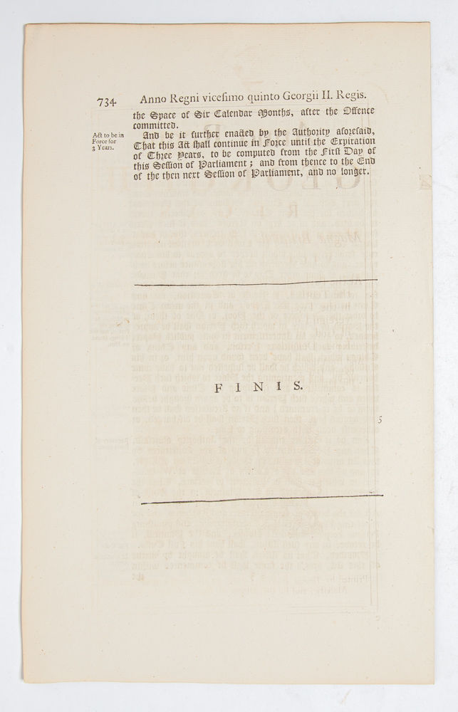 London: Thomas Baskett and the Assigns of Robert Baskett, 1752. First edition. 25 George II, Chapter 3. Measuring 300 x 185mm and collating complete: [2], 727-734. A copy in Fine condition, fresh and unmarked, of a legal act licensing citizens of London to report on brothel employees and owners for a bounty; ESTC reports only 3 surviving copies in libraries, with the present being the only example on the market.