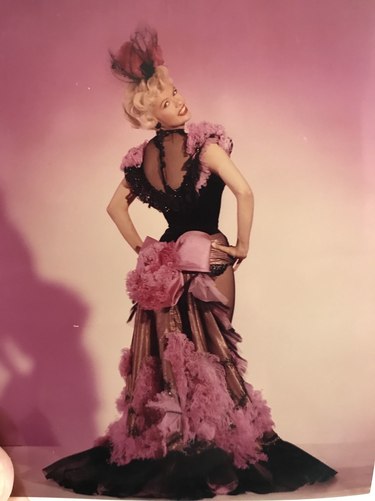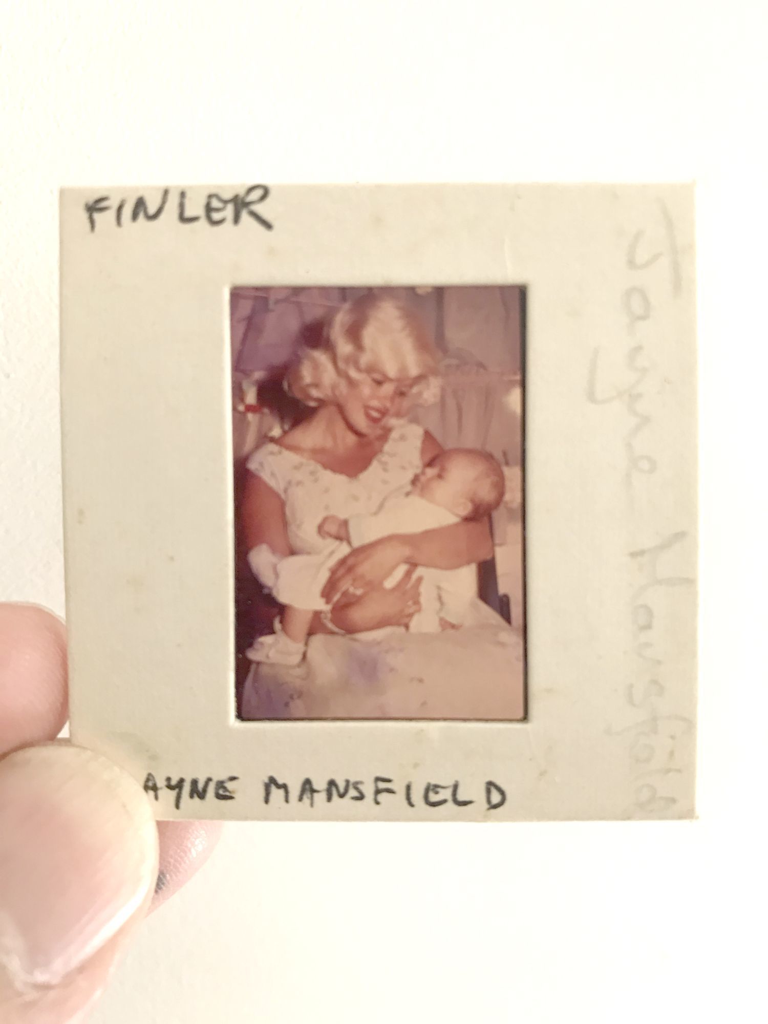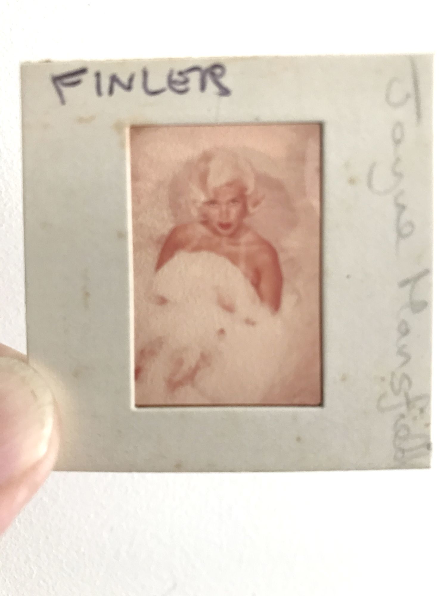 One negative shows Mansfield holding her infant son Miklós Jeffrey Palmer Hargitay, the eldest of three children Mansfield would have with her second husband, Mickey Hargitay. Another negative shows Mansfield seemingly naked under a fur-lined white blanket. The other two negatives show Mansfield in a costume from "The Sheriff of Fractured Jaw," sporting a black corset top and bikini bottoms with a pink feather headpiece and flounced bustle.