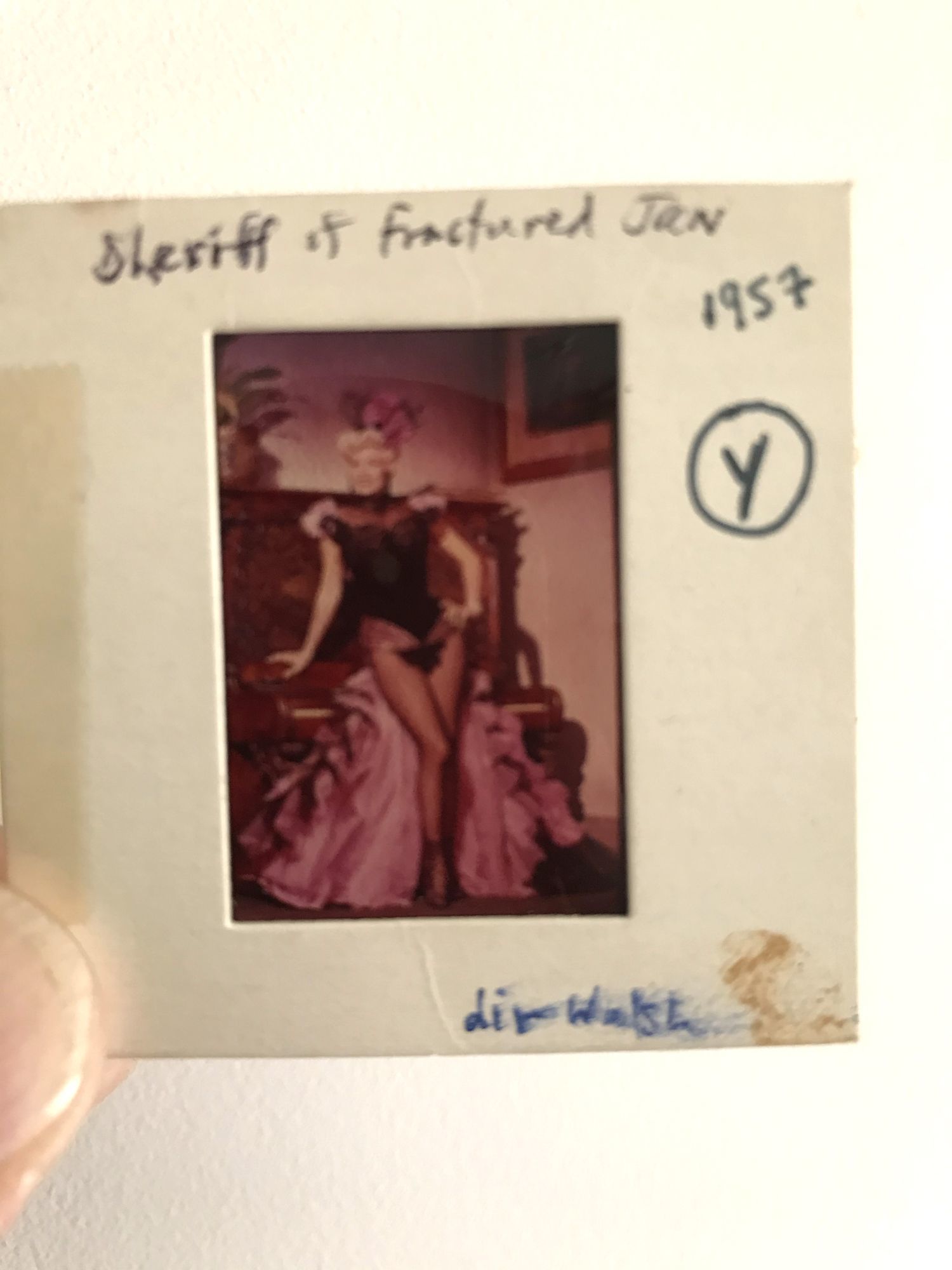 N.p.: N.p., 1958. Archive of four vintage photo negatives of actress Jayne Mansfield. One negative with the year "1957" in manuscript ink annotation on the margin of the sleeve, along with the name of the film "The Sheriff of Fractured Jaw," a Western film in which Mansfield starred.