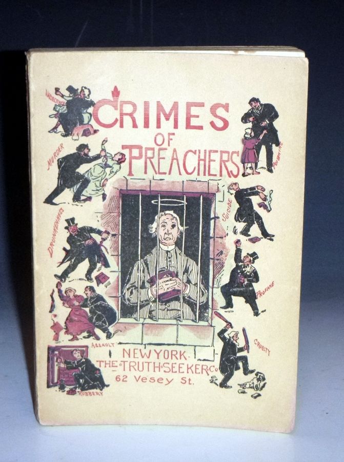 New York, Nd(ca.1914): Truth Seekers. Small Octavo. 227(1) pp. 10th edition, last and most complete edition. While most public sins recorded here, over 2,000 are of authenticated sins of adultery or sex by pastors or priests of prepubescent girls. There are cases of arson, bigamy, embezzlement, murder, and a host of other crimes. The statistical study shows Methodist ministers in the lead with 728 to the Baptist only 492 with the Catholic priesthood only 325. However, virtually every other kind of denomination is noted here with sordid details. Mark Twain and others took delight in reading these copies, though as is noted here, the vast majority of ministers and priests were never charged with crimes. A near fine copy of a rare item (many copies were read to death though we would presume not from the pulpit). Bound in pictorial paper wraps lettered and decorated in red and black, spine plain, only light wear to spine ends, some foxing to fore-edges. No names or bookplates.
