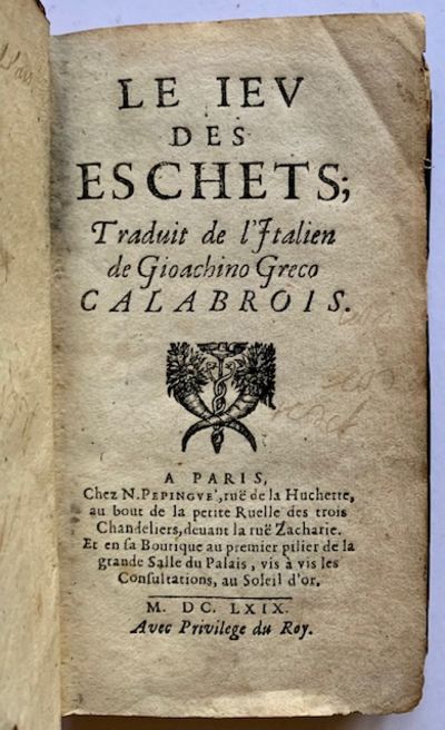 Paris: Chez N. Pepingve (Avec Privilege du Roi), 1669. Full leather. The 1669 1st French edition --and 1st published edition-- of Gioachino Greco's seminal "Le Jeu des Eschets". Greco (c. 1600 - c. 1634) was the strongest player in Europe in the early 17th century and among the first to record entire games, not just particular openings or combinations. His vast influence (as cited by H.J.R. Murray, among other historians of the game) is keenly felt to this day. This copy is likely in its original full-leather binding, certainly in a contemporary-to-the-period binding. Solid and VG, with minor, forgivable wear along the edges and the preliminaries. The interior though is very clean, the pages surprisingly crisp and clean. Originally recorded by hand in Greco's native Italian, here translated --and issued in book form-- for the first time.