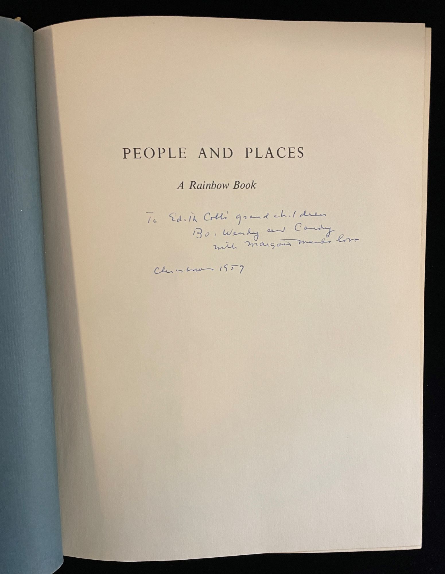 NY: World Publishing, 1959. 1st Edition. Hardcover. Very Good +/Very Good +. Warmly inscribed and dated Christmas 1959 by anthropologist Mead to the grandchildren of author and close friend Edith Cobb, whom Mead met at Columbia University while Cobb was doing graduate studies. Some rubbing to spine largely confined to about an inch square chip at the spine head of dustjacket which has some closed tears here and there. Still a highly presentable item.