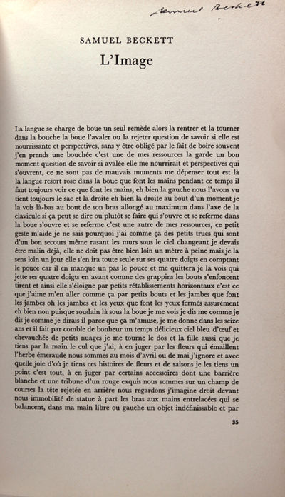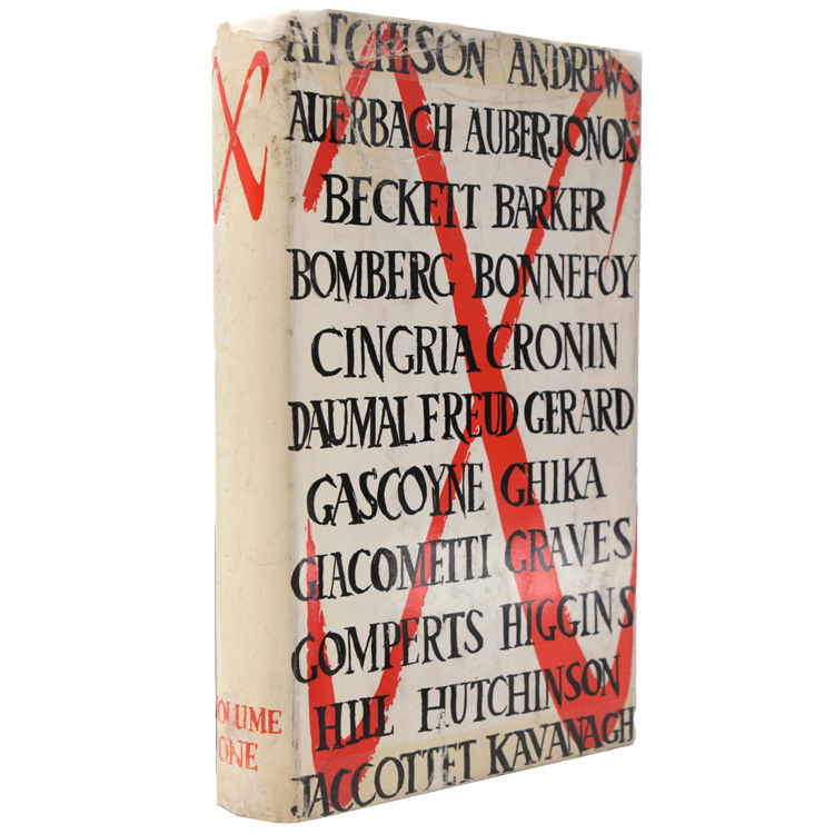 London: Barrie and Rockliff, 1961. First collected edition of Volume One (complete in four issues), limited to 800 copies. Illustrated. 328pp. 4to. Cream boards, with gilt stamped "X" om upper cover. Binding is lightly bumped at crown of spine, covers are lightly tanned at extremities, rear flyleaf lightly creased and tanned, else a very good copy in worn, price-clipped, good dust jacket. The printed dust jacket has two (two-inch) creased tears on front panel (tape mended on verso), spine and extremities lightly soiled, with uneven, moderate chipping at crown of spine and top edge of both panels (with several tape mends on verso), else complete and quite bright. Housed in cloth-covered slipcase box. First collected edition of Volume One (complete in four issues), limited to 800 copies. Illustrated. 328pp. 4to. Signed by Samuel Beckett at his contribution (on page 35 of text, which prints his contribution of "L'Image"), signed at top margin ("Samuel Beckett").