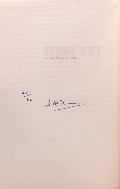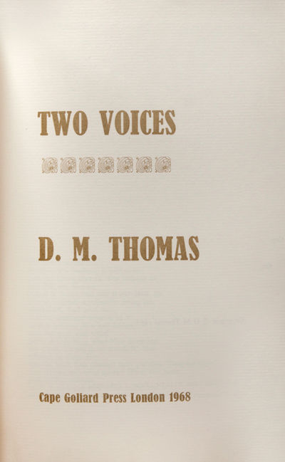 London: Cape Goliard Press, 1968. First edition of author's first separately printed clothbound book [preceded by a pamphlet and an anthology], signed issue--limited to 50 numbered copies signed by D. M. Thomas. A very fine copy, covers virtually as new, in tissue dust jacket. First edition of author's first separately printed clothbound book [preceded by a pamphlet and an anthology], signed issue--limited to 50 numbered copies signed by D. M. Thomas.