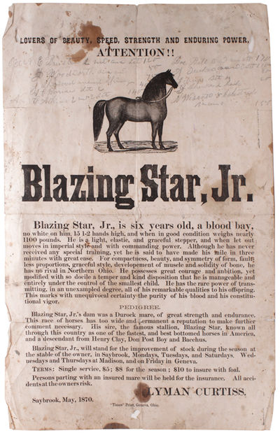 Saybrook: Times" Print, Geneva, Ohio, 1870. Image of horse, 2 headlines, 27 lines of text. 12-1/2 x 19-1/2 inches. Old folds and some wear, with pencil notes on front and all of bacxk. Image of horse, 2 headlines, 27 lines of text. 12-1/2 x 19-1/2 inches.